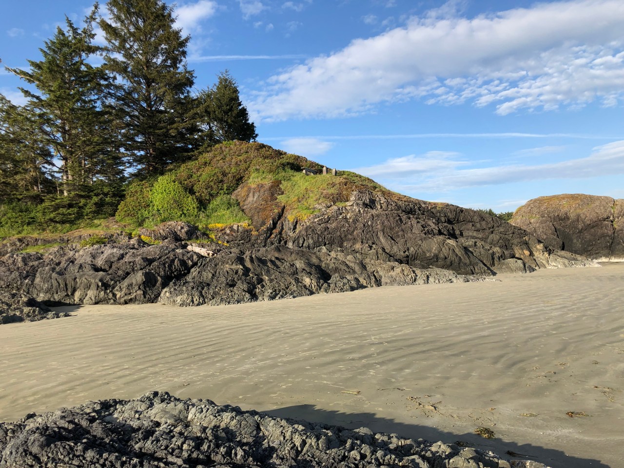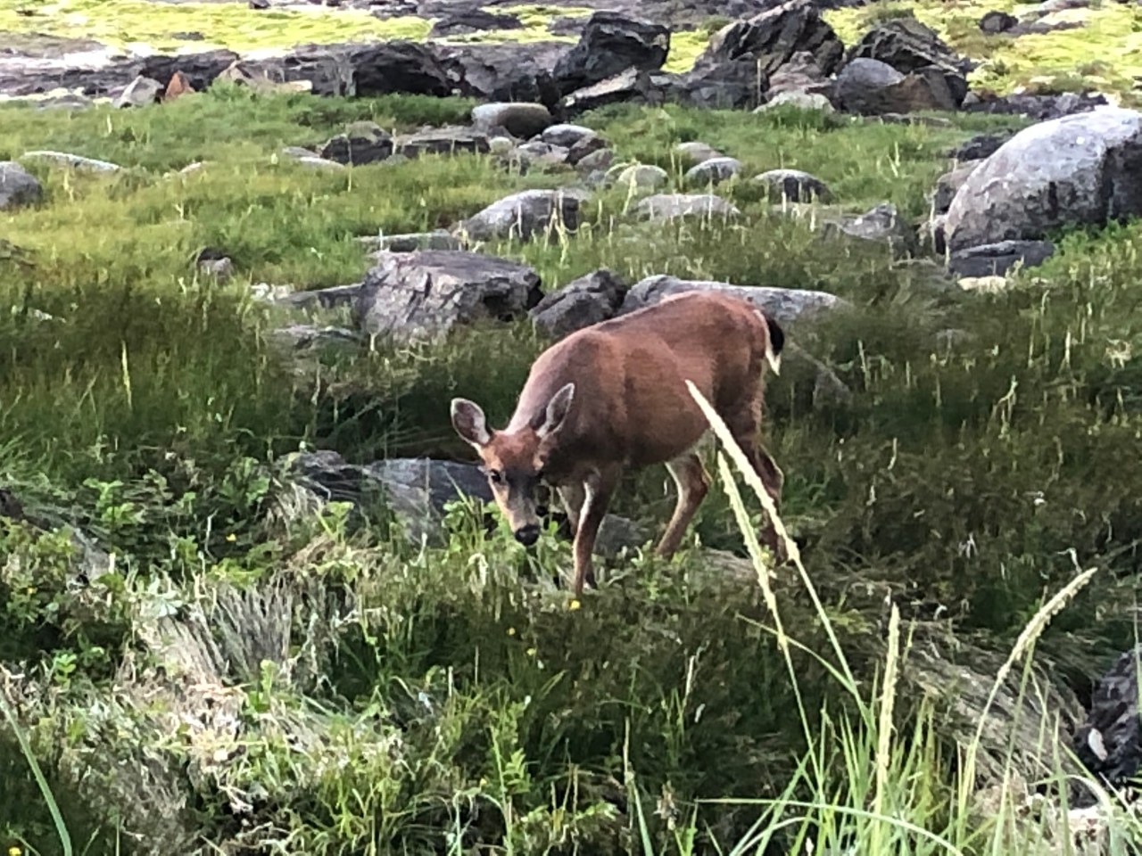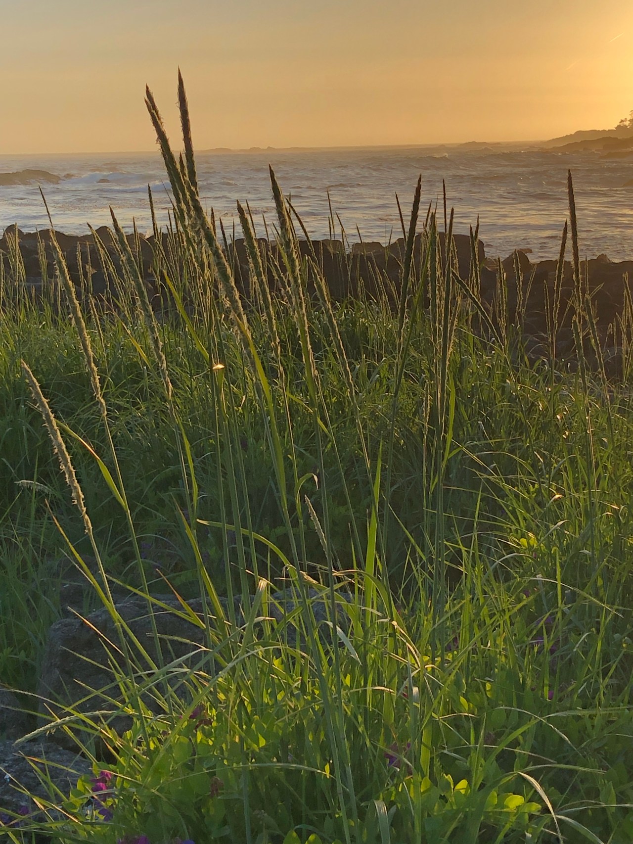 Continuant le chemin on traversait des rigoles, évitant de mettre les pieds dedans et on apercevait des langues de mer enfermées derrière les roches. Le ciel se reflétait dedans et à proximité, des pins tendaient leurs branches vers le ciel comme pour s’y encrer. La mer par endroit s’était laissée enfermée et nous offrait au regard, un petit lac paisible, alors que de l’autre côté des rochers, la mer rugissait et se fracassait, entrainant l’érosion de la nature. On faisait aussi des rencontres incroyables comme ce morceau de bois tout gris, rongé par les vagues et l’écume qui trônait comme une tête d’animal abandonné en cet endroit. Les arbres avaient leurs troncs tout tordus, faisant des circonflexes à l’envers, comme un pommeau arrondi d’une canne. Impressionnant de voir ce tronc tout incurvé ! Et puis au gré de la balade, de hauts roseaux faisaient surface et se dandinaient, tanguaient entre les rochers. On aurait pu se croire en Bretagne sur la côte nord. Mais non, nous étions bien sur l’île de Vancouver, sur la côte pacifique. Les arbres avaient aussi leurs racines tordues accrochées aux rochers et se miraient au coucher du soleil dans ses rayons dardant la côte. Par endroit, des troncs d’arbres faisaient surface, recrachés par la mer. Ils tapissaient un recoin vert, entre des sapins, bouchant un estuaire de la plage. Et puis tout à coup on se trouvait nez à nez avec un wapiti dégustant ses herbes favorites, salées, le moins du monde effrayé par votre présence, continuant à croquer ses fleurs délicieuses. Tranquillement le wapiti suivait son chemin ignorant votre passage.