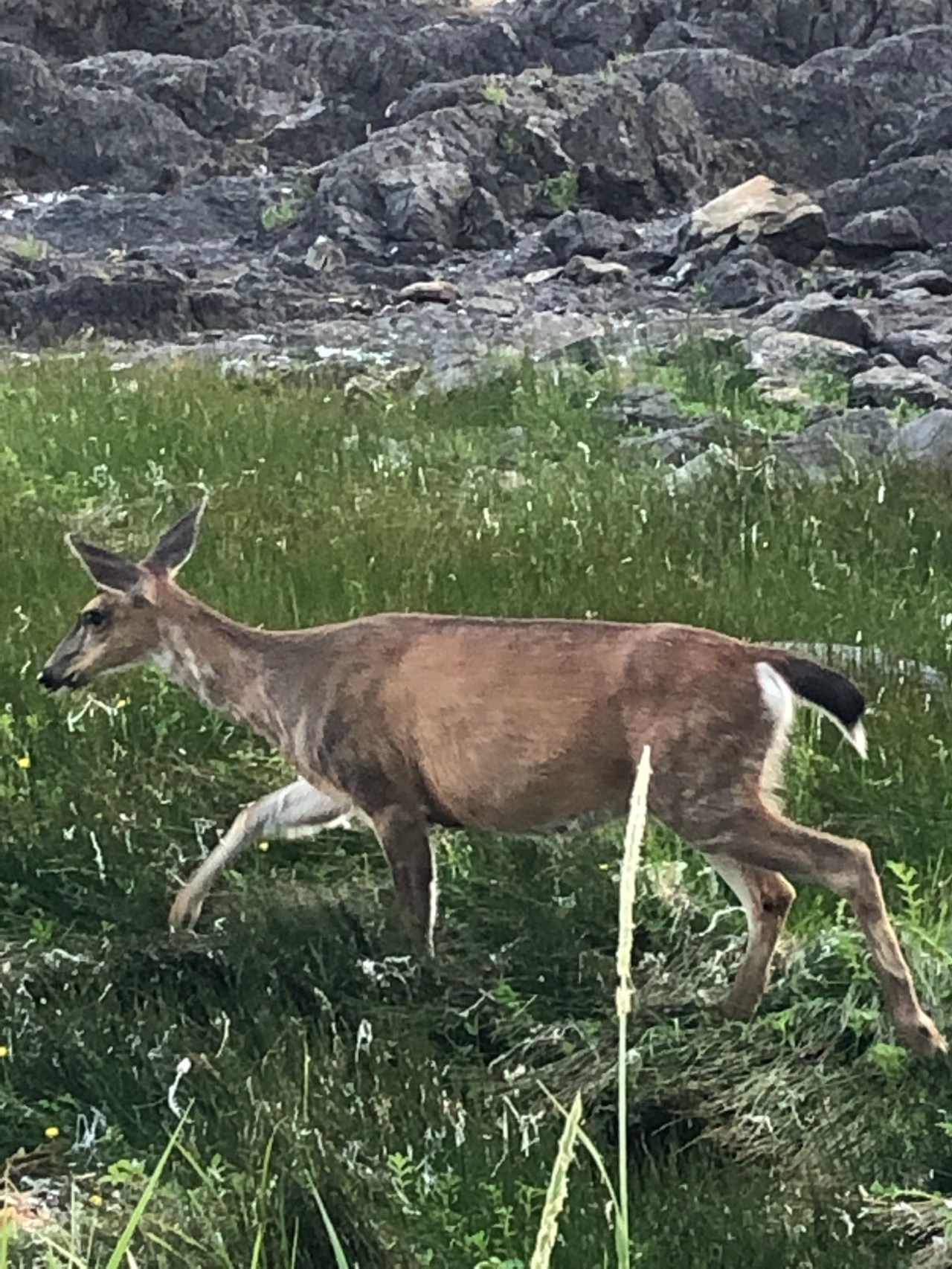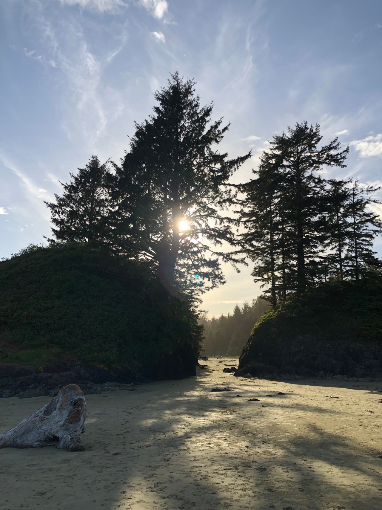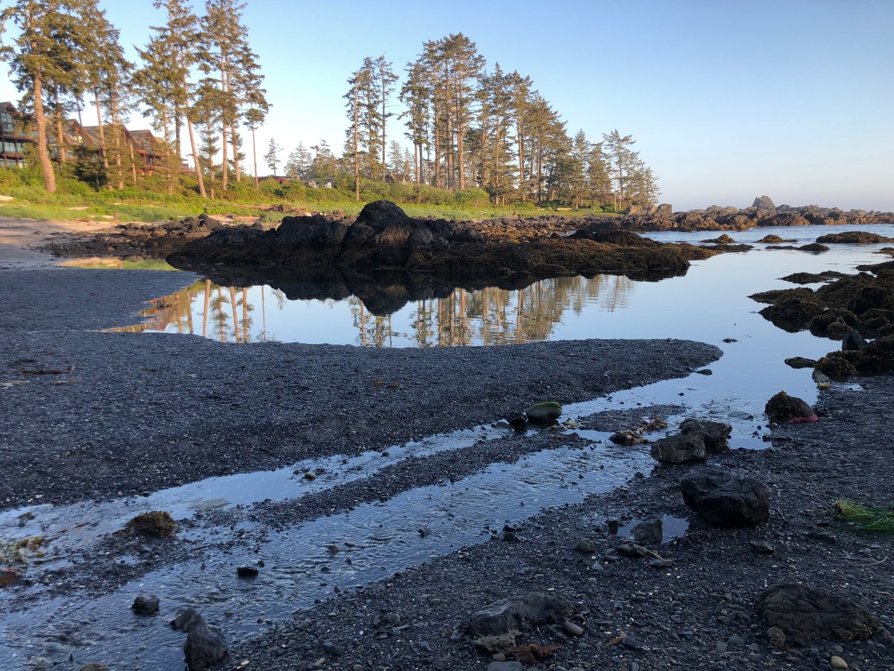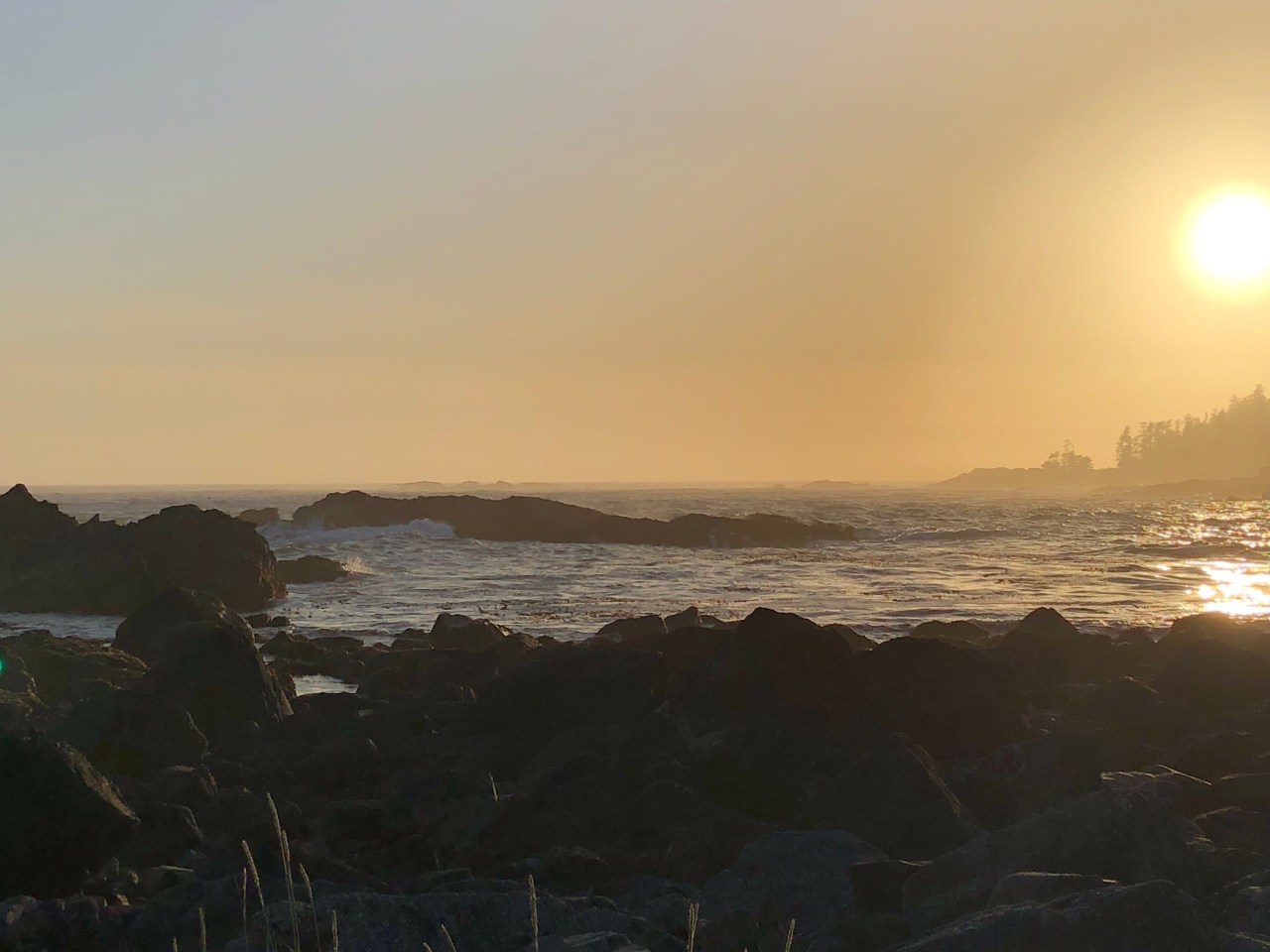 Continuant le chemin on traversait des rigoles, évitant de mettre les pieds dedans et on apercevait des langues de mer enfermées derrière les roches. Le ciel se reflétait dedans et à proximité, des pins tendaient leurs branches vers le ciel comme pour s’y encrer. La mer par endroit s’était laissée enfermée et nous offrait au regard, un petit lac paisible, alors que de l’autre côté des rochers, la mer rugissait et se fracassait, entrainant l’érosion de la nature. On faisait aussi des rencontres incroyables comme ce morceau de bois tout gris, rongé par les vagues et l’écume qui trônait comme une tête d’animal abandonné en cet endroit. Les arbres avaient leurs troncs tout tordus, faisant des circonflexes à l’envers, comme un pommeau arrondi d’une canne. Impressionnant de voir ce tronc tout incurvé ! Et puis au gré de la balade, de hauts roseaux faisaient surface et se dandinaient, tanguaient entre les rochers. On aurait pu se croire en Bretagne sur la côte nord. Mais non, nous étions bien sur l’île de Vancouver, sur la côte pacifique. Les arbres avaient aussi leurs racines tordues accrochées aux rochers et se miraient au coucher du soleil dans ses rayons dardant la côte. Par endroit, des troncs d’arbres faisaient surface, recrachés par la mer. Ils tapissaient un recoin vert, entre des sapins, bouchant un estuaire de la plage. Et puis tout à coup on se trouvait nez à nez avec un wapiti dégustant ses herbes favorites, salées, le moins du monde effrayé par votre présence, continuant à croquer ses fleurs délicieuses. Tranquillement le wapiti suivait son chemin ignorant votre passage.