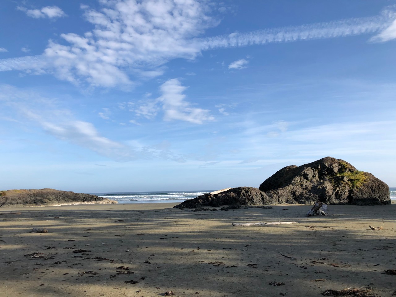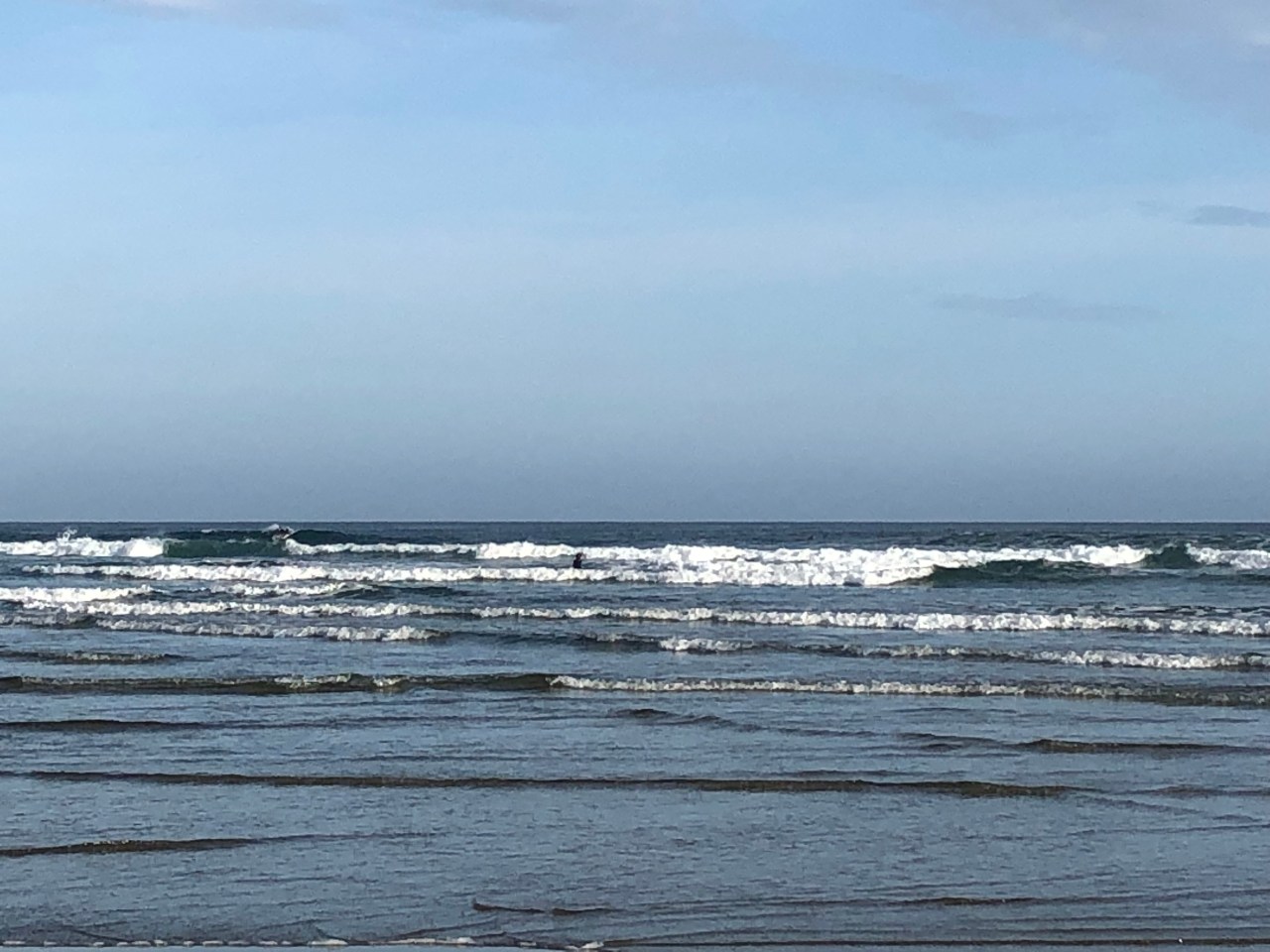 Et puis vient le moment où l’on se retrouve face à une immense plage de sable fin blond voire marron. Long Beach. On dirait la Baule mais cinq fois plus grande. Des monts sont plantés par ci par là enserrant la plage de sable et créant avec le remous des vagues, des stries dans le sable. Des rochers recouverts d’herbes rases et de pins se faisaient face rendant le spectacle magique. Le soleil caché derrière les arbres rendait la plage miroitante et dantesque. Le ciel moutonnait et le soleil dardait la plage de ses rayons. De longues vagues roulent sur la plage, créant des rouleaux où les surfeurs peuvent s’engouffrer. Mais là les flots étaient trop bas pour s’y lancer ! Avec le coucher de soleil le sable devenait brillant et luisait. Les nuages se jouaient du soleil et créaient comme une boule de feu. Mais en fait une boule de nuages enrobant le soleil qui redoublait de son feu.
