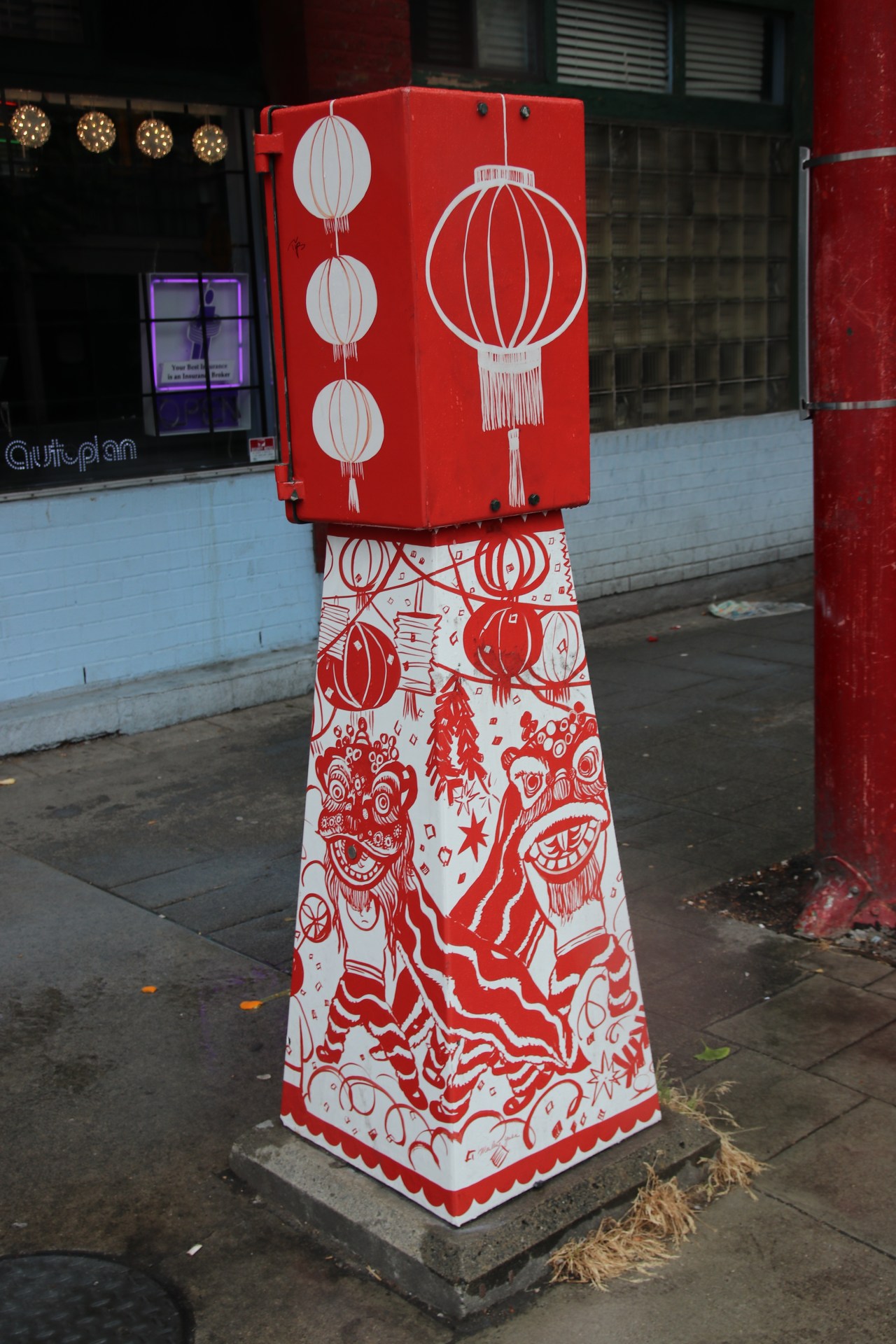 D’autres racontent l’histoire du quartier comme celui du quartier chinois toute rouge ornée d’un tigre avec les lampions sur le dessus.