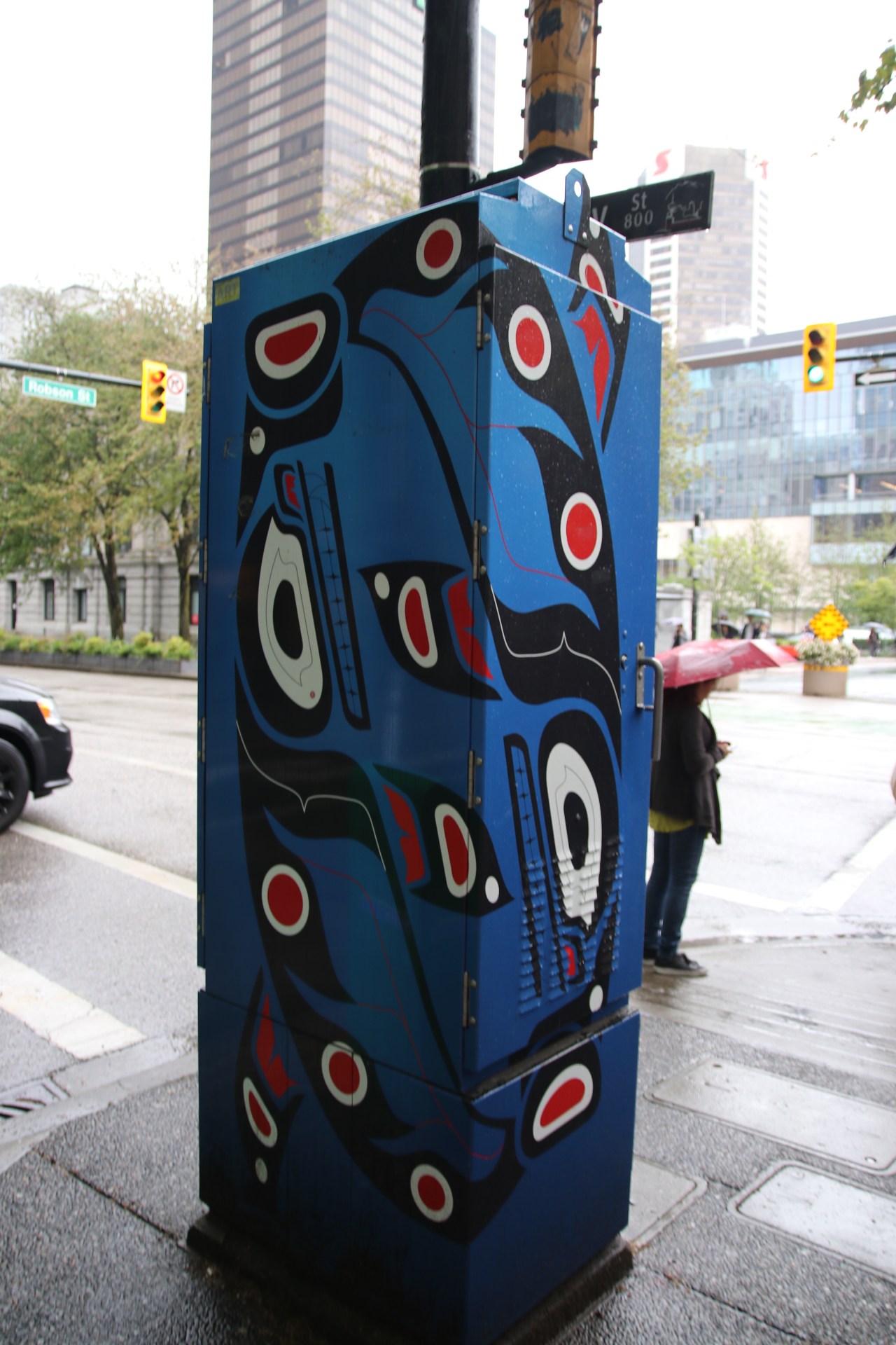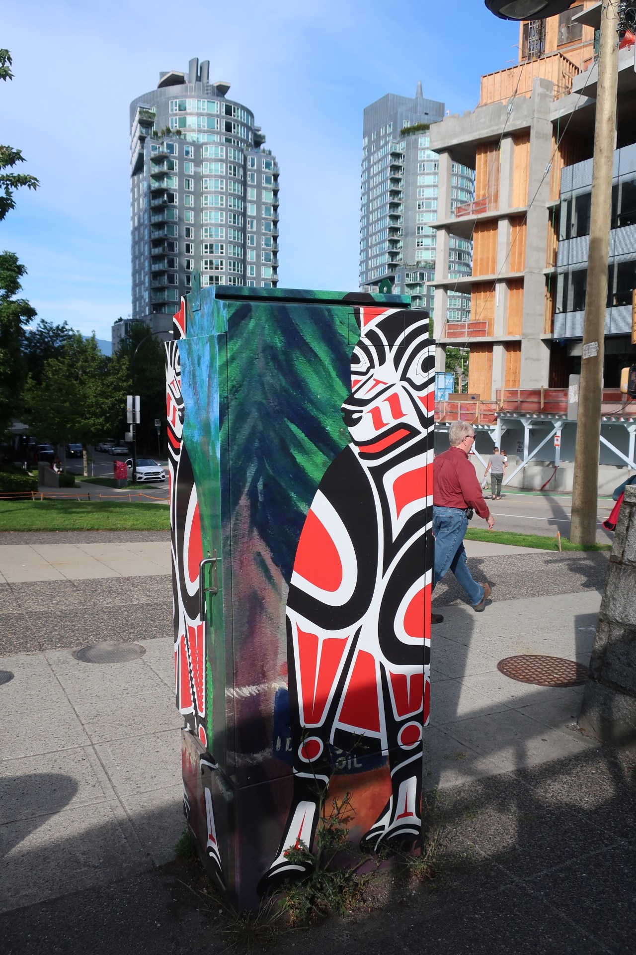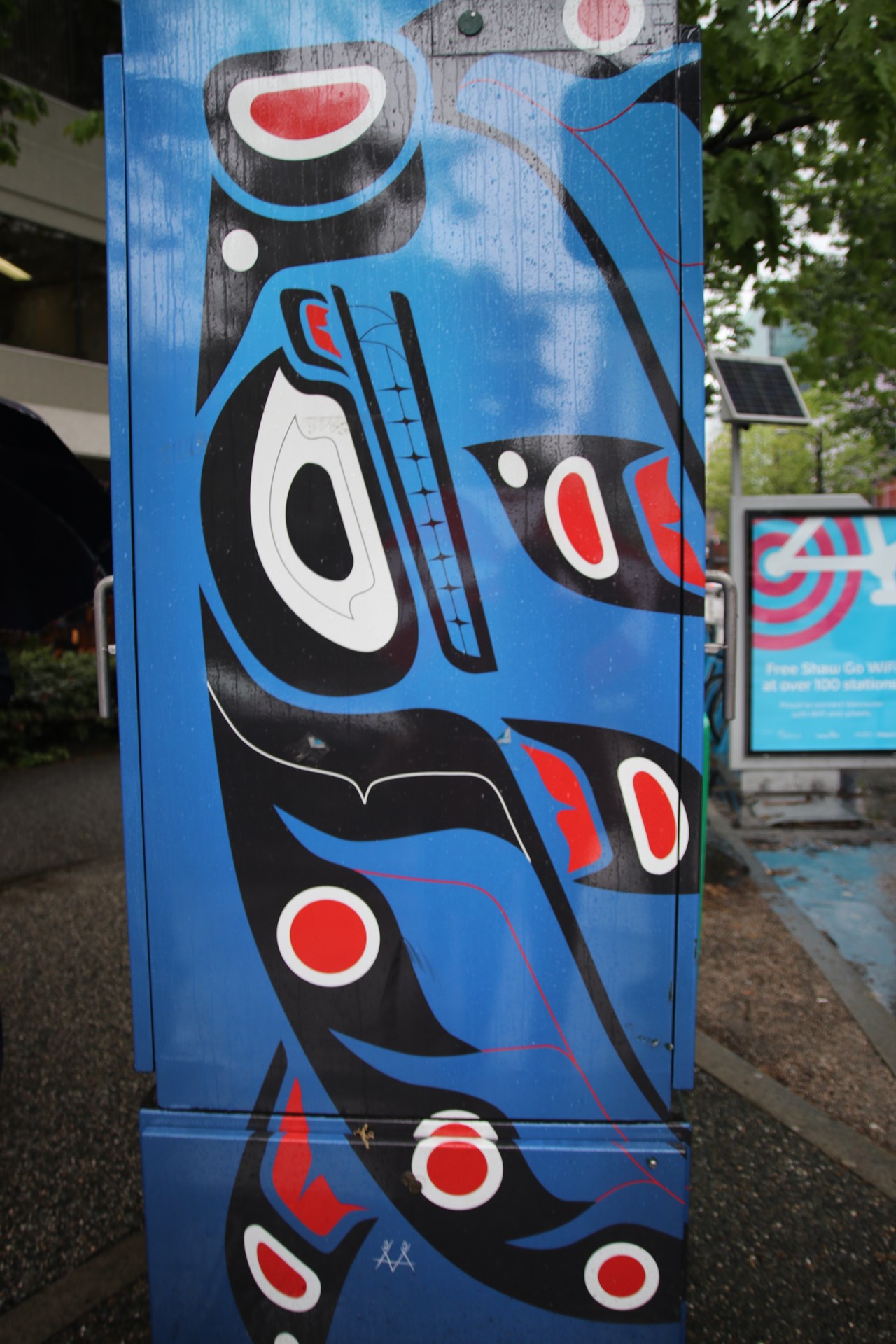 A Vancouver elles donnent dans l’art des nations premières avec les têtes des aigles et des orques qui s’enchevêtrent les uns dans les autres et qui sont là bleus. Ou bien les loups rouges et noirs. Ou encore ces enchevêtrements de branches sur fond mauve où marchent des hommes et des femmes avec des parapluies pour les jours de pluie, ou bien qui font de l’acro-branches, du yoga, du vélo ou tout simplement de la marche. On dirait que toute la vie est représentée là.