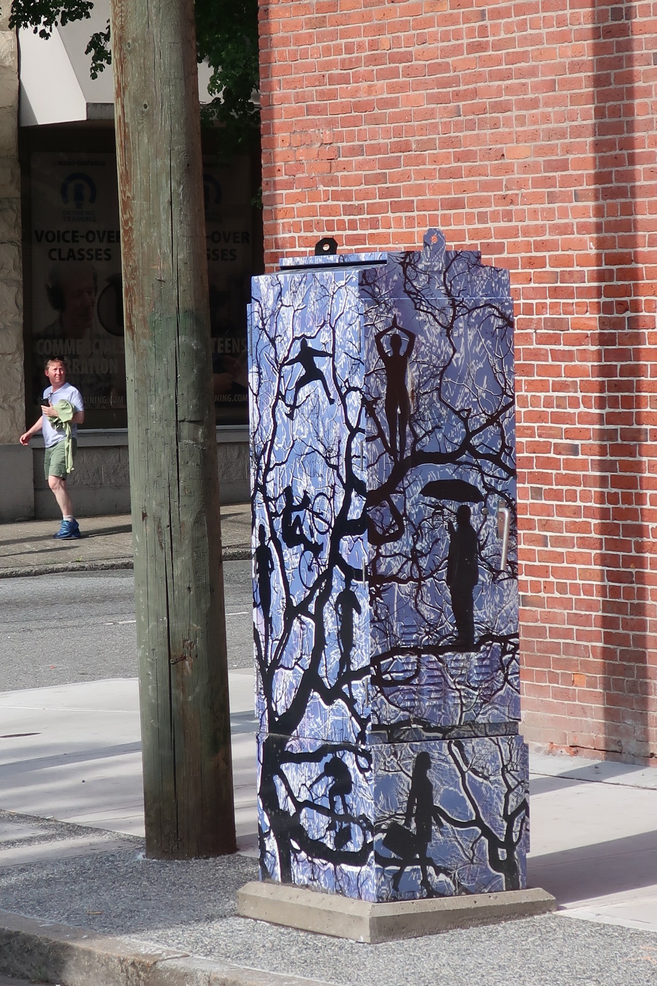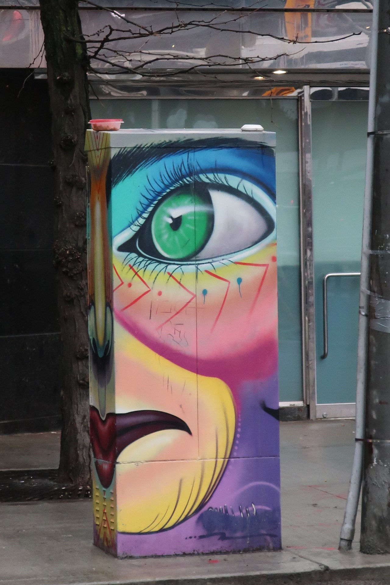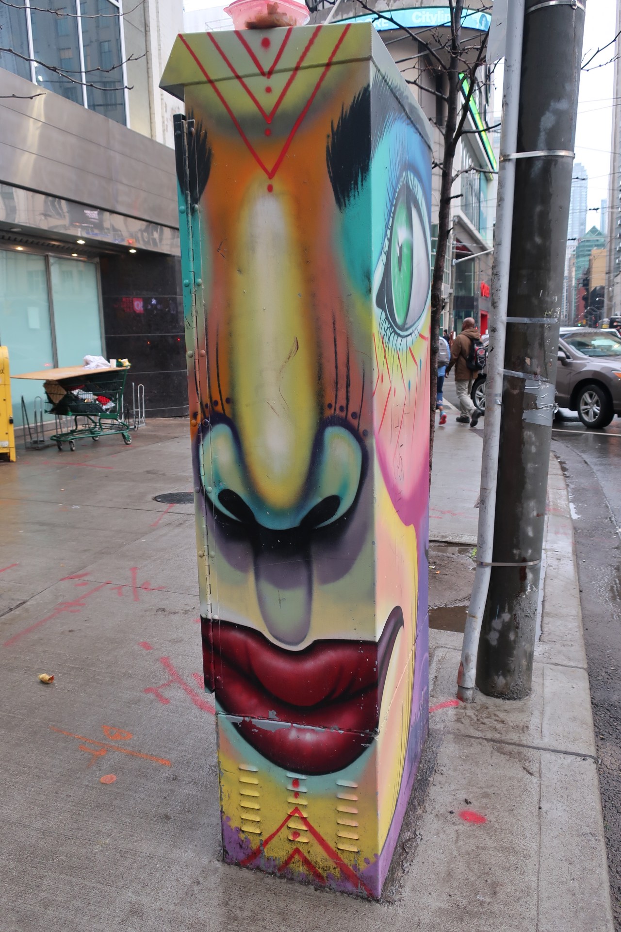 En grosse majorité les boitiers électriques se trouvant dans les rues au Canada sont un enchantement pour moi. Ils sont en général décorés et cela donne lieu à des œuvres d’art à ciel ouvert.