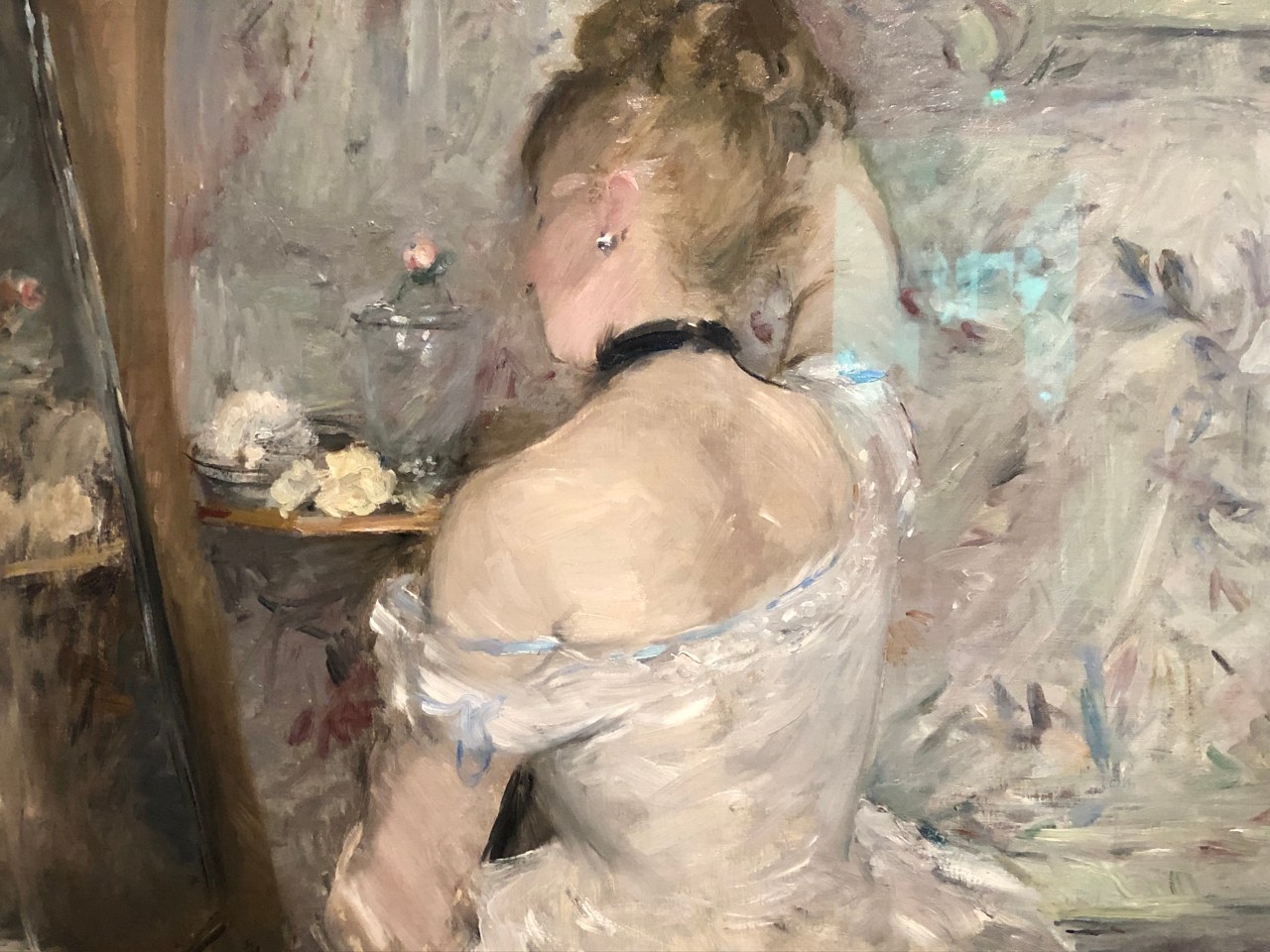 Et les dos nus de femmes s’habillant, se coiffant, osant découvrir un sein qui se reflète dans le miroir. Ou bien cette femme s’apprêtant pour sortir les épaules découvertes se penchant pour découvrir une boucle d’oreille à son oreille gauche. Un joli mouvement nous offre son portrait.