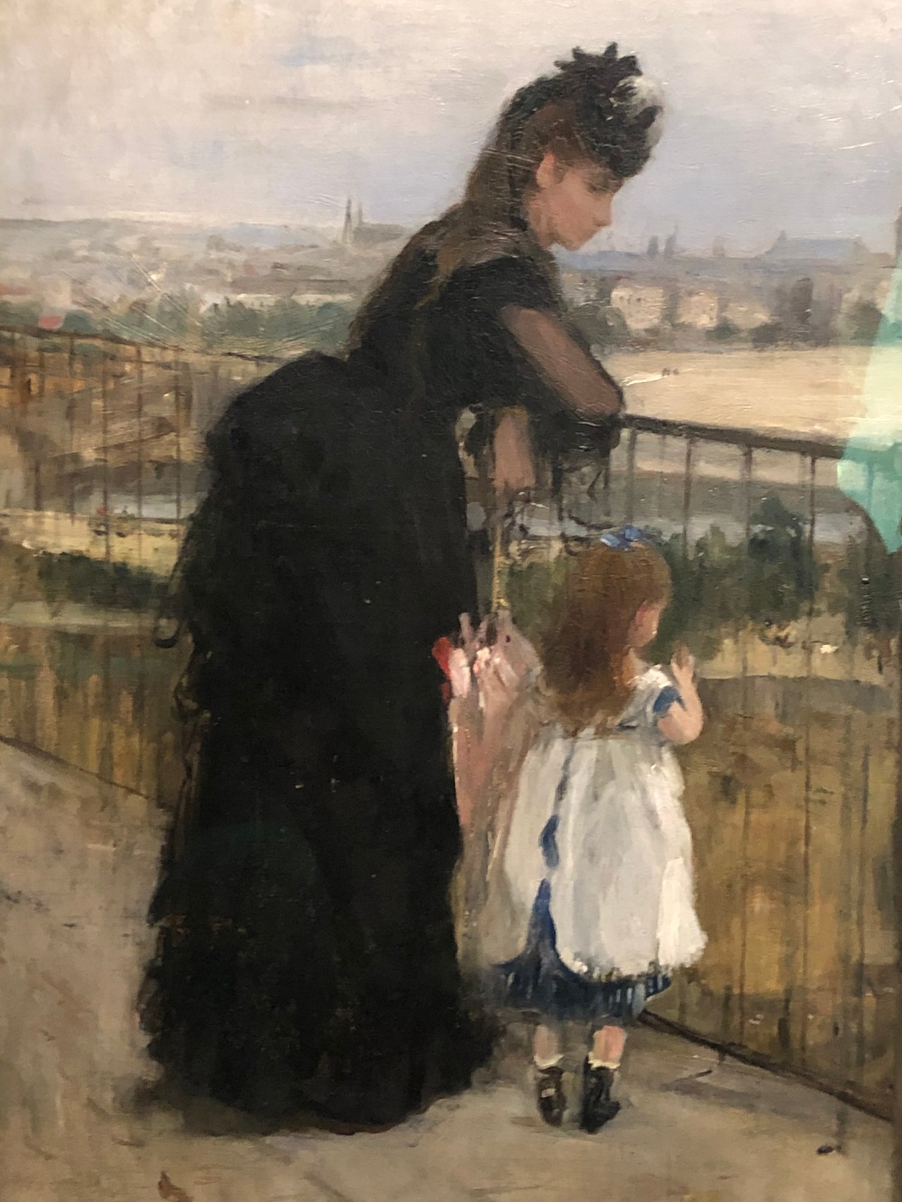Elle peint aussi des enfants sur les genoux de leur maman, bébé joufflu qui gazouille. Ou bien cette femme en noir qui regarde le fleuve d’un promontoire avec sa fille à la sur-robe blanche. Contraste entre les deux.