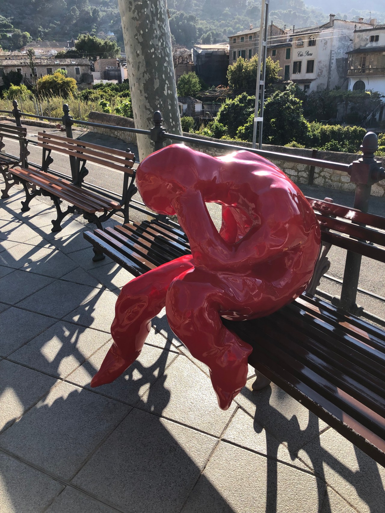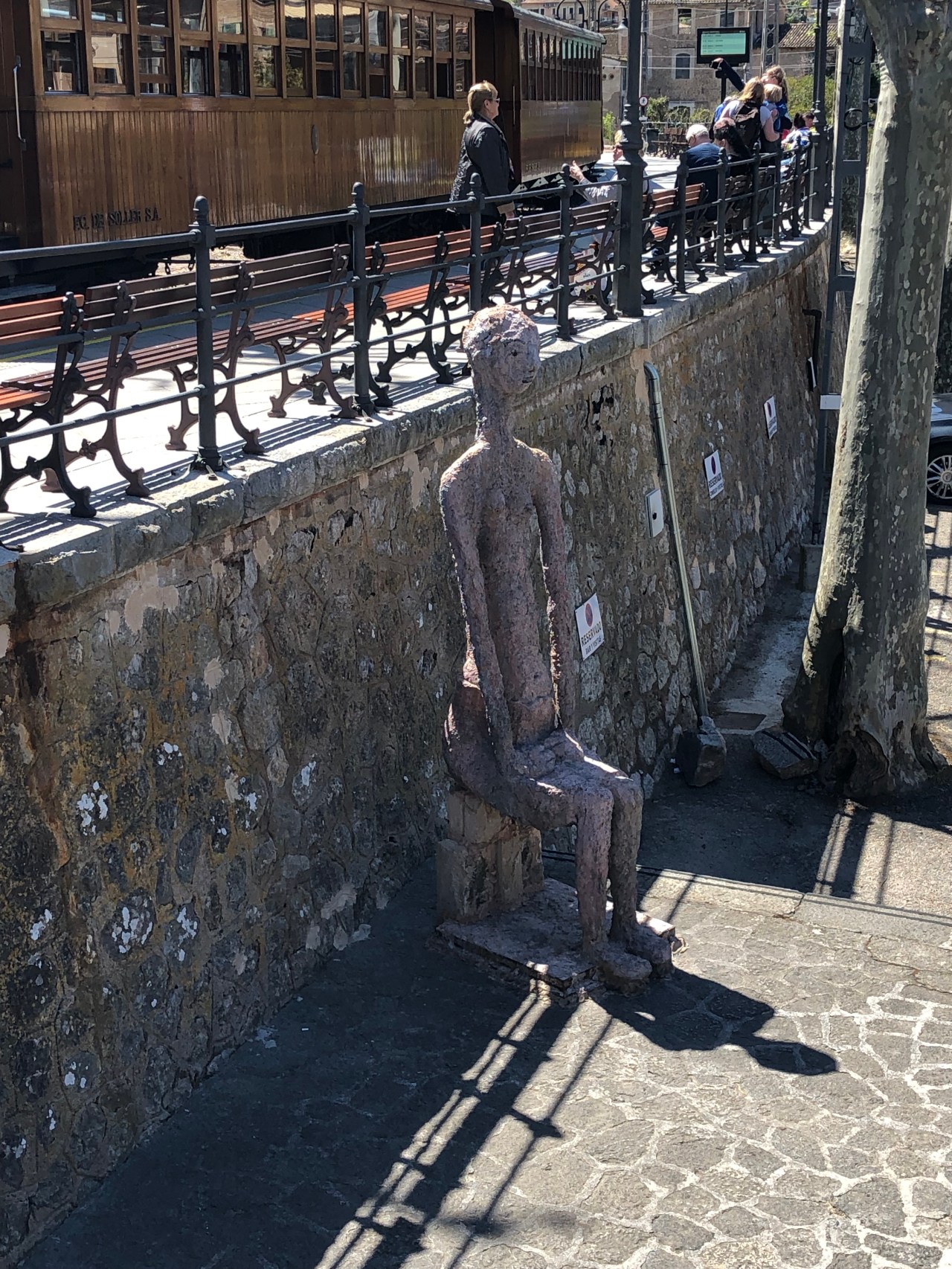 Et oui il nous a fallu reprendre le tramway pour refaire le chemin parcouru le matin. A mon grand regret j’ai dû quitter ce lieu qui happait mes yeux. A la gare de Soller je me suis assise à côté d’une statue rouge sang, assise sur le banc, qui la tête reposant dans l’une de ses mains m’a fait penser au Penseur de Rodin. Je n’ai pu résister à l’idée de m’asseoir à côté de lui et de disserter avec lui !