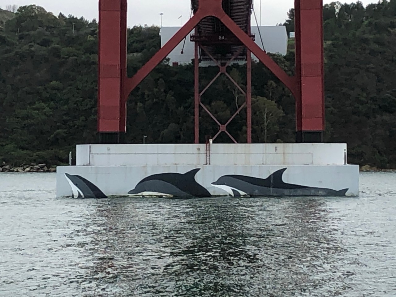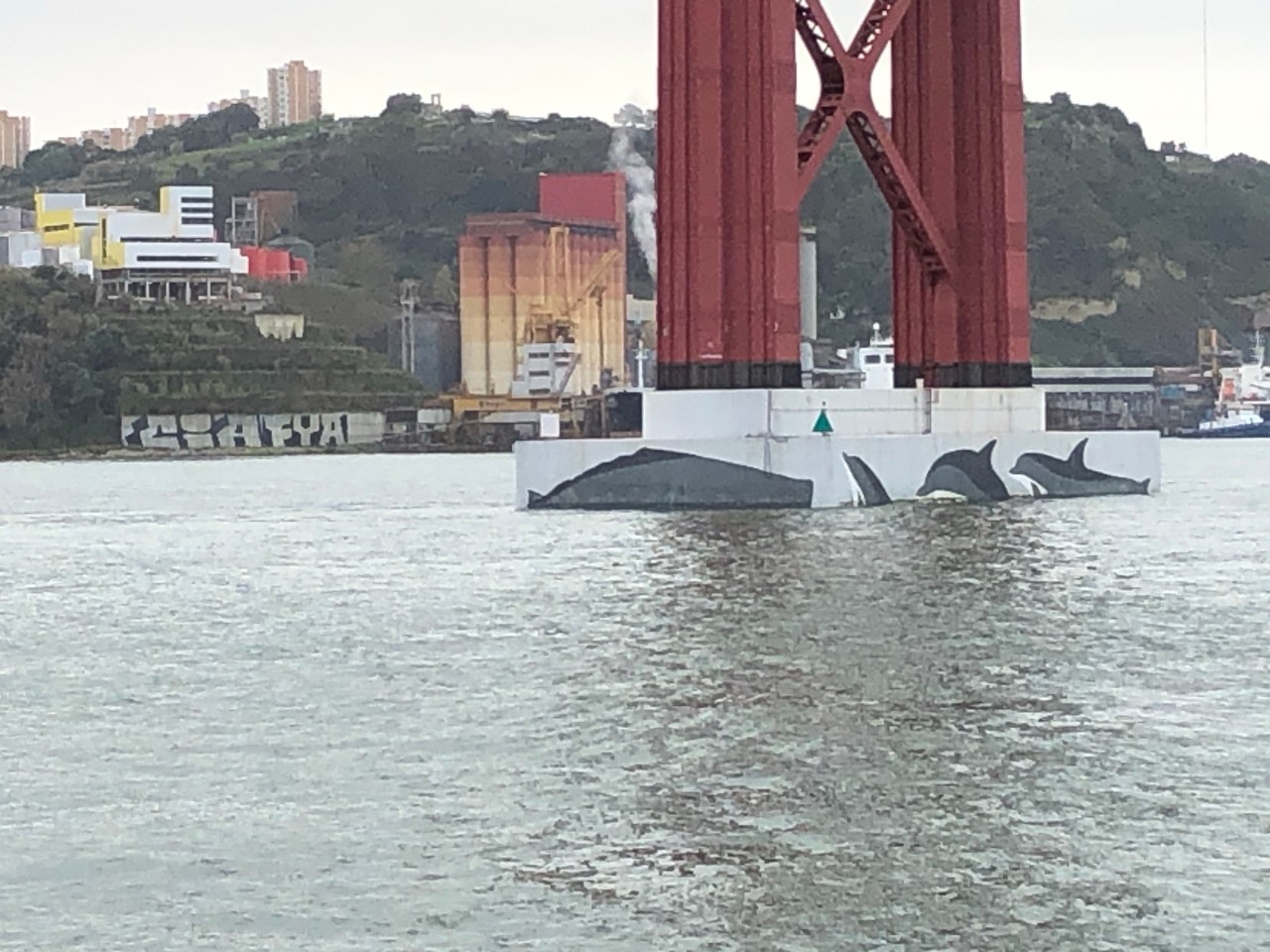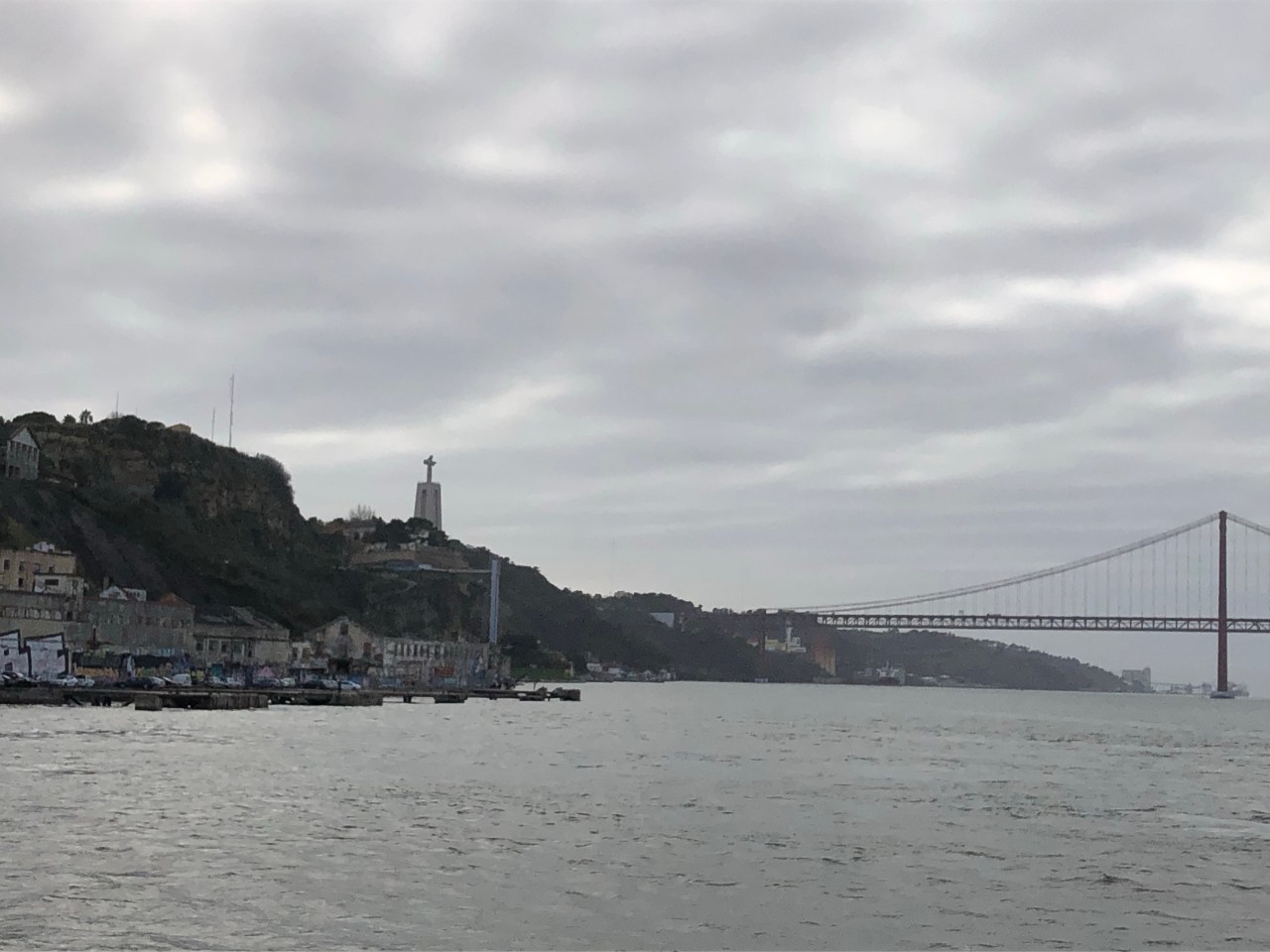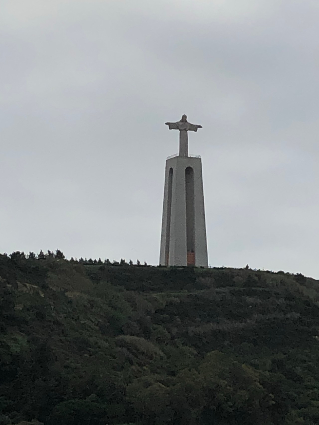 Puis nous avons passé le pont du 25 avril qui enjambe le Tage et rallie Lisbonne à Almada. Tout de rouge vêtu, les pieds des pilonnes rouges ornés de dauphins et de baleines, et surtout bruyant à souhait ! Assourdissement assuré – impressionnant et déprimant !