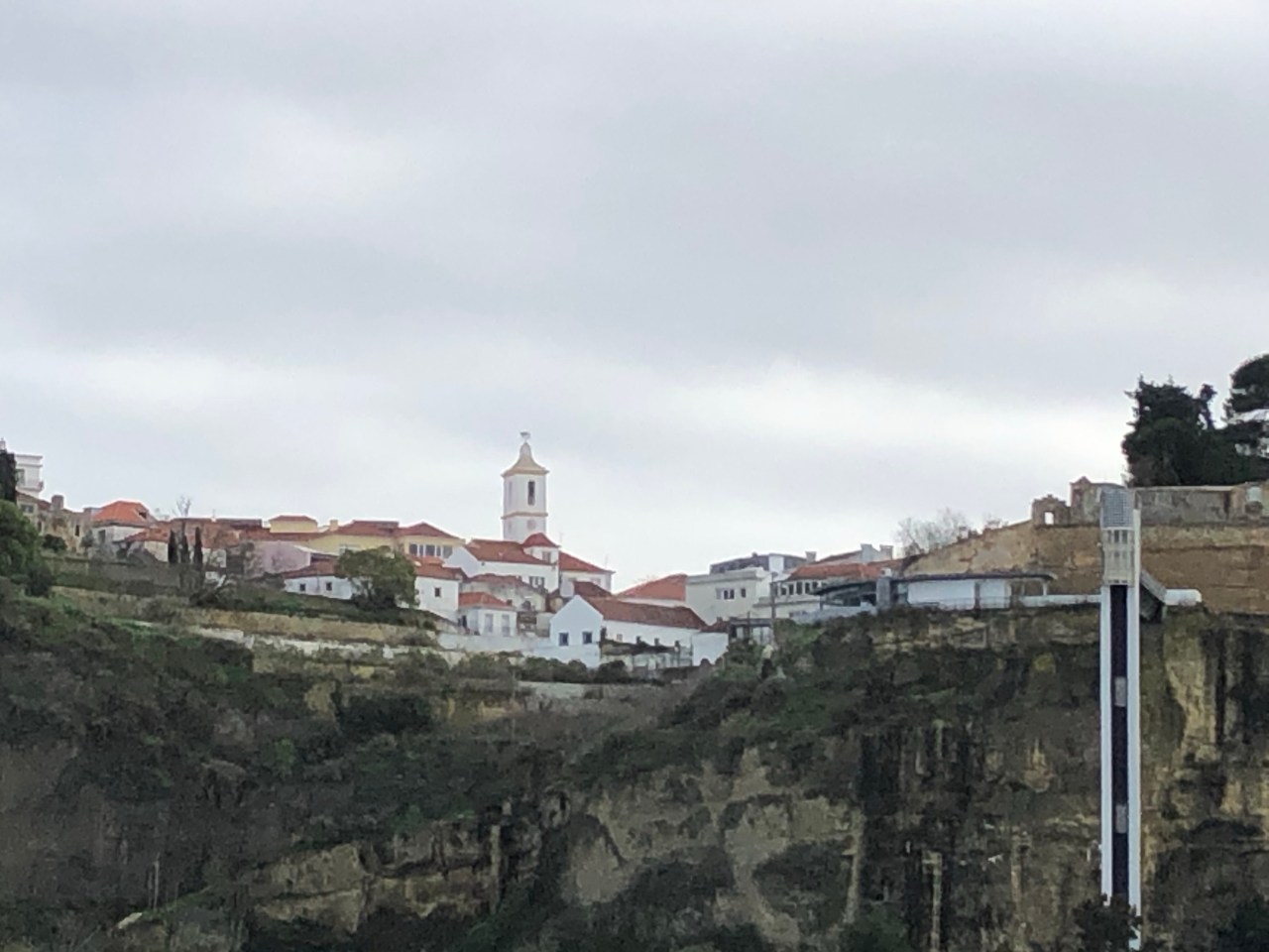 Départ sur un bateau jaune et nous voilà voguant tout schuss, traversant le Tage pour rejoindre le port d’Almada, en face avant de filer le long de la côte opposée, proche du Christ Roi levant les mains au ciel, copie miniature du Christ rédempteur de Rio de Janeiro. La côte se déclare à nos yeux et revêt son habit de calcaire. Des villages se tiennent au bord de la falaise à deux doigts du précipice.