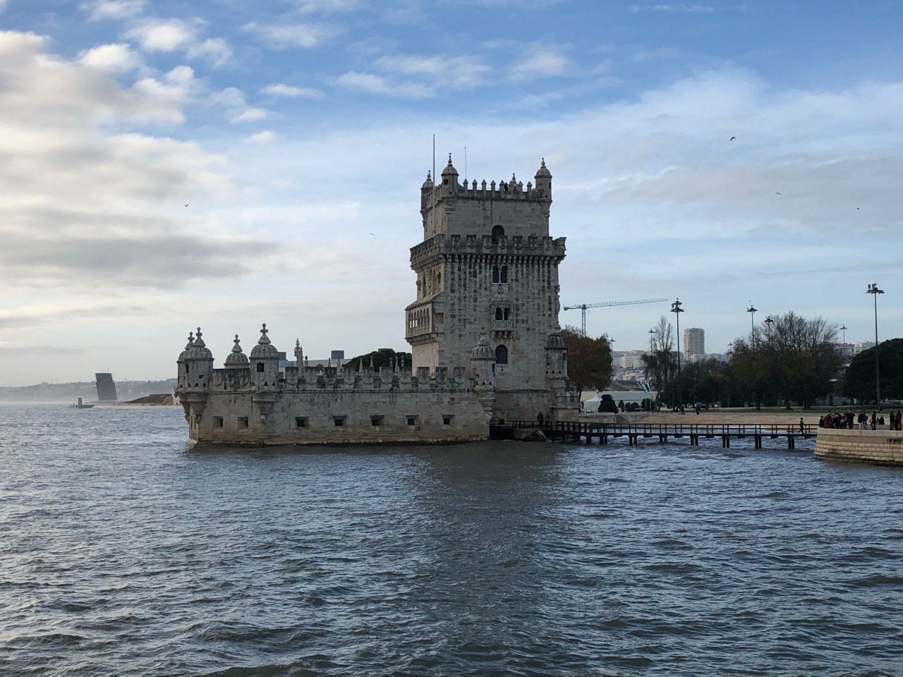 Le ciel à cet endroit a changé : il explose de tentacules de nuages blancs et gris foncés ; laisse passer le soleil et le ciel bleu pour jouer les contrastes des uns et des autres. Des voiliers voguent et jouent leur danse sur le fleuve. Puis nous arrivons sur la Tour de Bélem – proue avancée sur le fleuve, quête d’un départ ou d’une triste reculade faisant du surplace.