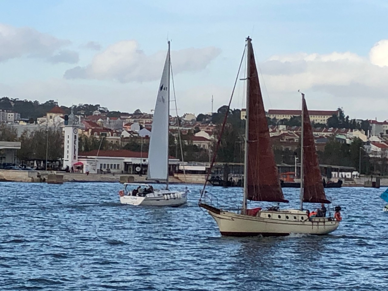 Le ciel bleu, lors du départ de Lisbonne, s’est assombrit au fur et à mesure de la visite mais il n’a pas plu. Il y a eu des jeux de nuages – moutons blancs parsemés, de cieux bleus, noirs, nuageux, sombres. Tout cela rendait le paysage encore plus beau et contrasté. Le Tage, lui restait imperturbable – bleu foncé voire gris acier – juste remuant aux passages d’autres bateaux.
