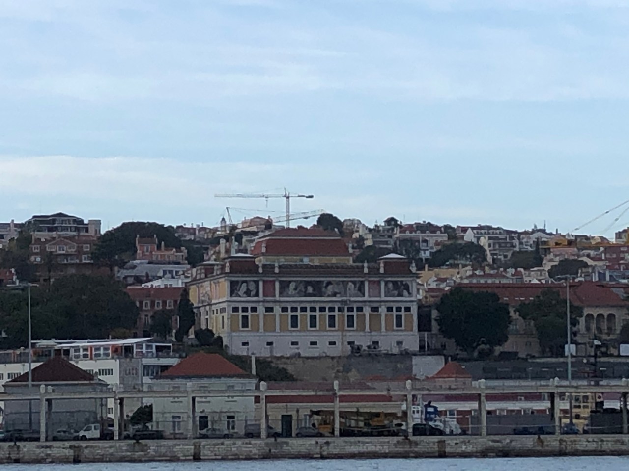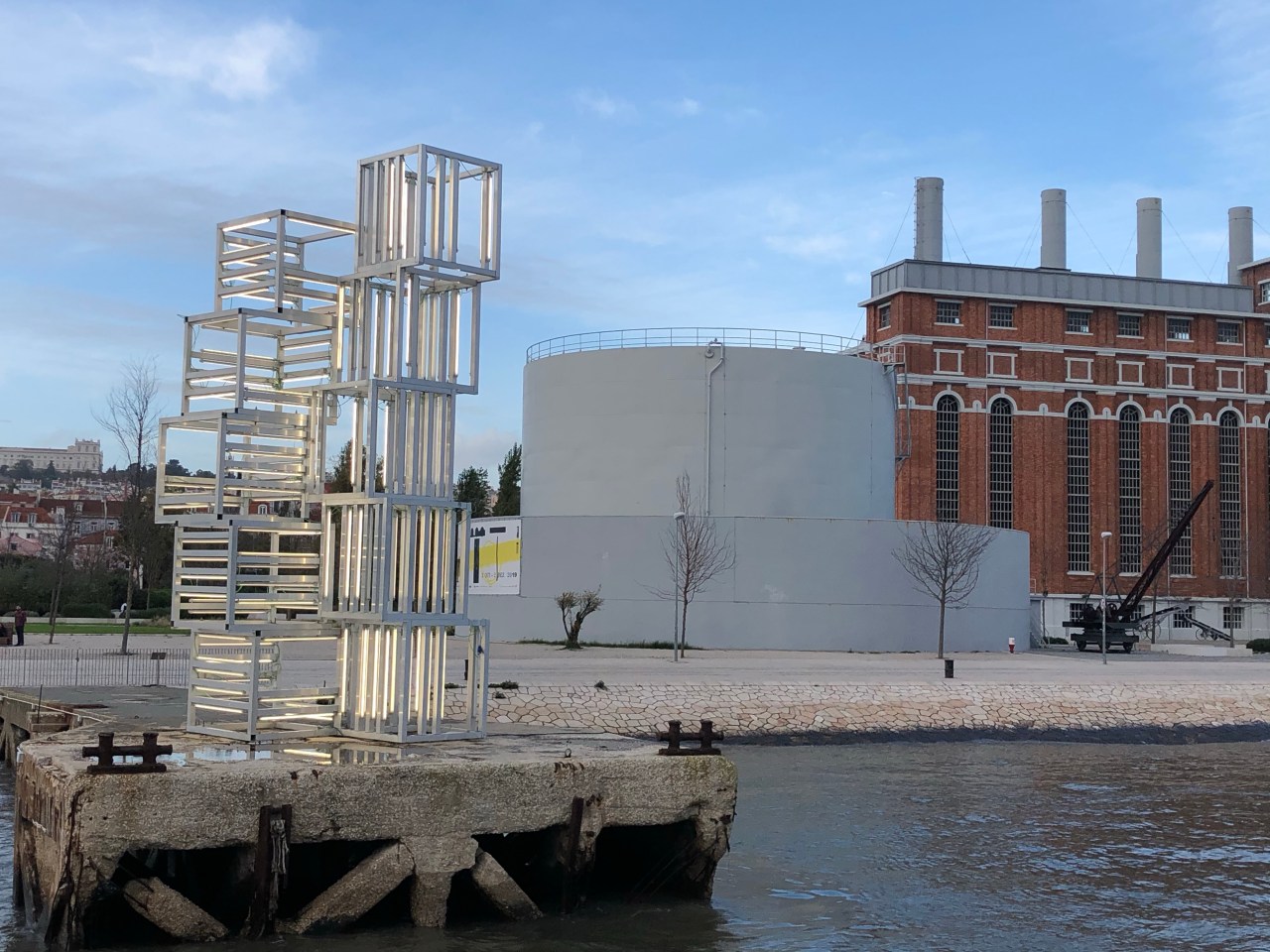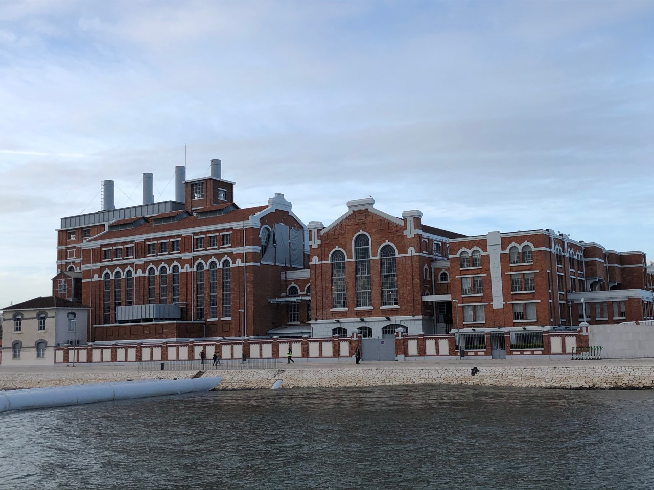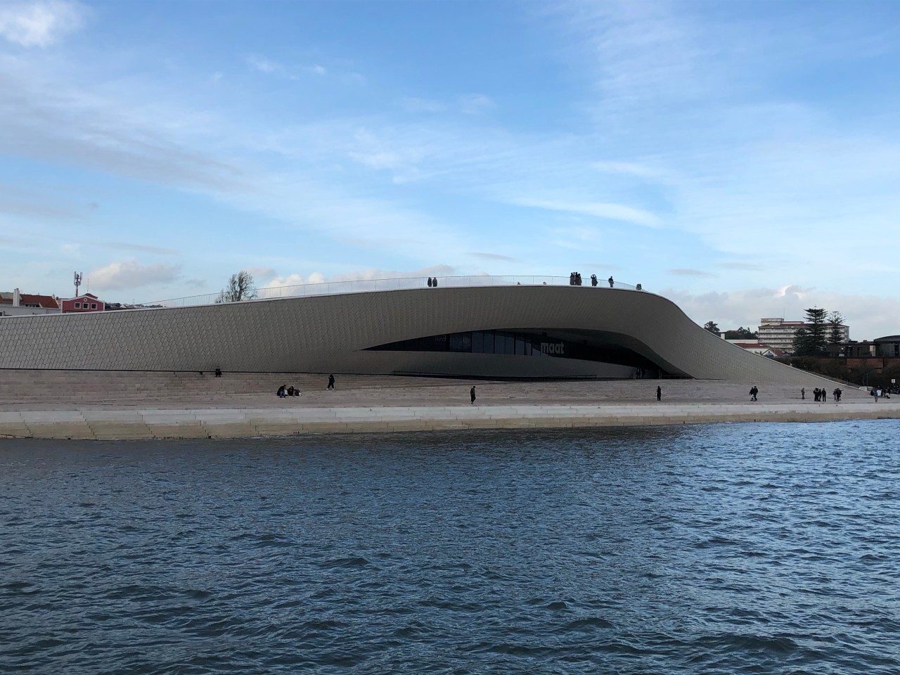 Puis nous longeons la rive avec des bâtiments connus de tous : la tour phare de Bélem qui indique l’heure ; le MAAT avec sa gueule de requin ouverte et son usine électrique en brique rouge, transformée en musée d’art moderne. Tous ces éléments jouent une courbe, une vague et se jettent dans le Tage pour y accomplir leurs rituels en termes d’art.