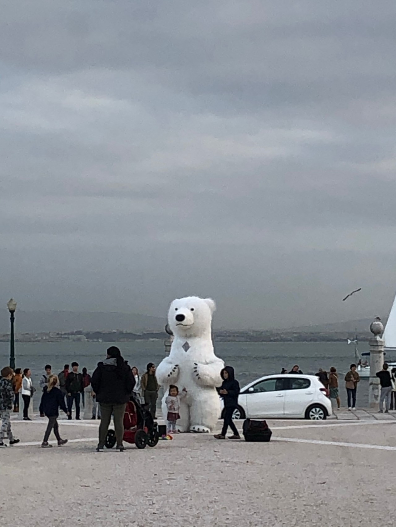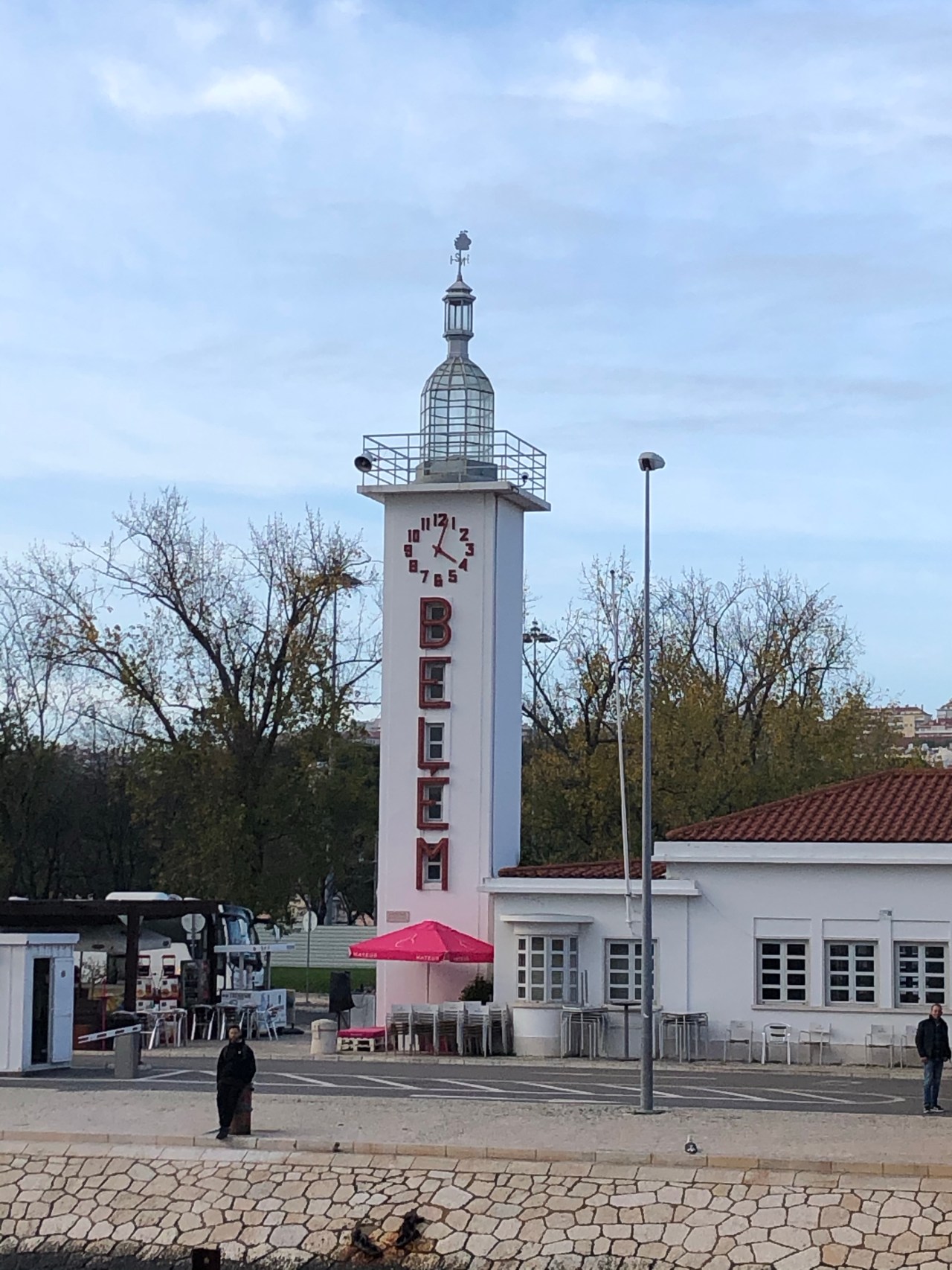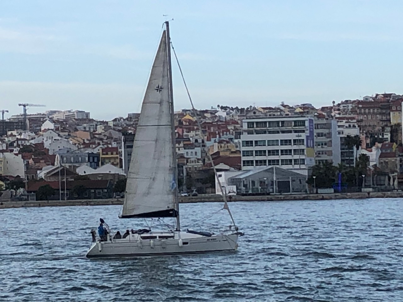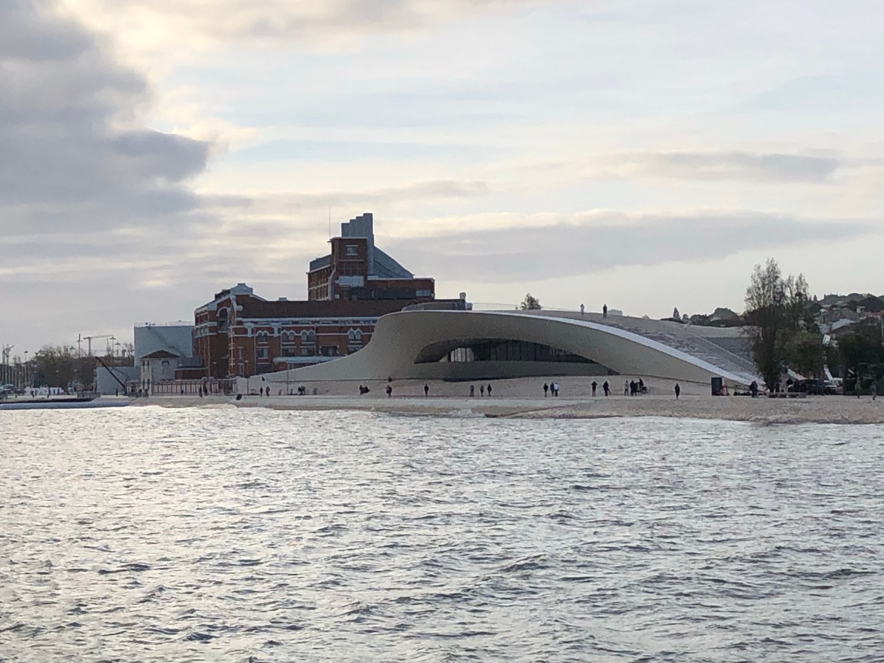 Puis nous longeons la rive avec des bâtiments connus de tous : la tour phare de Bélem qui indique l’heure ; le MAAT avec sa gueule de requin ouverte et son usine électrique en brique rouge, transformée en musée d’art moderne. Tous ces éléments jouent une courbe, une vague et se jettent dans le Tage pour y accomplir leurs rituels en termes d’art.