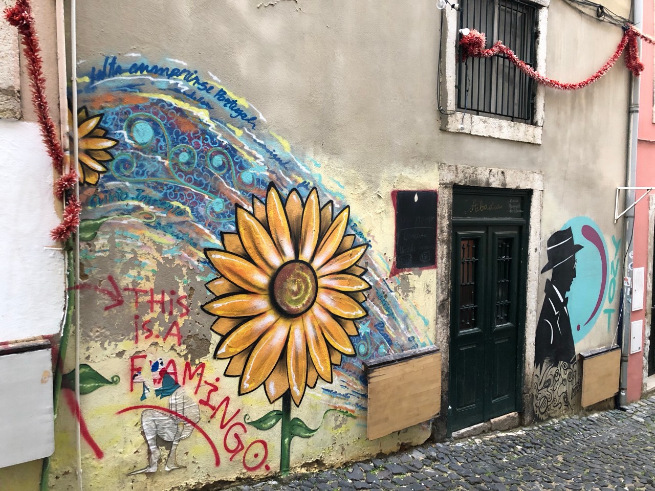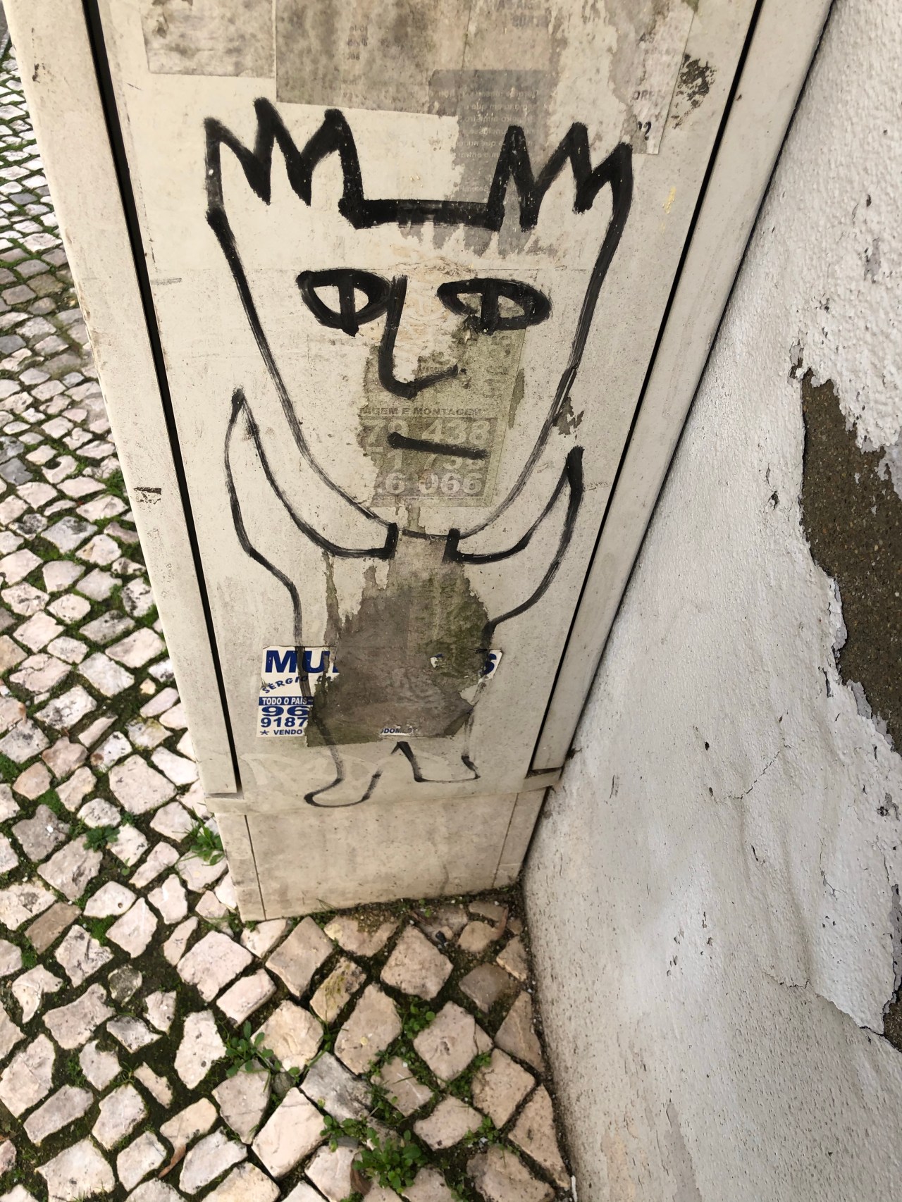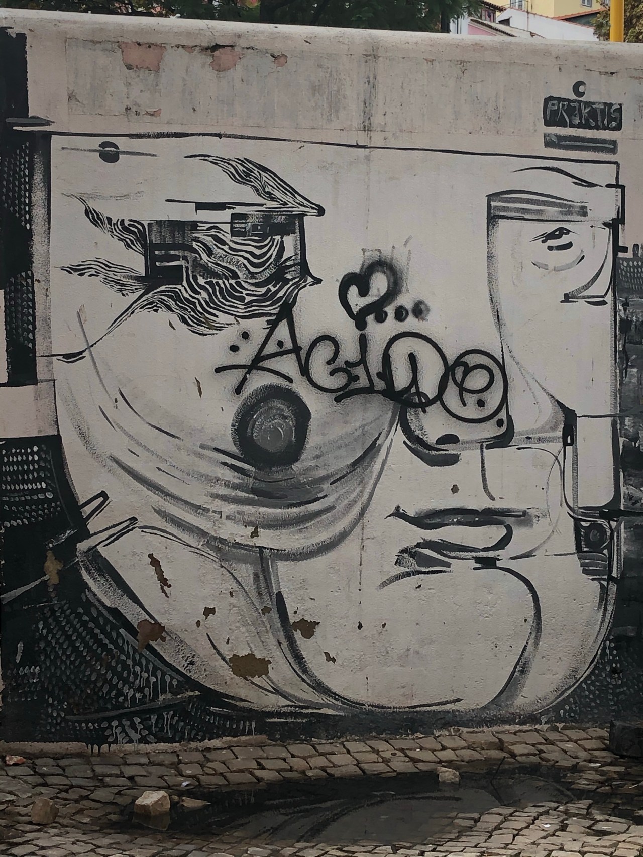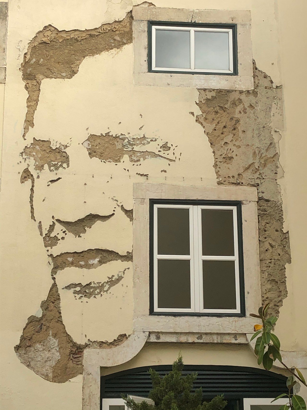 Pour commencer dans le quartier Santos j’ai pu admirer quelques œuvres simples mais délicieuses qui parlaient d’êtres humains dont un visage aux multiples facettes et yeux ; celle toute simple d’un profil ou bien le monsieur à la barbichette et au fond bleu comme le ciel de Lisbonne. Ou bien ce portrait dans un centre culturel non loin non plus. On dirait Brel mais ce n’est pas Brel. Sûrement le maitre pour lequel le centre culturel a été créé.