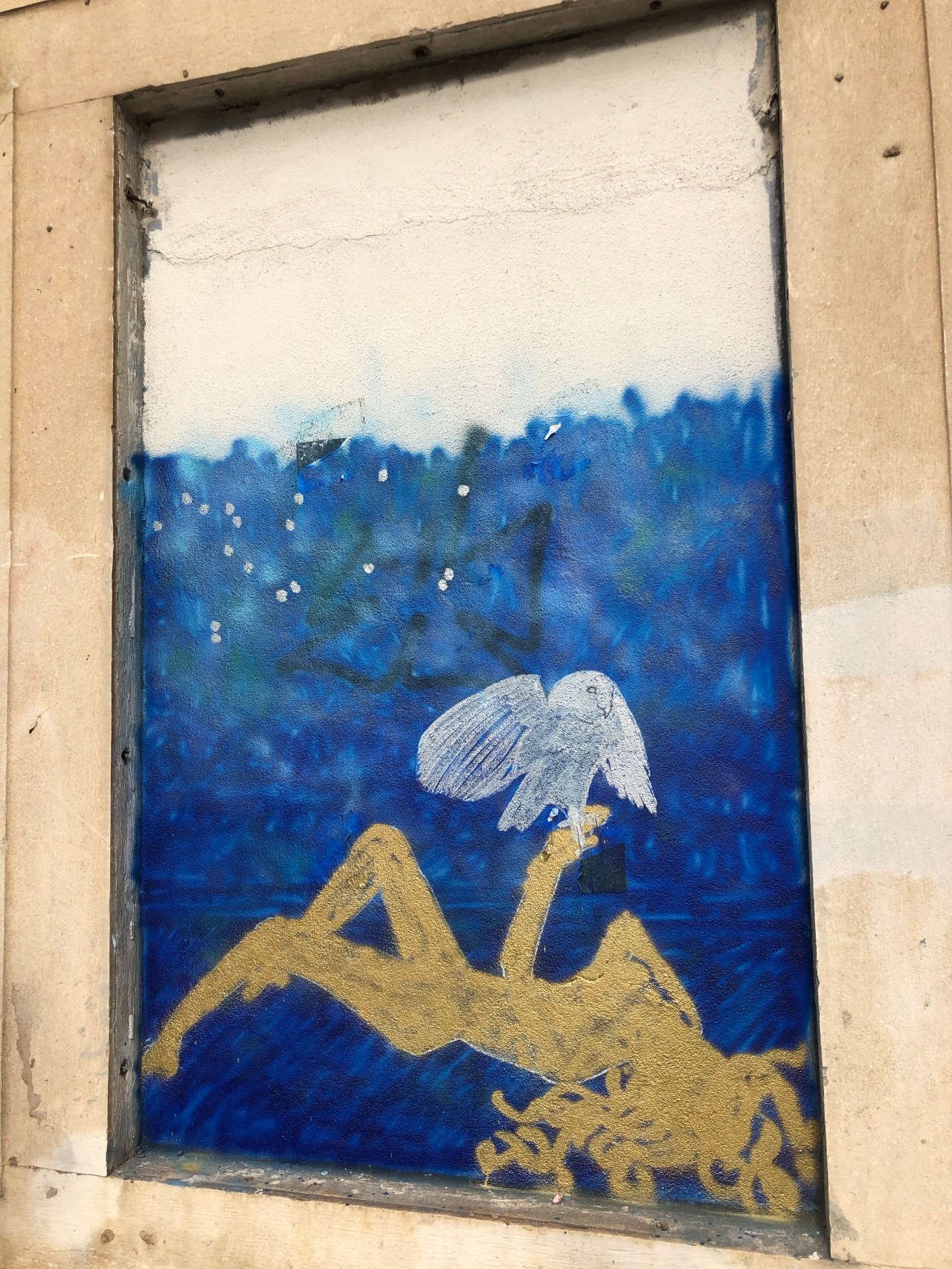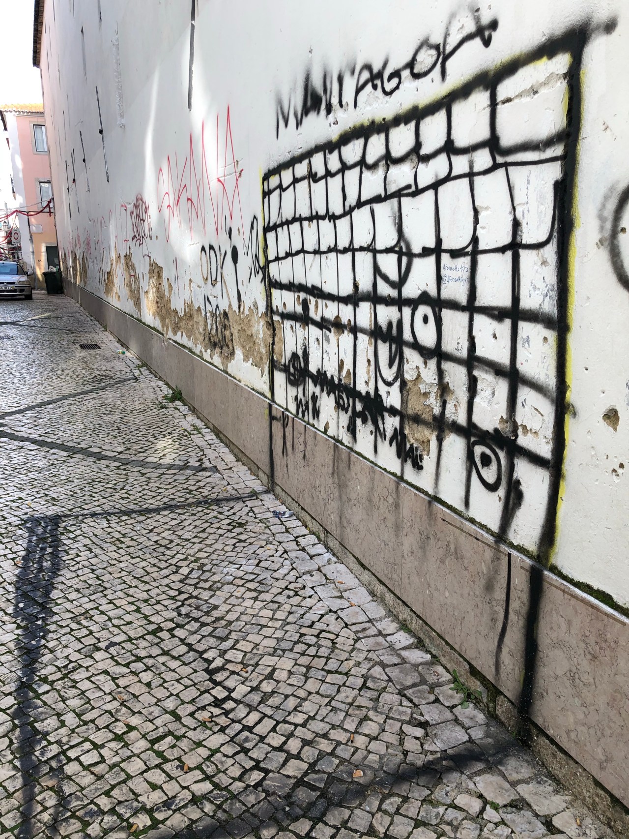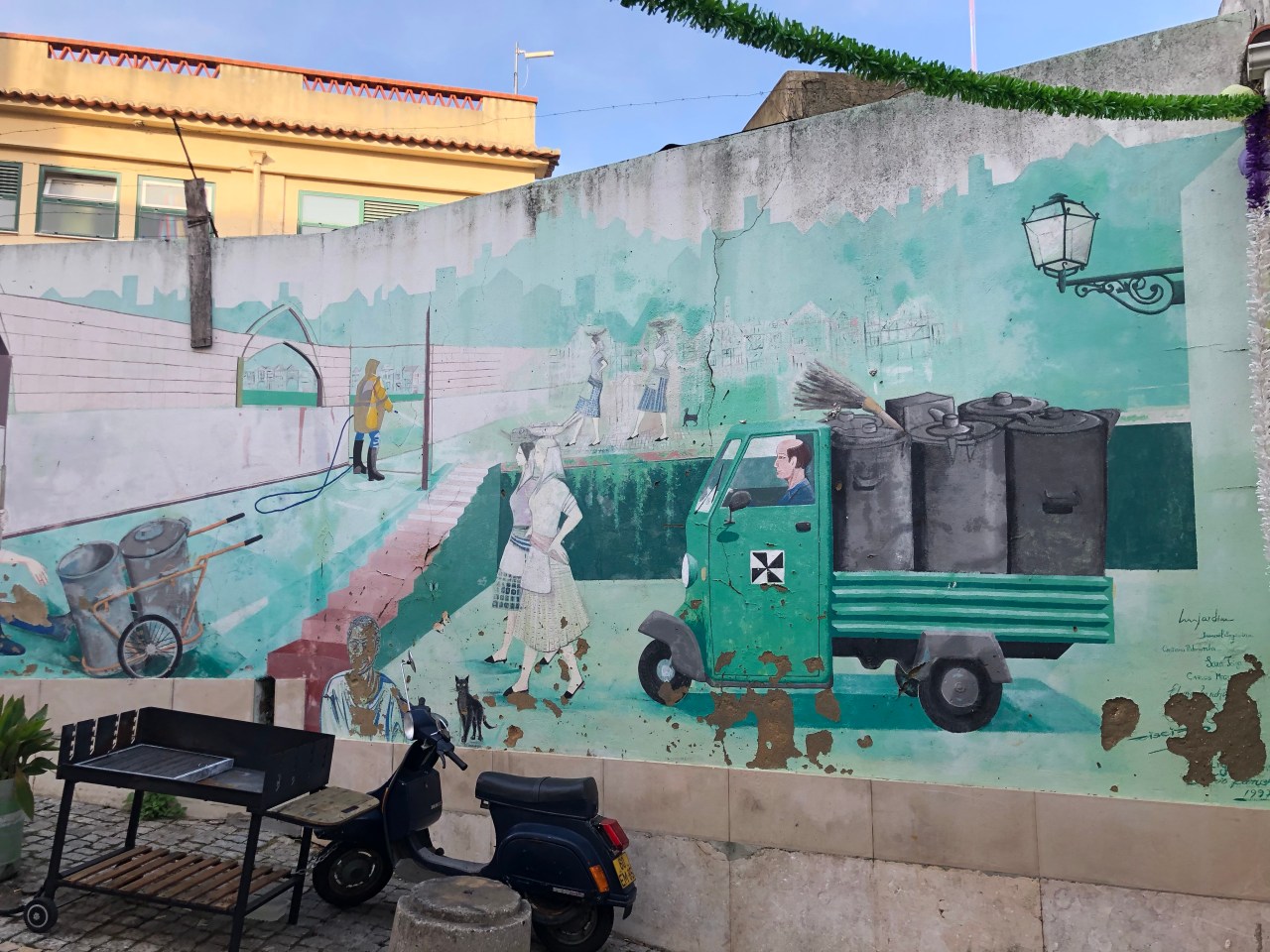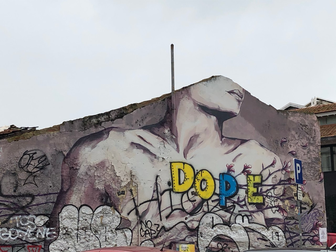 Pour commencer dans le quartier Santos j’ai pu admirer quelques œuvres simples mais délicieuses qui parlaient d’êtres humains dont un visage aux multiples facettes et yeux ; celle toute simple d’un profil ou bien le monsieur à la barbichette et au fond bleu comme le ciel de Lisbonne. Ou bien ce portrait dans un centre culturel non loin non plus. On dirait Brel mais ce n’est pas Brel. Sûrement le maitre pour lequel le centre culturel a été créé.