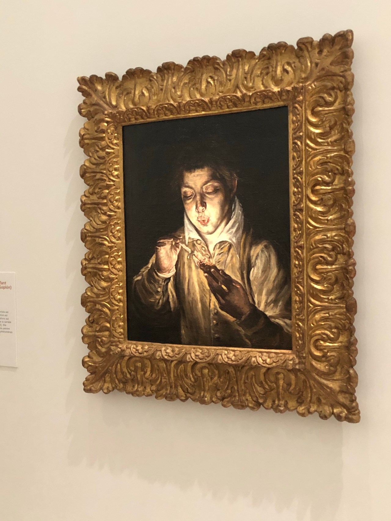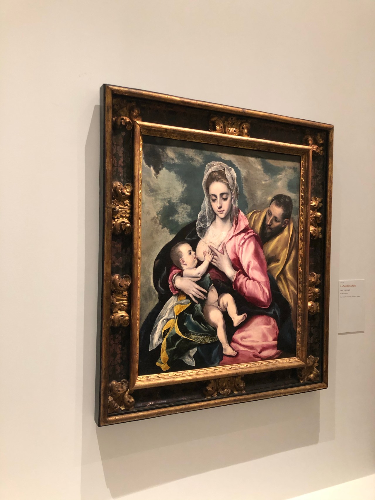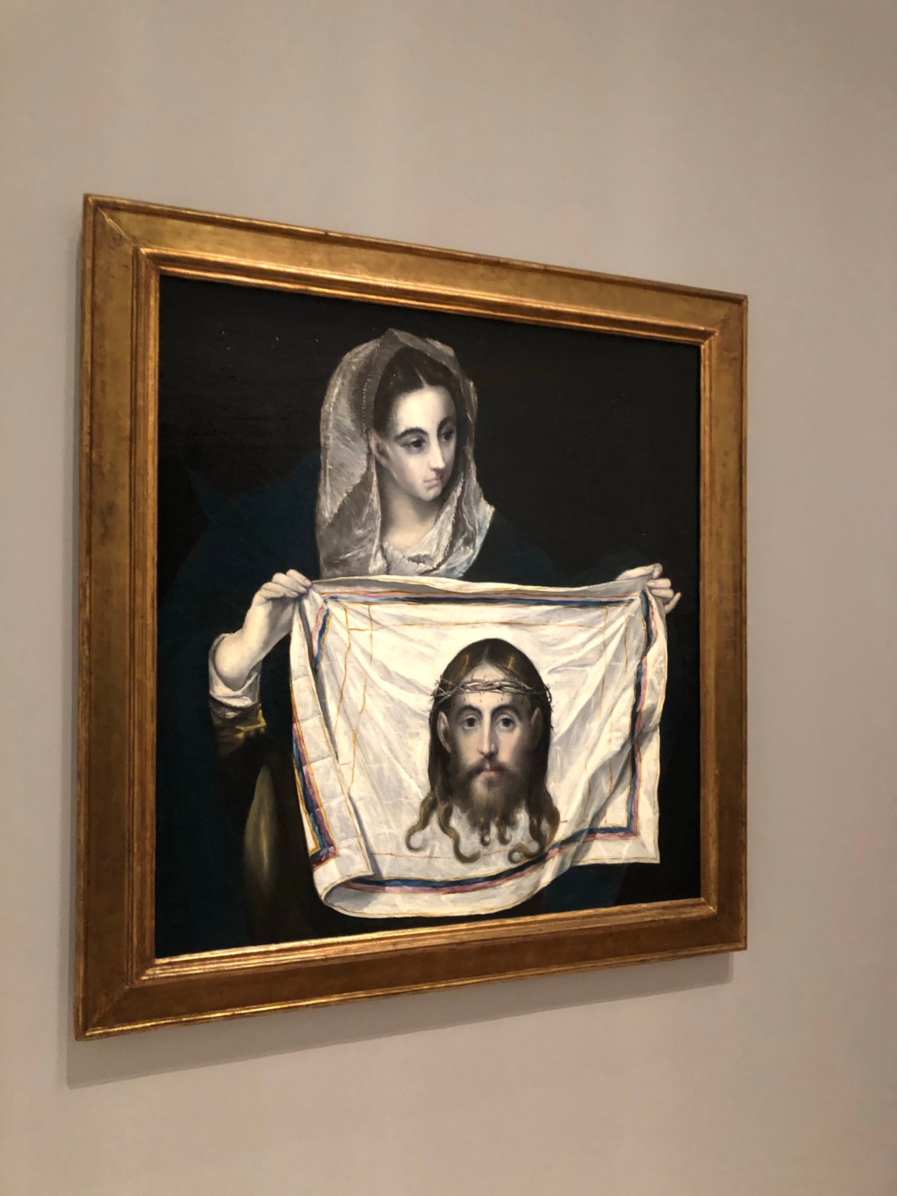 A l’entrée de l’exposition il y a ce tableau noir avec ce visage du Christ et cette femme- je suppose la Vierge Marie qui tient ce drap avec l’image du Christ. Je n’ai pas retenu s’il était du Gréco même ou d’un de ses élèves mais cette œuvre est prenante et attire les regards. Cette femme qui regarde le Christ d’en haut, le visage penché en diagonale et qui tient le tissu où le Christ figure est juste magnifique et plein de tendresse. J’ai eu beaucoup de mal à détacher mon regard de ce tableau.