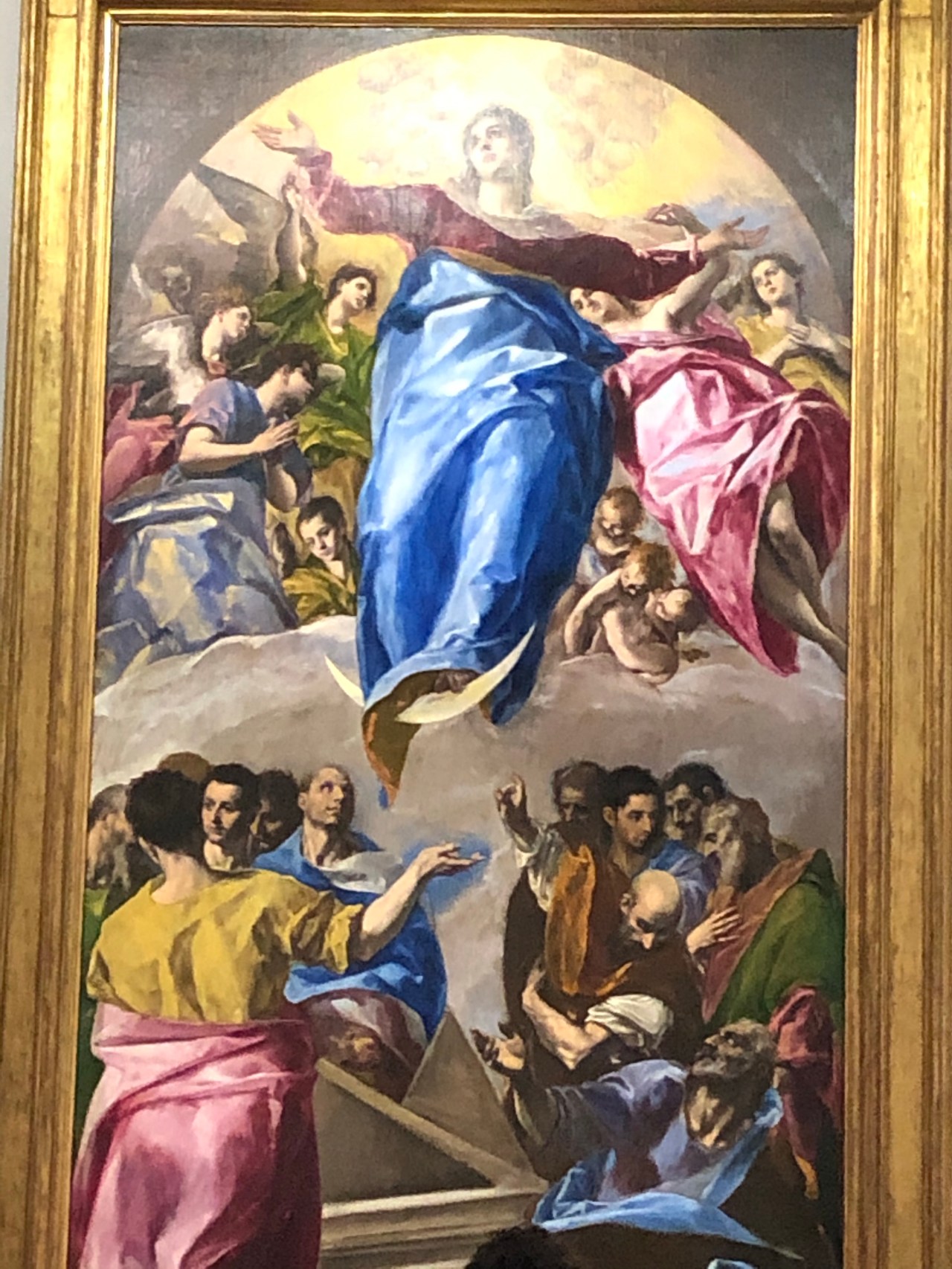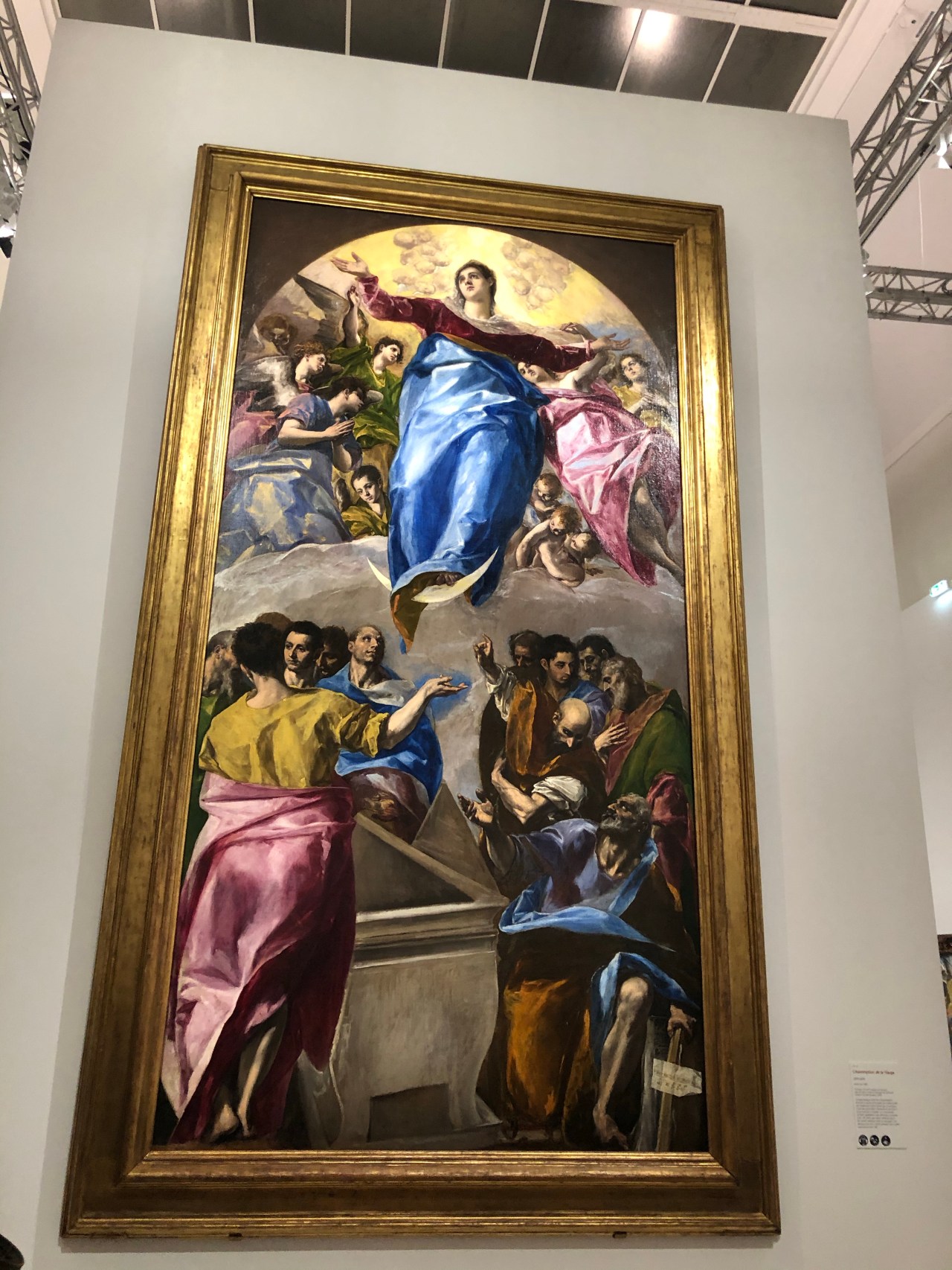 Tout d’abord la vie du Gréco est extraordinaire. Né en Crète à Candie (ancien Héraklion) en 1541, il devient peintre et se spécialise sur les peintures d’icônes. Puis il quitte la Crète pour Venise en 1567 pour y parfaire son art. Puis il se rend à Parme et Rome se met au service du Cardinal Farnèse d’où il sera chassé. Puis il arrive en Espagne, recherchant un mécène en Philippe II qui ne lui donnera pas. De 1577 à 79 il réalise pour le monastère de Santo Domingo El Antiguo à Tolède les peintures du maître-autel et des autels latéraux. Il s’agit de sa commande la plus importante. Les 7 peintures, dont l’Assomption de la Vierge et la Trinité, assoient sa réputation et font de lui l’artiste le plus important de la ville.