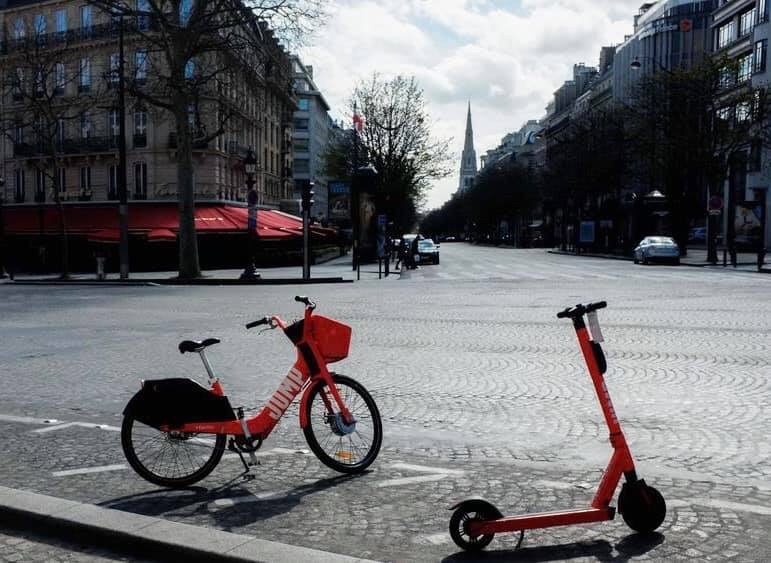 Seules les trottinettes et les vélos rouges, verts sont abandonnés, égrainés et éparpillés dans la rue – vide – tout est sans mouvements.