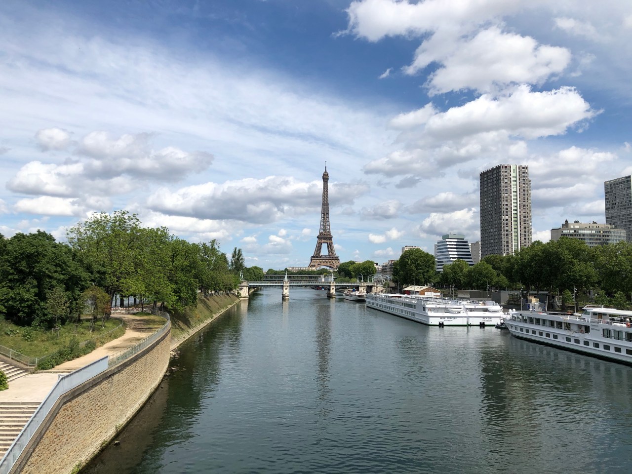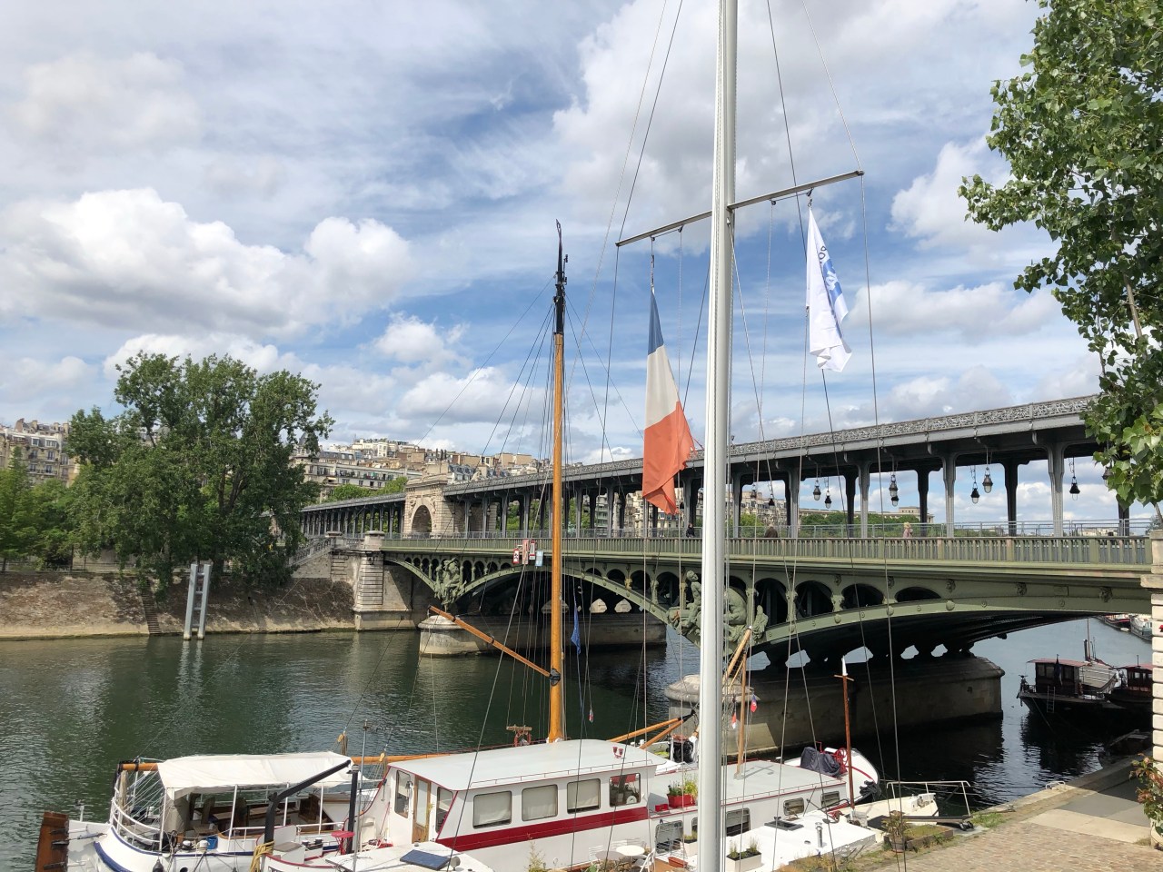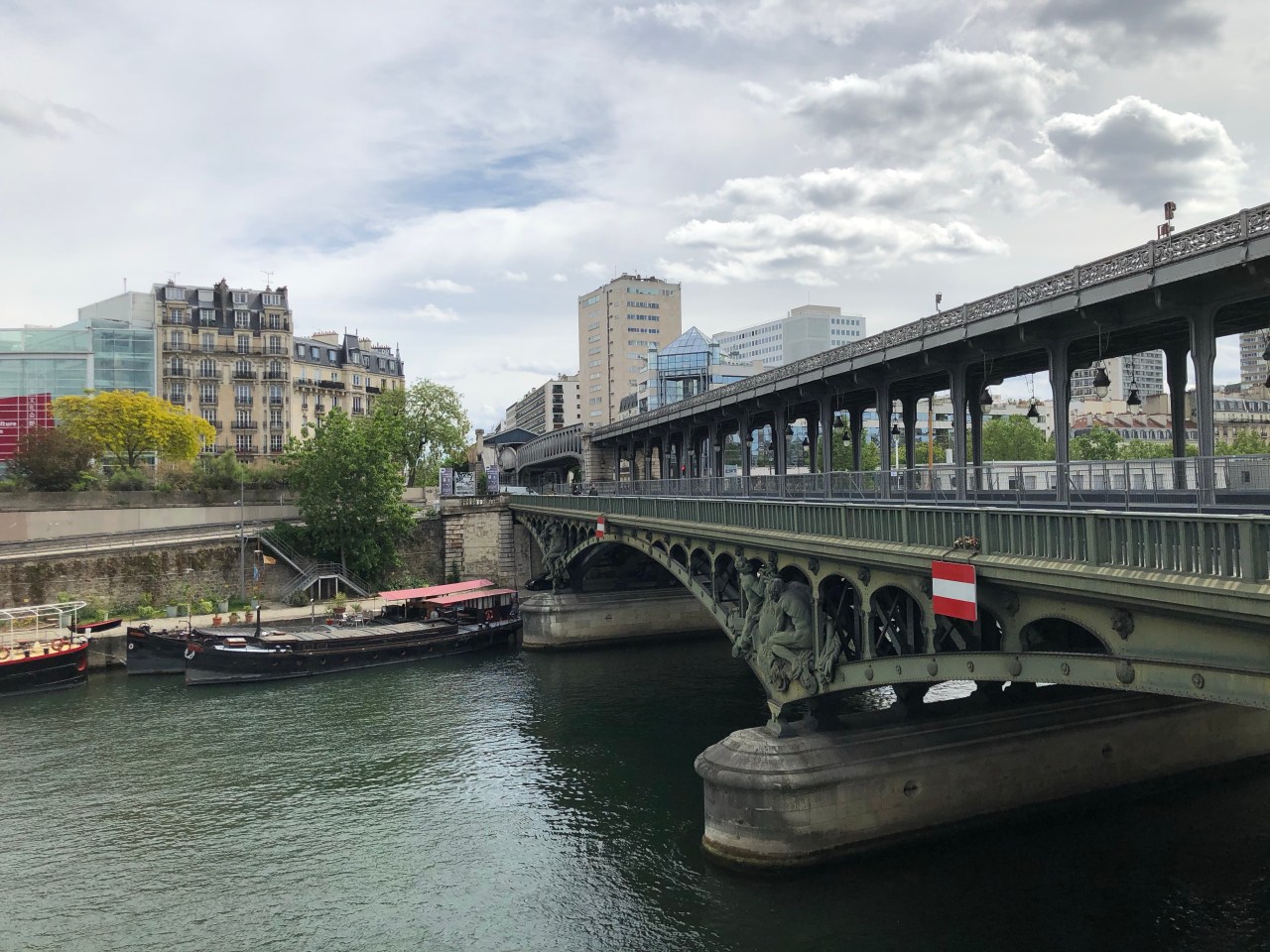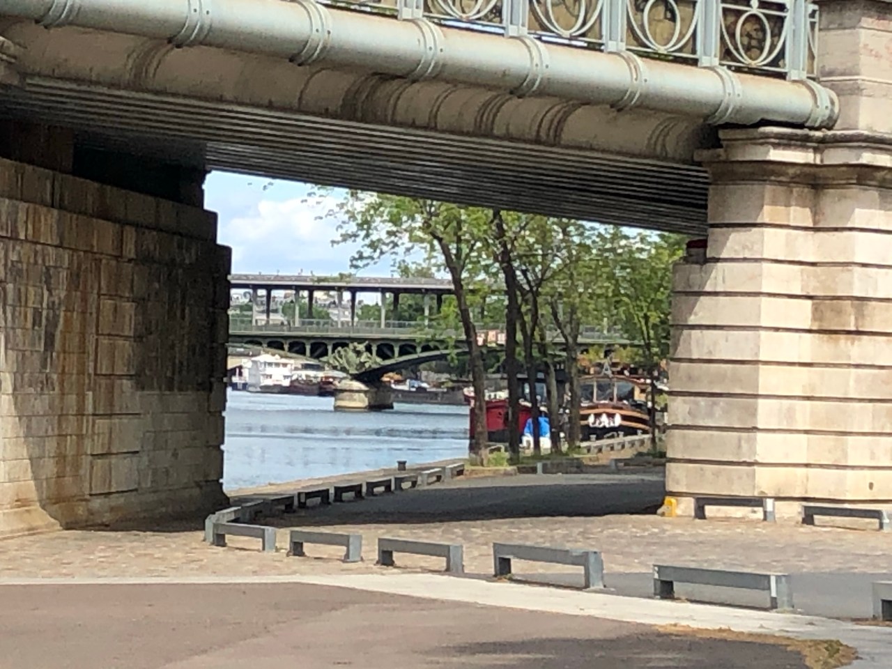 Et puis je décide d’aller suivre mon inspiration le long des quais de la Seine pour rejoindre le pont Bir Hakeim. Je longe les quais et je peux voir tous les bateaux mouches arrimés et vides. Quelques personnes s’activent à les faire briller ou les gardent. Le train de la ligne C passe de temps en temps. Mais là aussi quel calme et pas de piétons. Rien ! Les herbes ont grandi et sont folles. Les coquelicots rouges dansent au gré du vent et l’on se croirait presque dans une prairie. Le silence est d’or. Je passe sous le pont du train en provenance du 16e et j’ai une vue sur le pont Bir Hakeim extraordinaire ! Quant au ciel est il moutonneux et bleu. Là aussi je n’avais jamais vu cela.