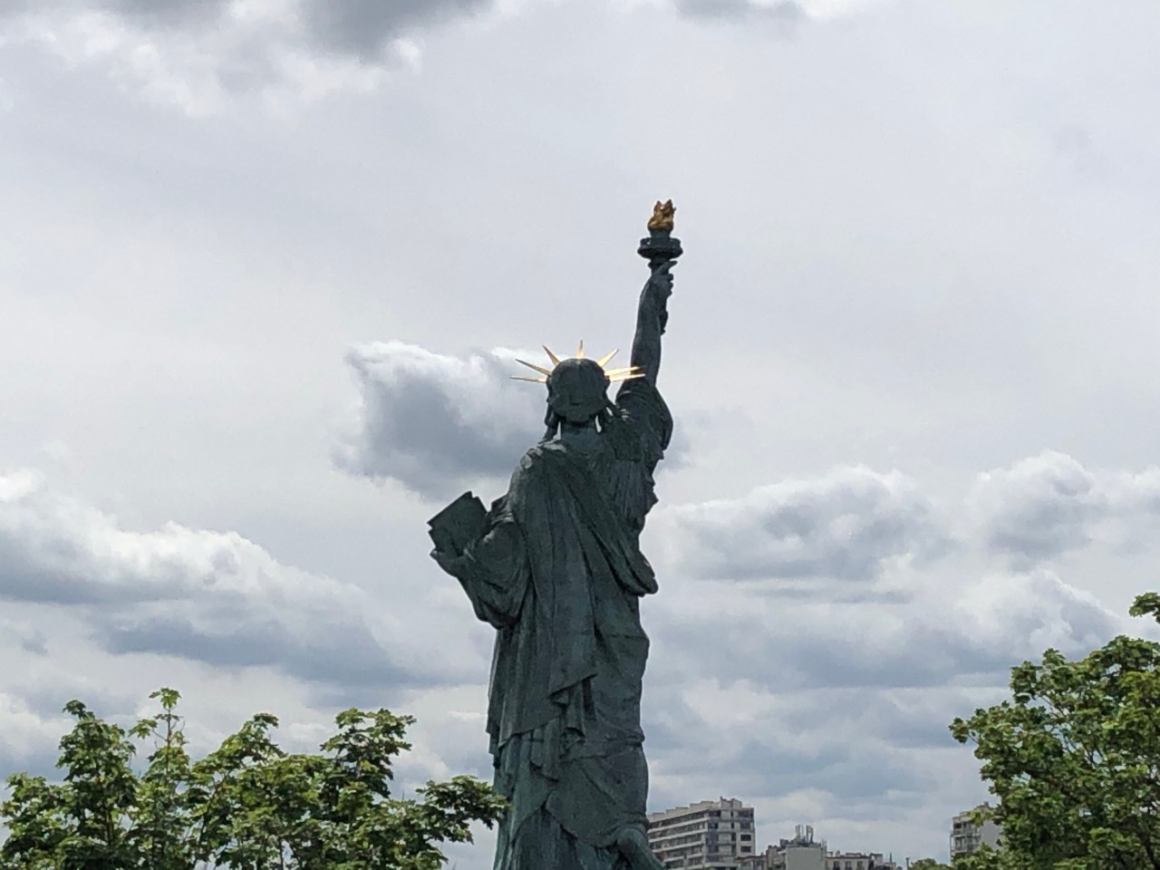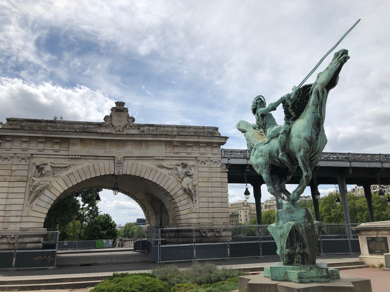 Et la vue pour moi toute seule de la Seine et surtout de la Tour Eiffel. Enchâssée dans les arbres et auréolée de nuages elle se tient droite et digne contre le Covid 19. Et puis sur une placette attachée au pont se trouve une statue supposée représenter Jeanne d’Arc, rebaptisée la France renaissante. Pour éviter tout incident diplomatique avec le Danemark en 1956, inaugurée en 1958, cette statue représente une guerrière en cotte de mailles coiffée d’un casque entouré par une nimbe et brandissant un glaive. Elle chevauche un coursier dont les quatre pieds sont réunis. Cela donne une impression de mouvement. Elle regarde Paris et semble lui lancer un défi – défendre cette belle ville.