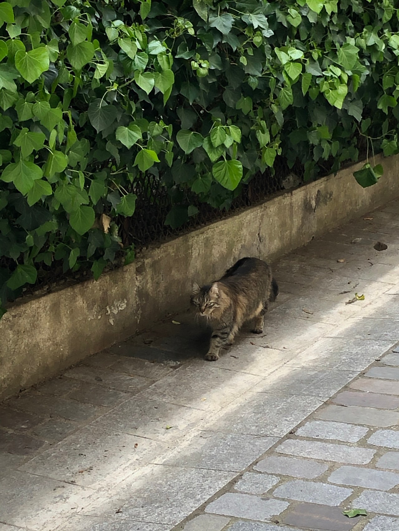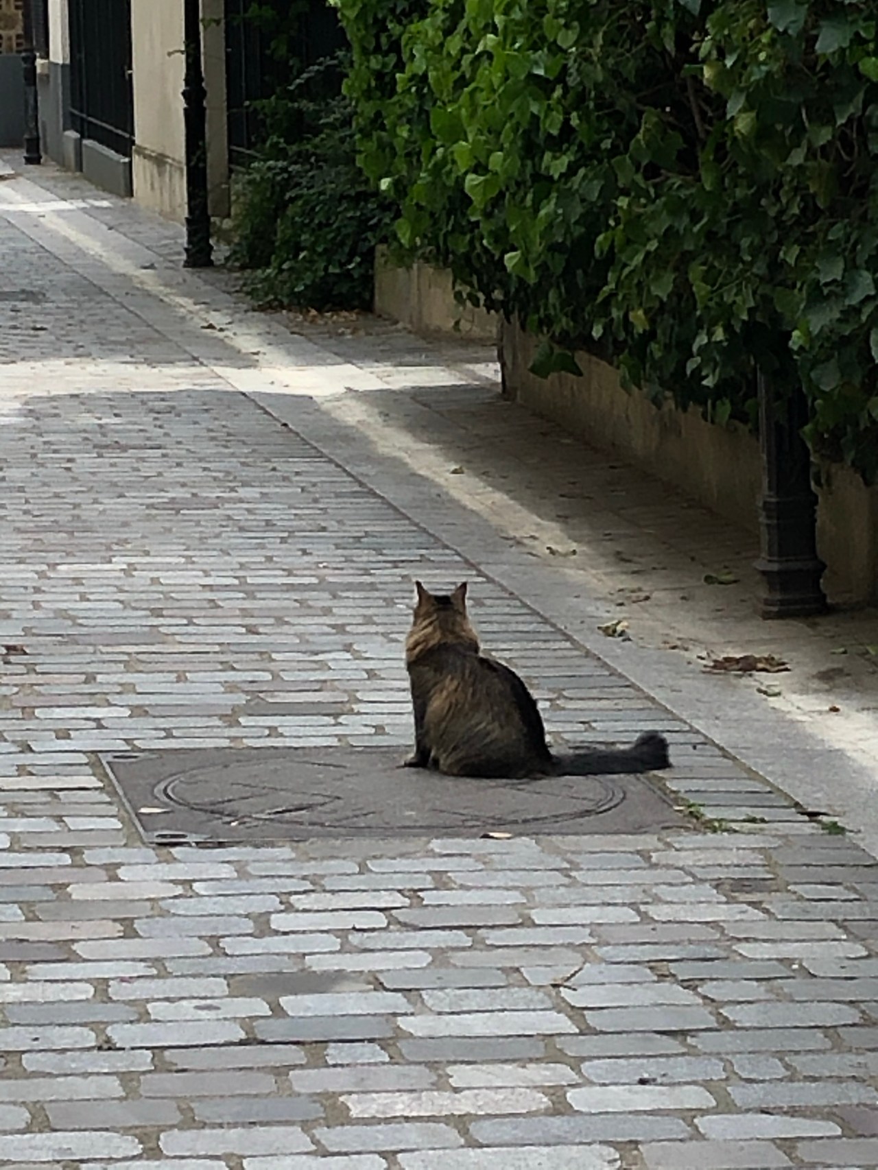 Et puis tranquillement je rentre par des rues et des impasses jusque chez moi. Je rencontre un joli matou marron gris qui d’abord me tourne le dos puis se met en marche et semble ne pas vouloir se faire photographier. Mais rien ne me résiste.