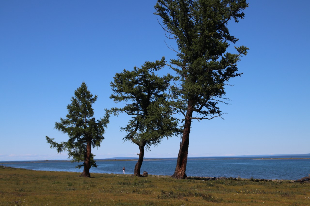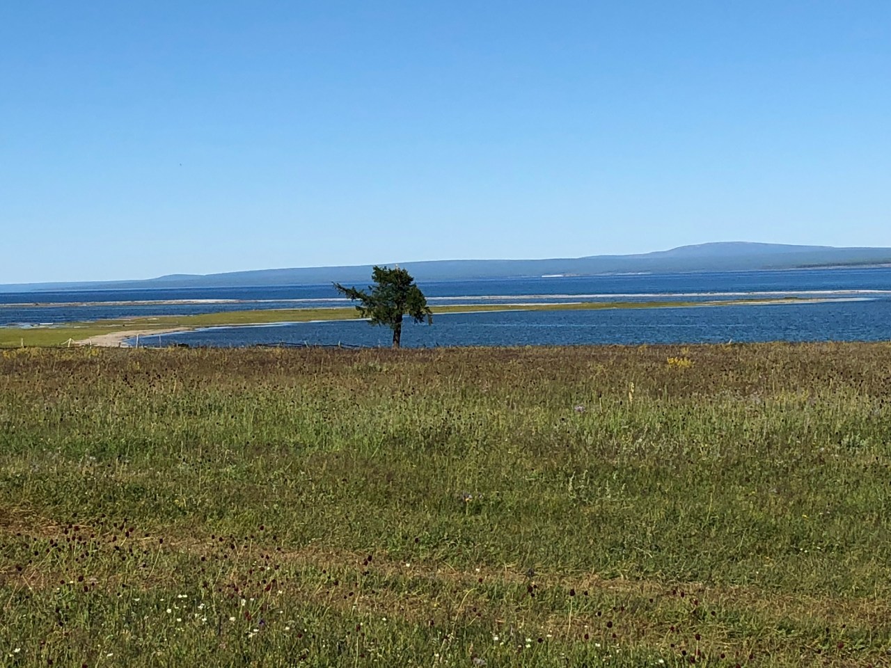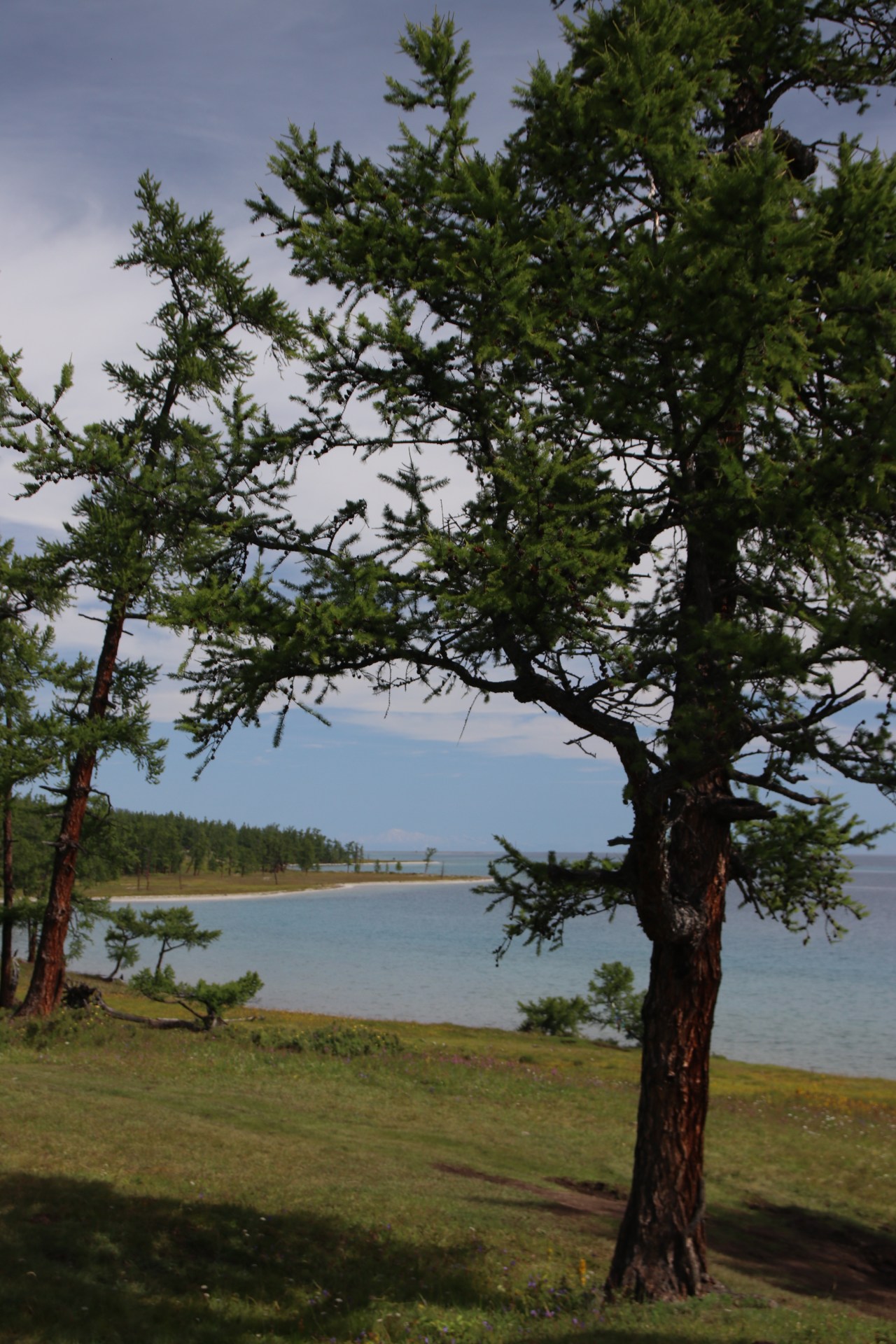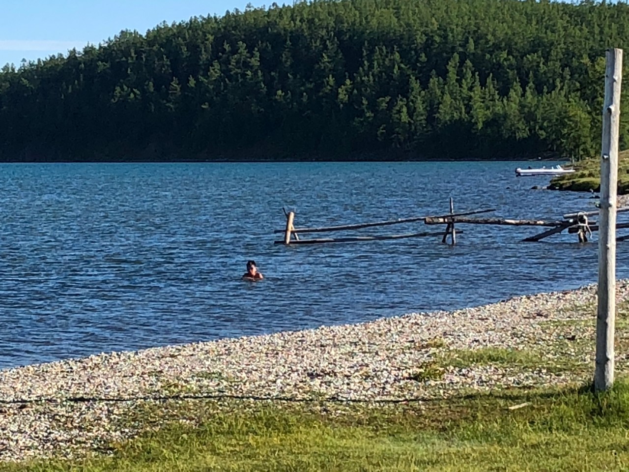 Nous étions arrivés à une cinquantaine de kilomètres de Khatgal sur la rive occidentale. Un endroit magnifique avec une baie et des forêts de mélèzes tout autour. Je pouvais de la yourte regarder les eaux du lac. Il me fallait traverser un champ, trempé par l’eau, pour atteindre le bord du lac et m’asseoir sur un tronc d’arbre sec. De là l’étendue était magnifique. On entendait les clapotis de l’eau, le flux et le reflux des fines vagues qui venaient frapper les galets gris du rebord. L’eau était d’une transparence incroyable, donnant une vision des galets, qui parsemaient ce même rebord du lac. On pouvait sonder la profondeur du lac et sentir les ondes de l’eau.