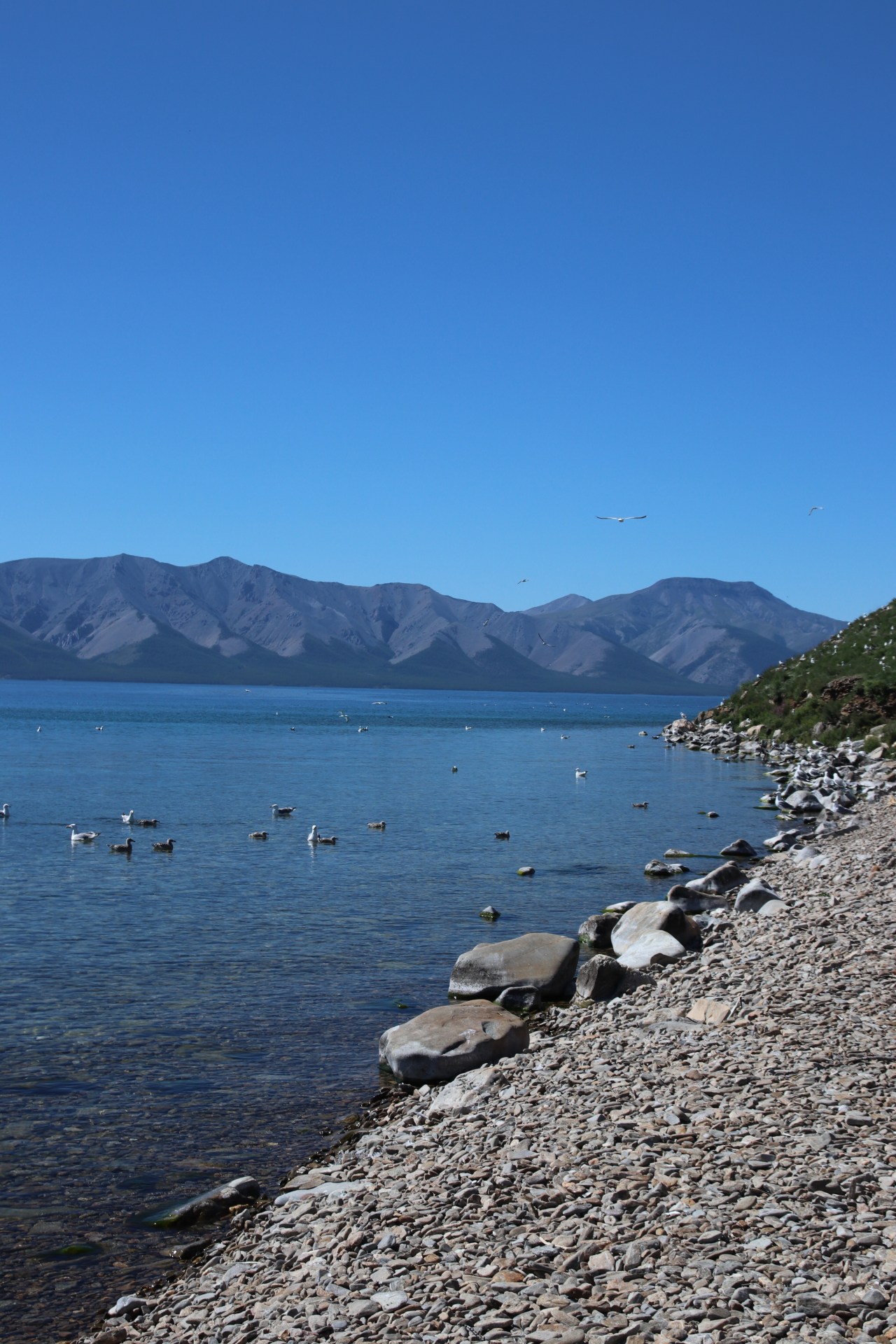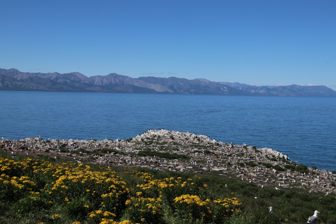 J’ai aussi le plaisir de longer une baie ou deux pour profiter du paysage, comme mes balades sur le Baïkal. Des moments de quiétude et de liaison directe à la nature – contact spirituel voire chamanique. Mon seul regret est de ne pas avoir fait du bateau et de canoter le long du lac khövsgöl pour pousser plus haut et découvrir d’autres coins plus solitaires. La seule balade en bateau fut celle vers l’ile aux oiseaux. Rien de folichon : des mouettes, des sortes de goélands jeunes ou adultes peuplaient cet endroit. Les jeunes avaient encore leur plumes ou duvet gris. Un bruit assourdissant crevait les tympans et je n’avais qu’une envie – fuir ce raffut !