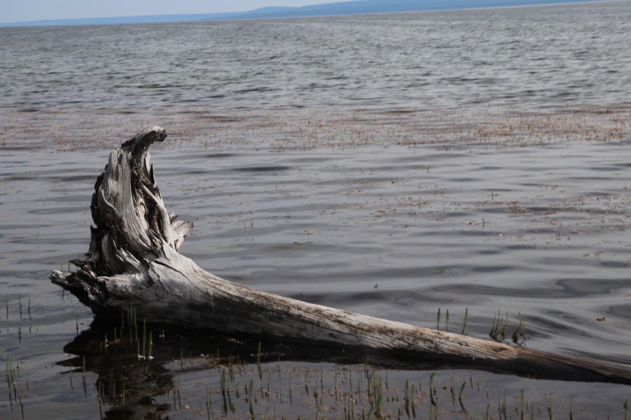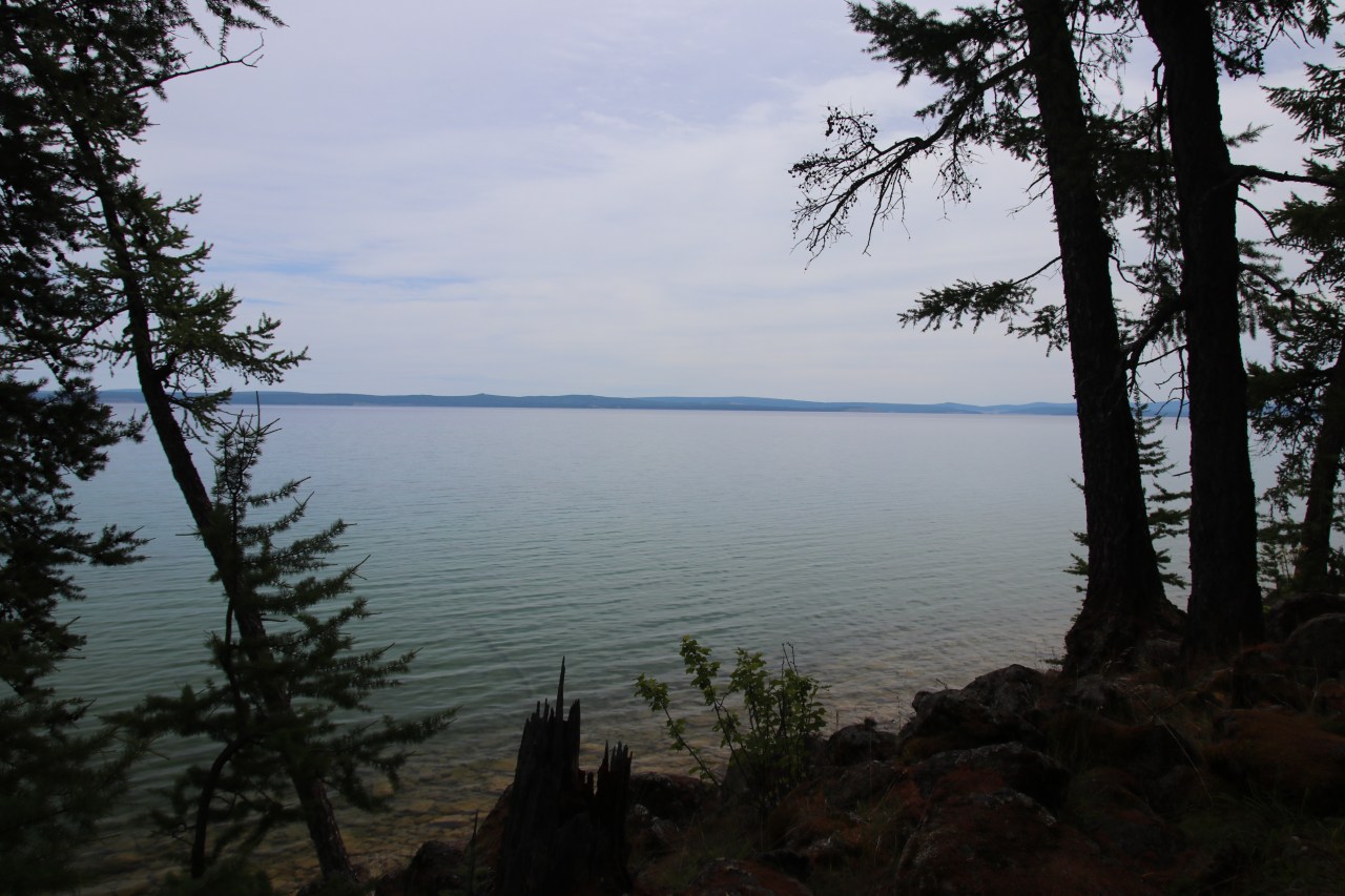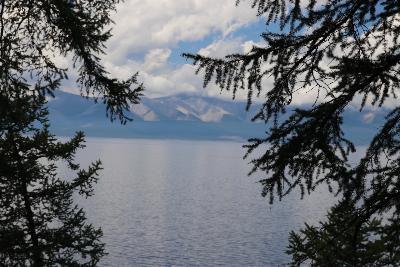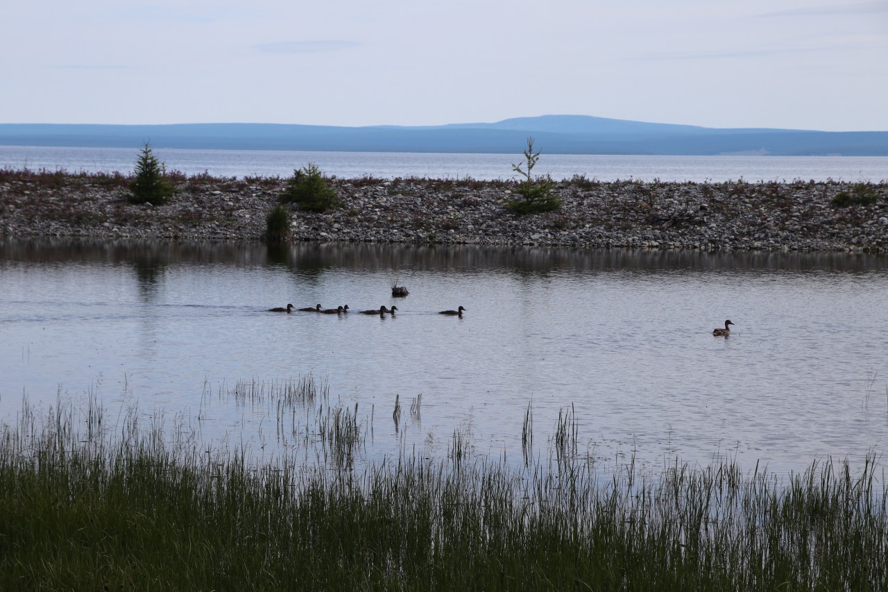 Le paysage ressemblait beaucoup à celui du Baïkal. La côte occidentale formée de montagnes hautes, karstiques qui ne laissaient pousser aucun arbre. De loin on pouvait penser qu’elles tombaient à pic sur le lac et venaient s’échouer comme d’immenses baleines. Selon l’inclinaison du soleil la roche se reflétait et devenait sablonneuse ou bien plus grise. Seule l’avancée, vers le lac, permettait aux mélèzes de pousser et rendait la côte verdoyante. Tout le long, se sont formés des petits lacs intérieurs, où des canards sauvages voguaient. Une famille complète – mère et petits se suivaient à la queue leu leu. L’endroit était beaucoup plus calme et serein pour de jeunes débutants, ils flottaient tranquillement en suivant les préceptes de leurs mères.