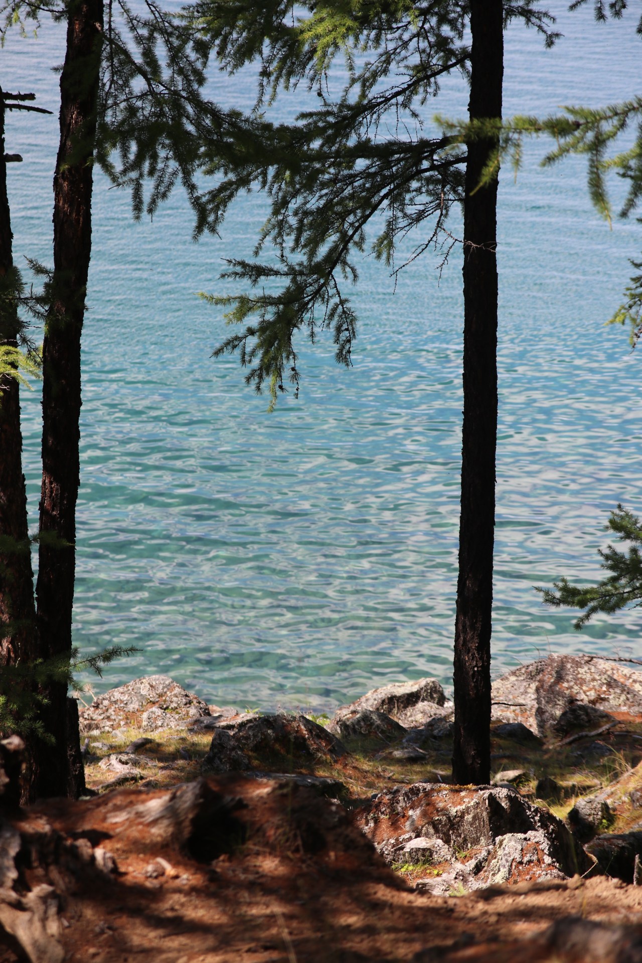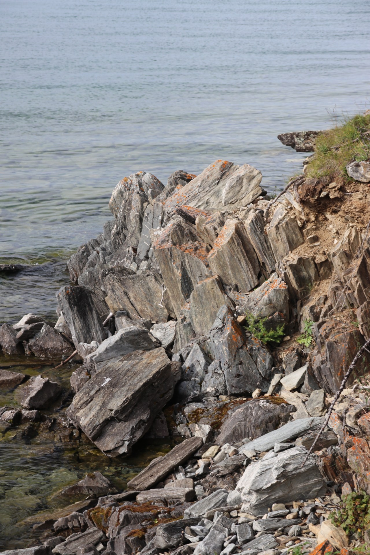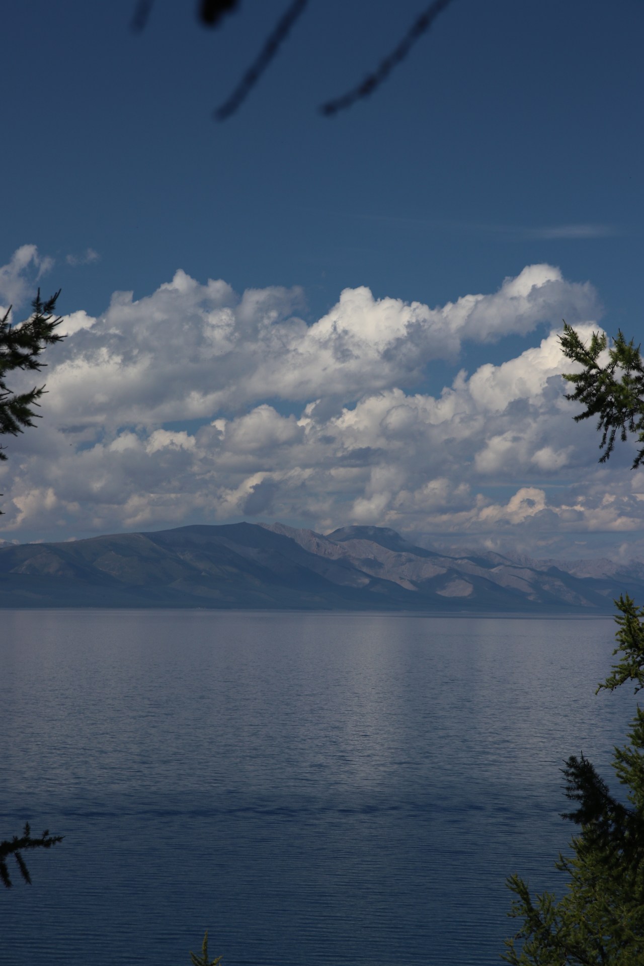 Le paysage ressemblait beaucoup à celui du Baïkal. La côte occidentale formée de montagnes hautes, karstiques qui ne laissaient pousser aucun arbre. De loin on pouvait penser qu’elles tombaient à pic sur le lac et venaient s’échouer comme d’immenses baleines. Selon l’inclinaison du soleil la roche se reflétait et devenait sablonneuse ou bien plus grise. Seule l’avancée, vers le lac, permettait aux mélèzes de pousser et rendait la côte verdoyante. Tout le long, se sont formés des petits lacs intérieurs, où des canards sauvages voguaient. Une famille complète – mère et petits se suivaient à la queue leu leu. L’endroit était beaucoup plus calme et serein pour de jeunes débutants, ils flottaient tranquillement en suivant les préceptes de leurs mères.