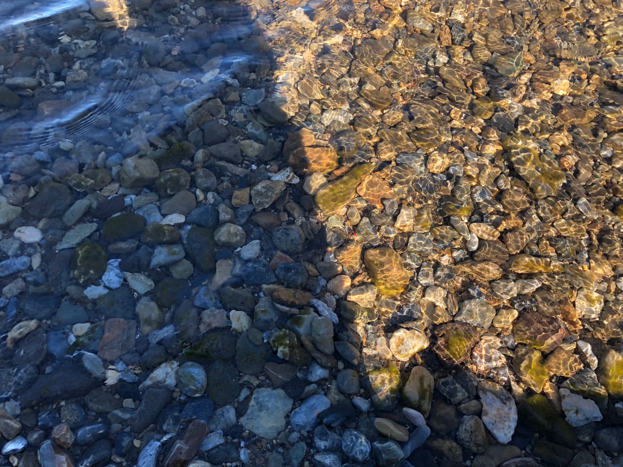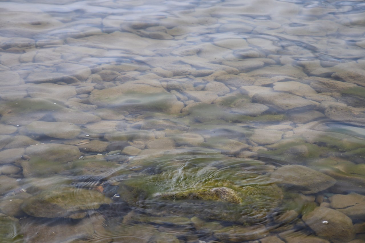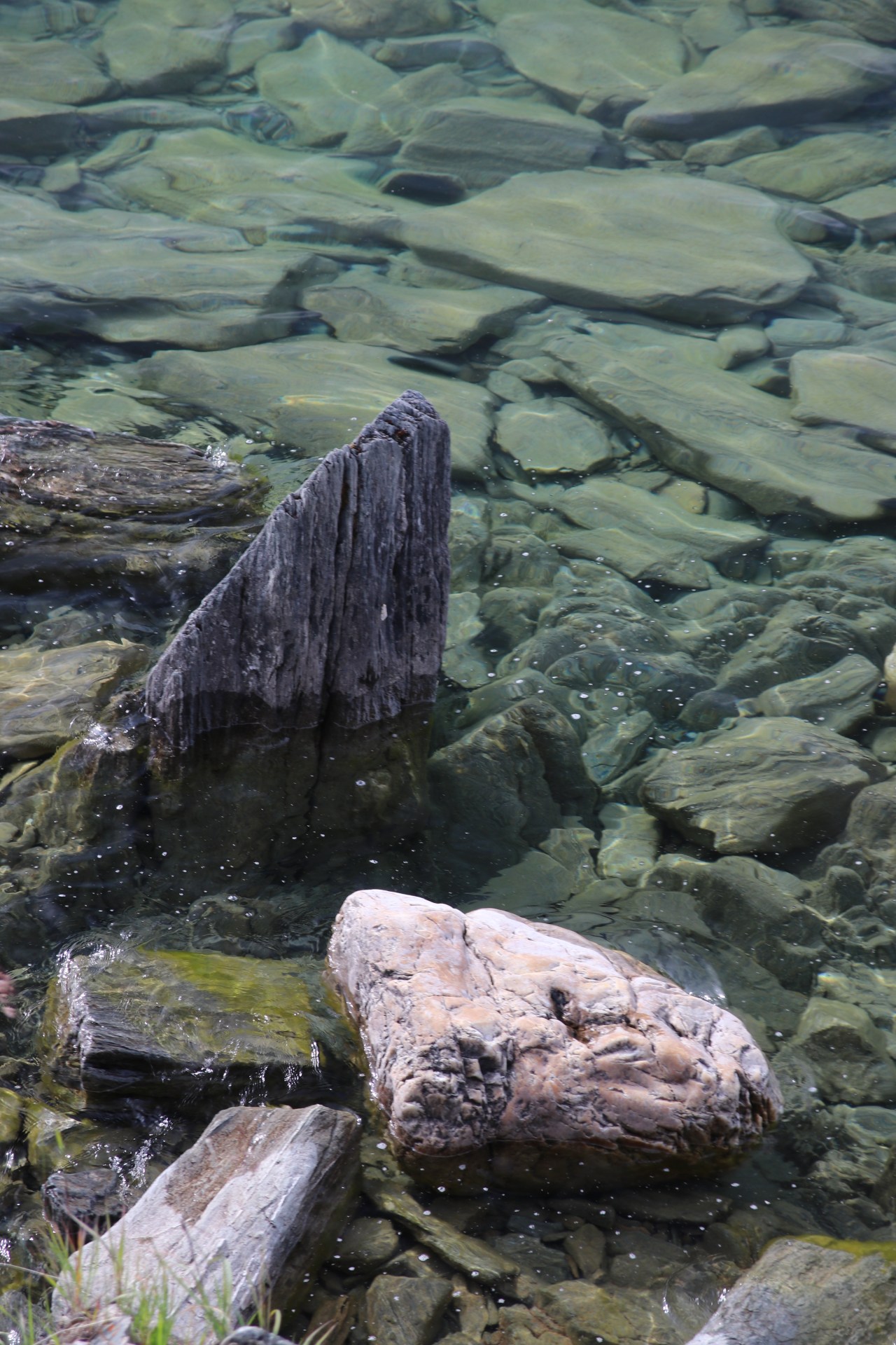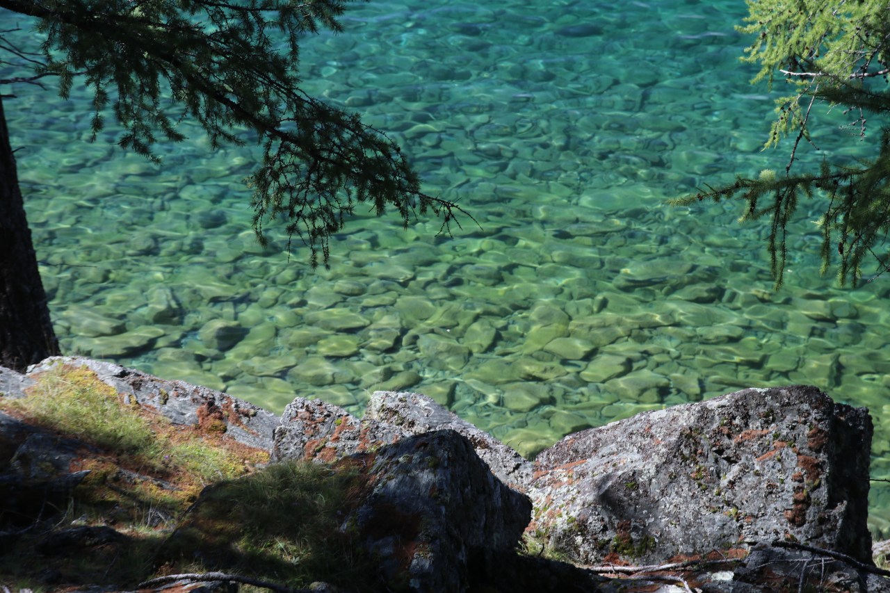 Et puis je pouvais voir l’eau verte du lac, au pied des falaises, qui me donnait une envie folle de plonger, tellement elle ressemblait aux eaux tropicales, moins la chaleur. Je me suis assise sur un gros rocher pour regarder cette eau qui me faisait follement envie. Je pouvais apercevoir les gros galets qui tapissaient le fond. La couleur en était douce et attirait les yeux. Comme vous aimantant. Cela ne m’a pas empêché de mettre mes pieds dans l’eau glacée du lac. Mais pas longtemps car ils gèlent très vite !