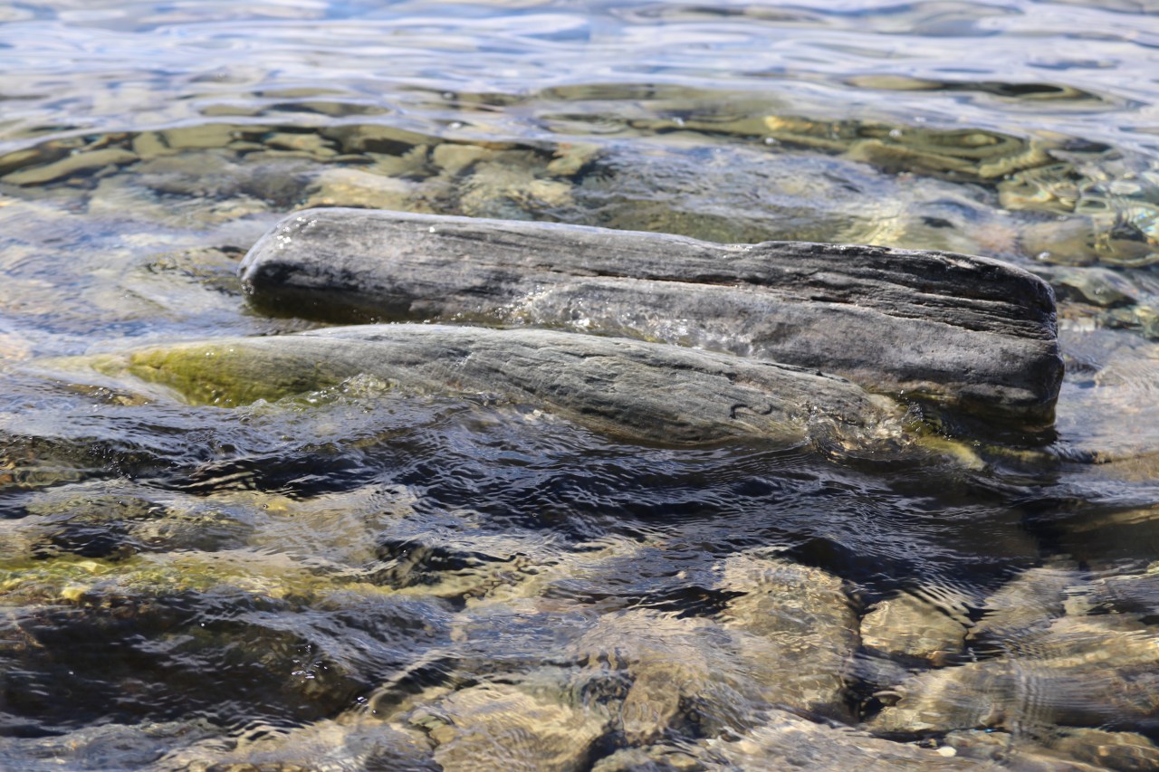 Puis comme par miracle le soleil refit surface et le lac repris une couleur acier souriant et ensoleillé. J’eus ainsi le temps de partir en éclaireur pour visiter les abords du lac. On aurait cru la chaussée des géants en miniature avec ses pierres taillées empêchant toute progression le long du lac. Je pouvais regarder le fond du lac et voir les pierres de granit à plat ou bien taillé comme des ailes de requins qui nage à la surface de l’eau. Décor impressionnant et peu accueillant. Au bout de la baie se trouvait un cairn, sorte de carré fait de pierres rectangulaires, posées les unes sur les autres, par deux à chaque étage.