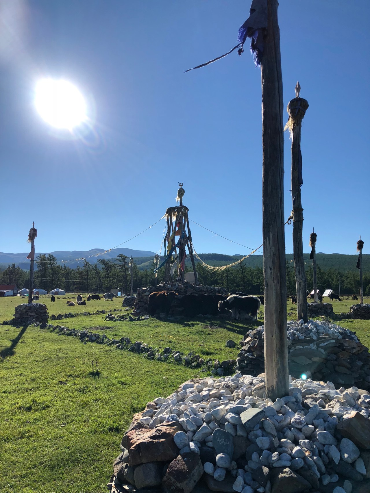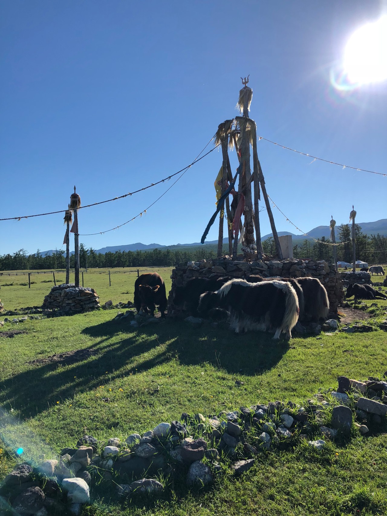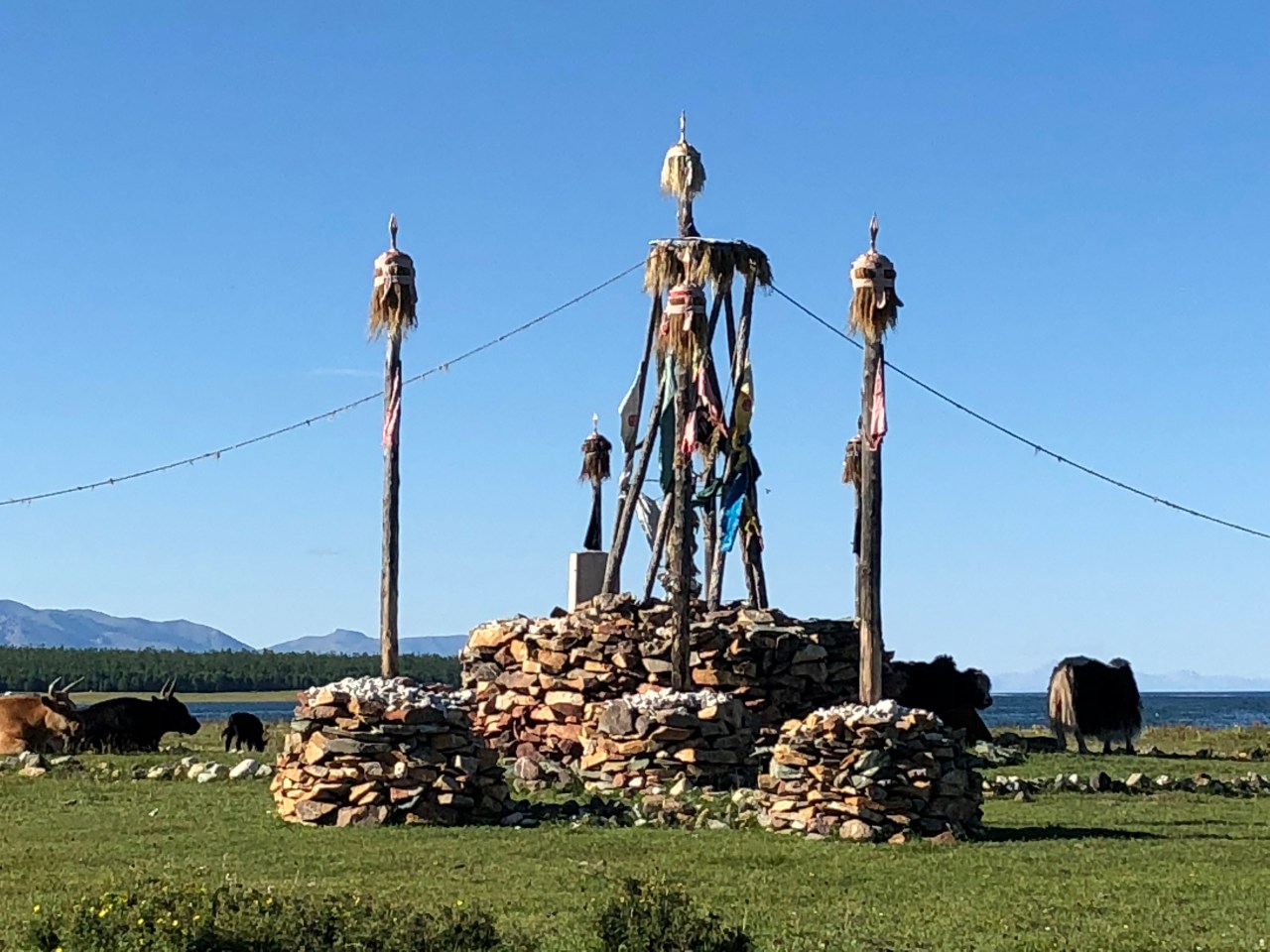 Puis je suis partie à la découverte d’un site chamanique – lieu incroyable planté près du bord du lac. Ce site était composé de petits monticules et d’un grand au centre. Des tiges étaient plantées dans les monticules et étaient faites de bois immenses, enturbannés de rubans multicolores et surmontés d’une sorte de « casque gaulois » de tissus pendants et d’une sorte de flèche en pointe au-dessus. On aurait dit des crins de queues de chevaux ou de yak qui pendaient de chaque casque. Celui du milieu avait les tiges qui se croisaient. Elles étaient au nombre de quatre autour de la tige centrale et identiquement revêtues du casque de crin. Elles étaient reliées entre elles par des fils et au sol des rectangles étaient dessinés autour des monticules pour rendre le site encore plus miraculeux ! Seules les vaches, les yaks se moquaient bien du lieu et des croyances qui lui étaient attribuées. Ils broutaient tranquillement l’herbe bien verte et se couchaient entre les monticules. Sorte de prières animales ! Rien ne les arrêtait et ils faisaient partie du décor, ornant et accompagnant de leurs corpulences et de leurs excréments le lieu sacré. Je dois dire que cela était assez rigolo à voir et enlevait tout sens religieux à cet endroit. Insolite et mystique en même temps.