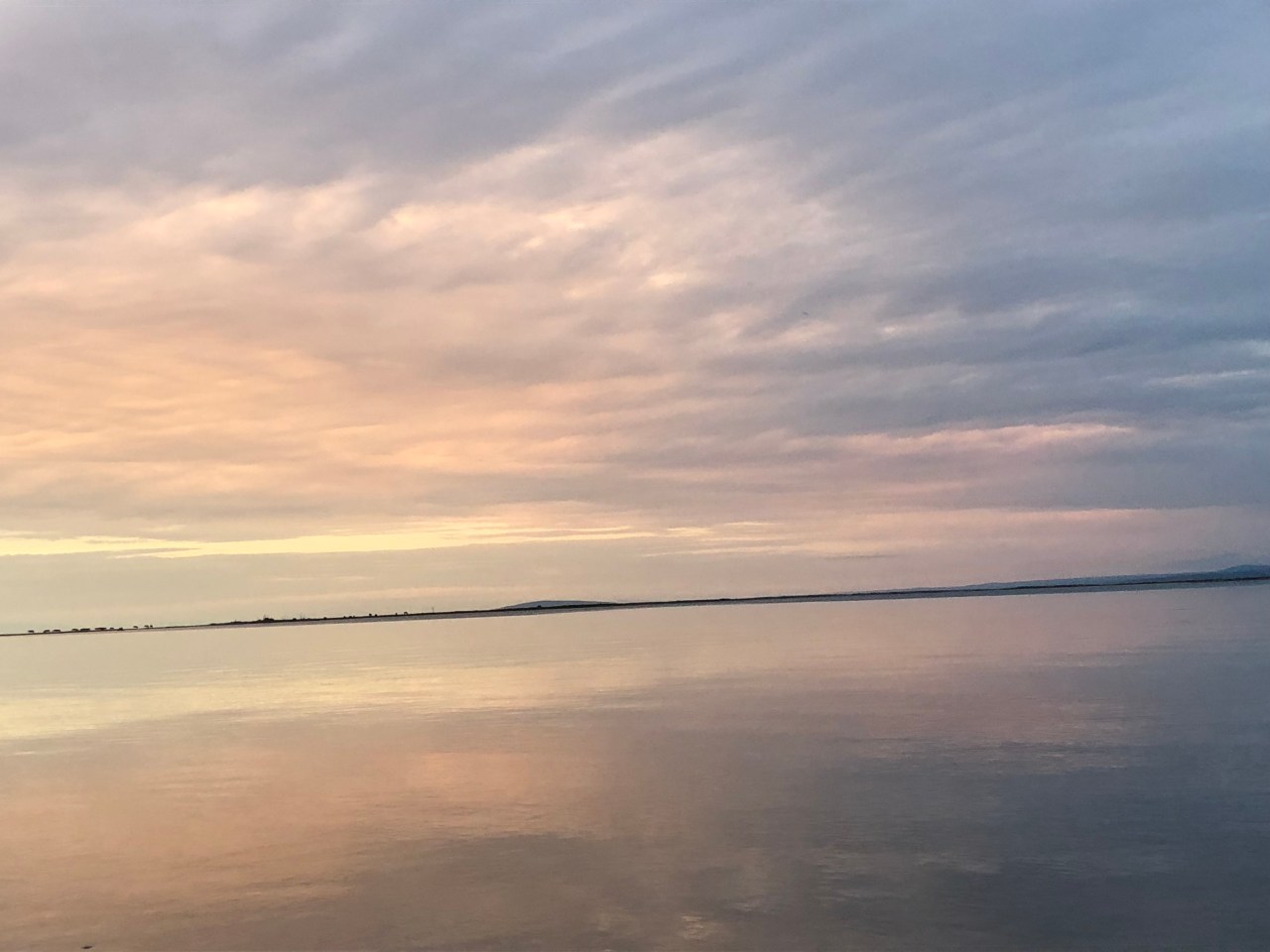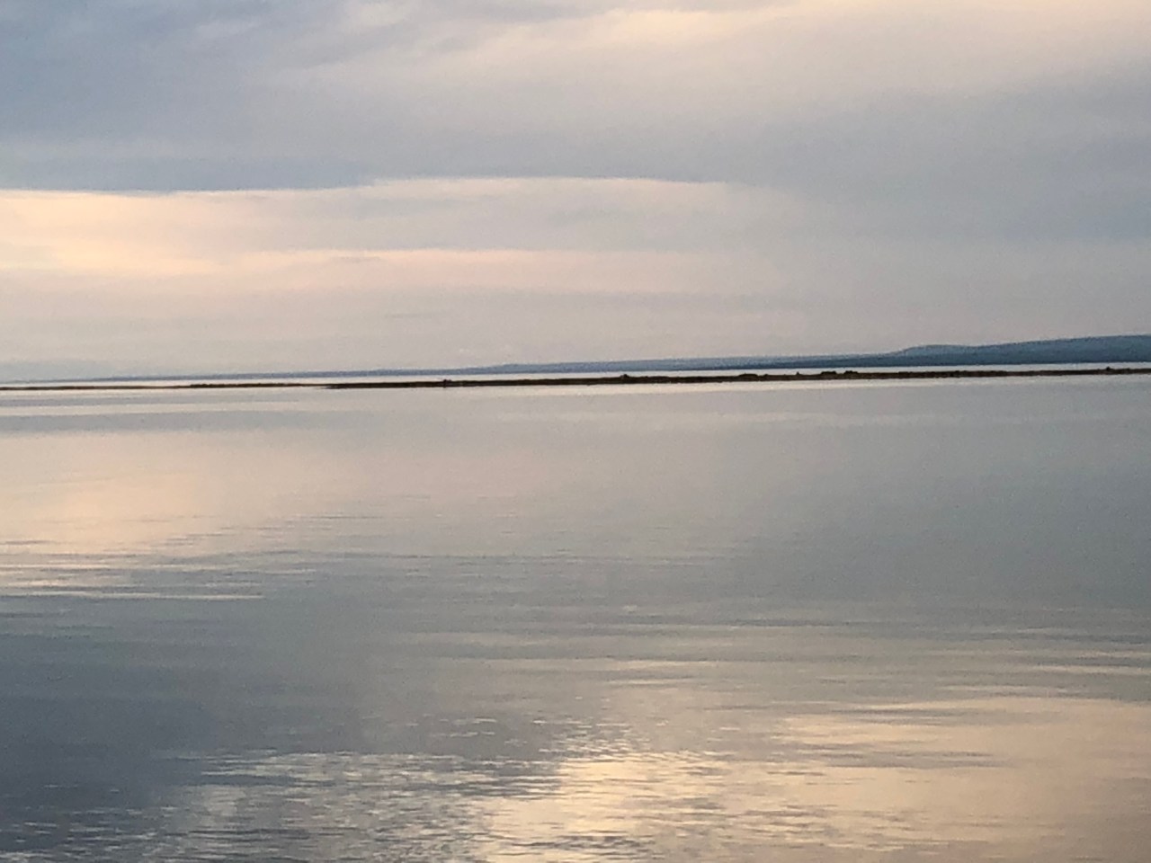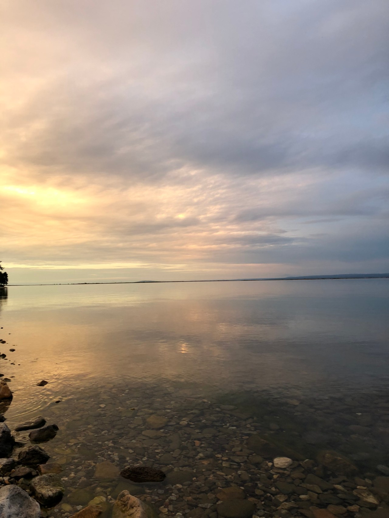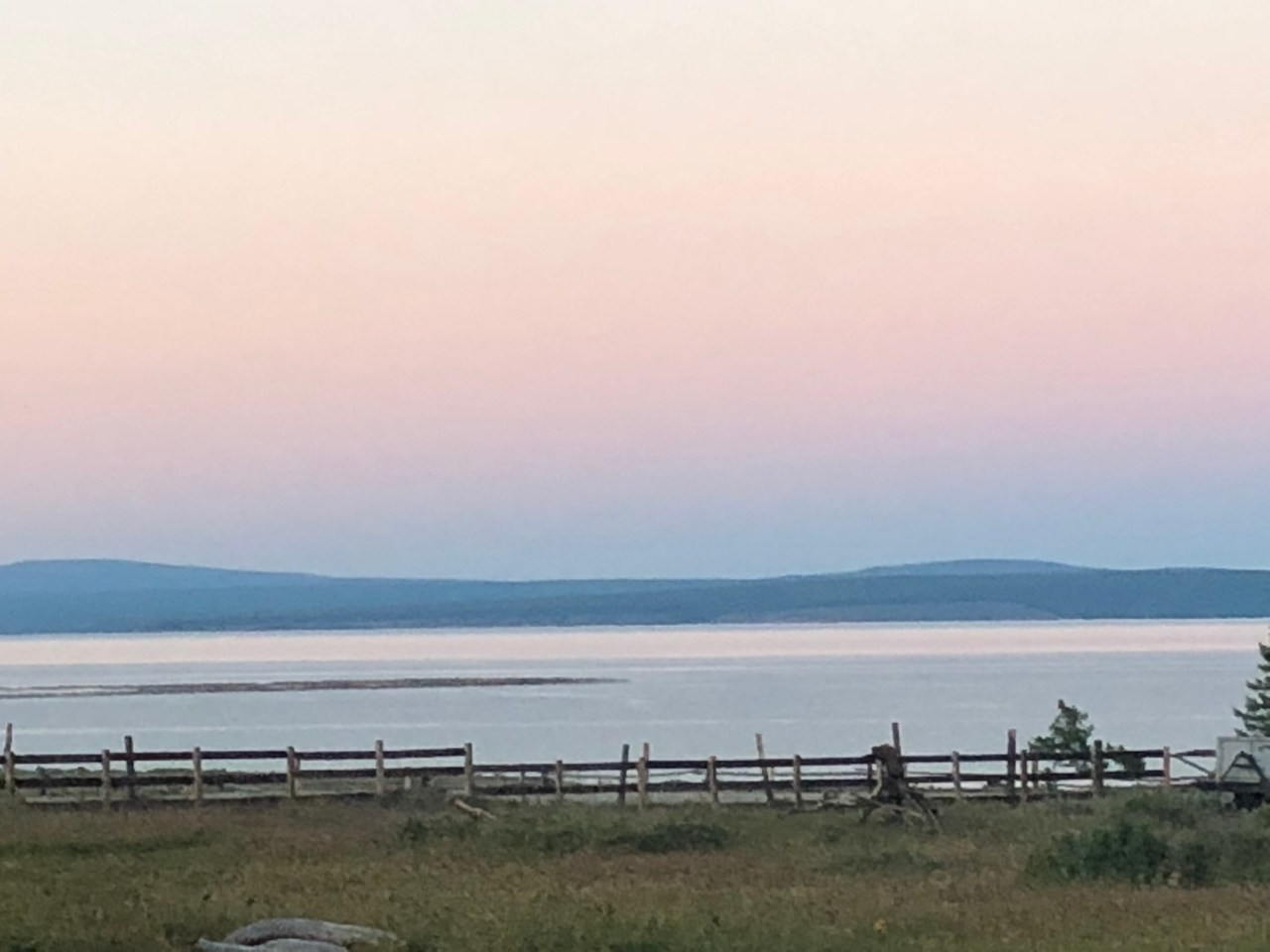Mais je préférais à nouveau rejoindre le bord du lac pour en humer les beautés, sentir le vent se glisser autour de moi et écouter le doux clapotis des vagues. Je ne me lassais pas de l’endroit et me suis assise sur une espèce de planche à même le sol. Je suis restée longtemps à écouter le vent souffler autour de moi et surtout ce clapotis bienveillant qui ne se tarissait pas. Comme une berceuse qui doucement me chantait une chanson et me liait à la nature paisible du lac. Un vrai bonheur que de se laisser glisser dans cet enchantement et de regarder les galets sur le bord du lac dont l’eau transparente laissait le soleil se refléter. Puis le froid est revenu et je suis repartie vers le camp. Le coucher de soleil étreignait le lac et moi avec. Toutes les nuances de mauve, rose et gris s’entrelaçaient et par là-même m’embrassaient de leurs beautés.