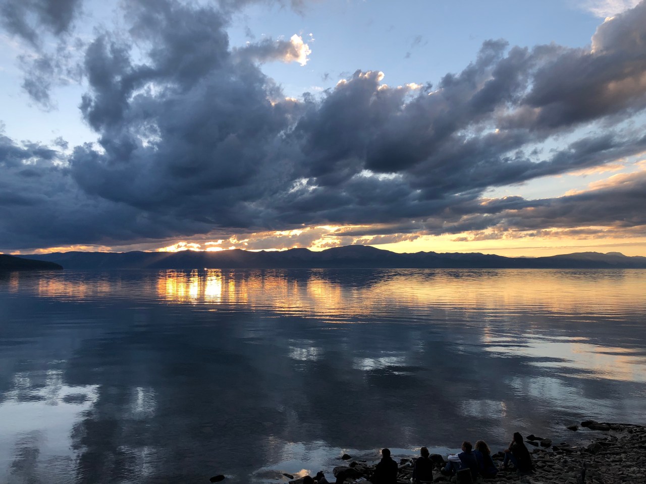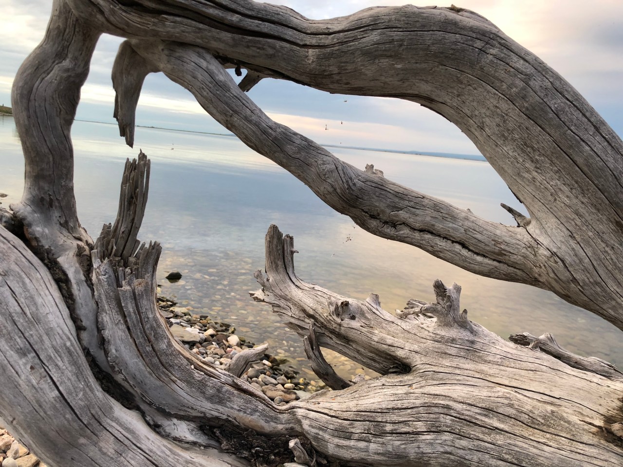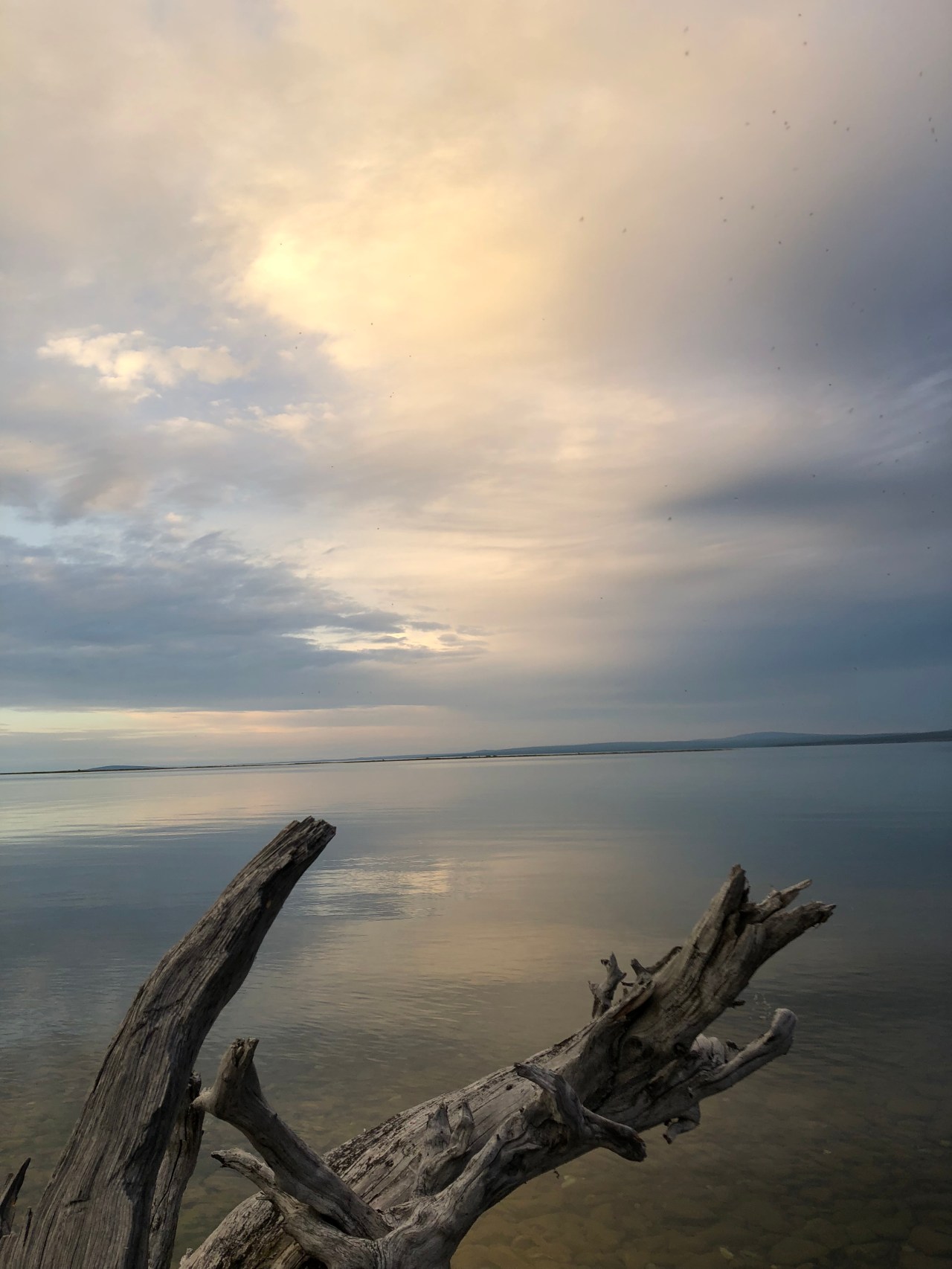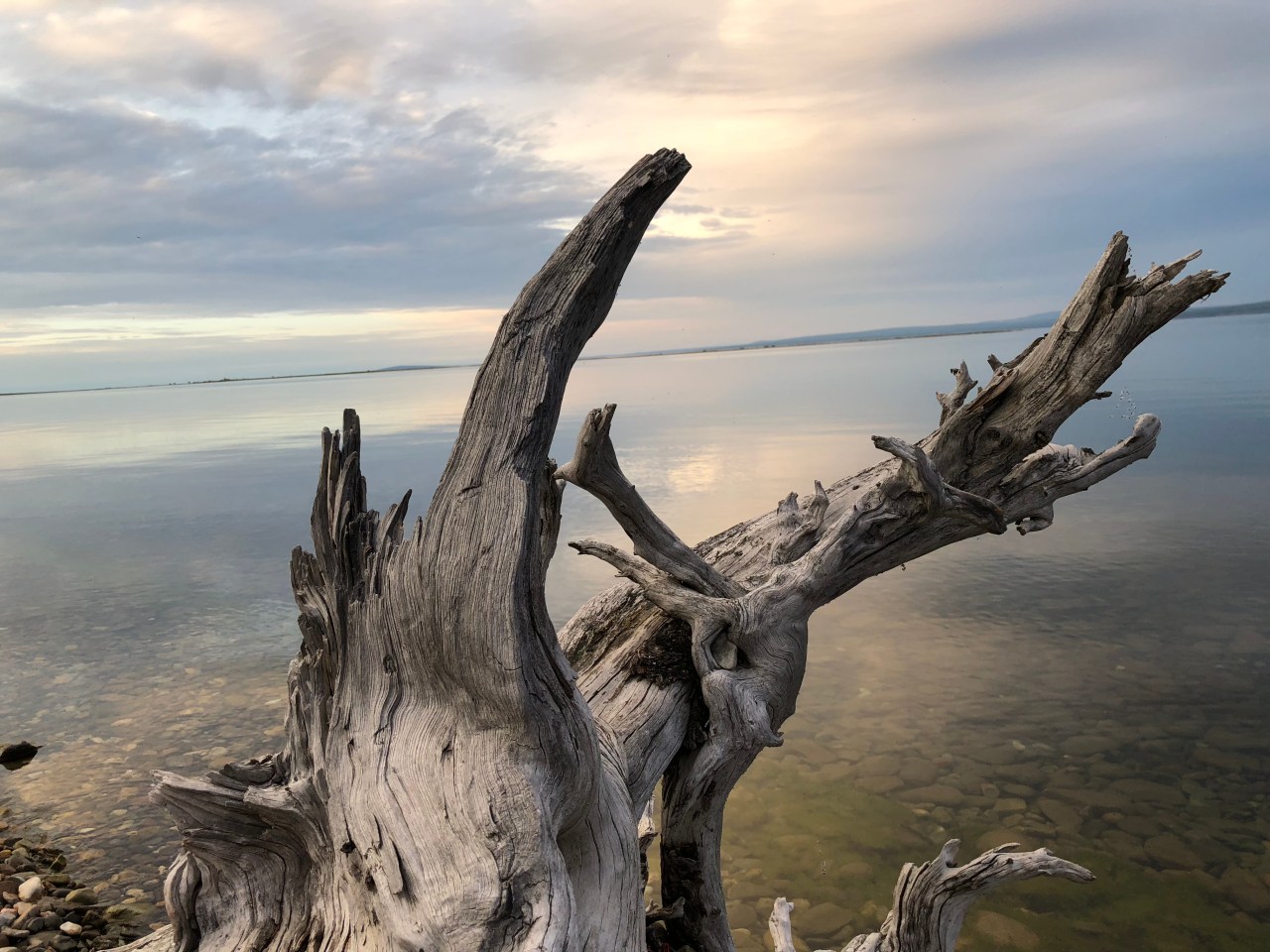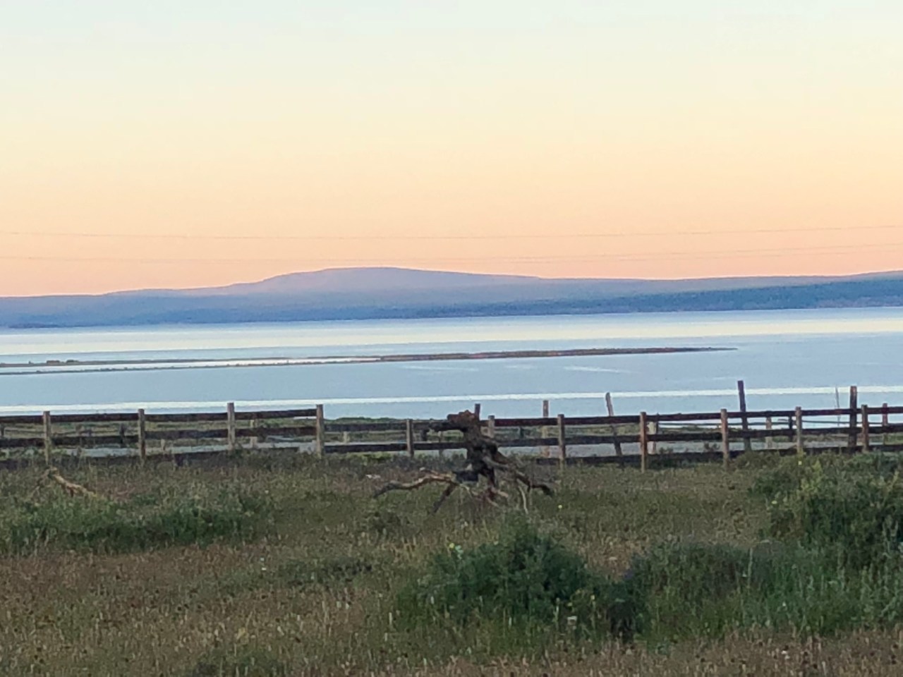 Mais je préférais à nouveau rejoindre le bord du lac pour en humer les beautés, sentir le vent se glisser autour de moi et écouter le doux clapotis des vagues. Je ne me lassais pas de l’endroit et me suis assise sur une espèce de planche à même le sol. Je suis restée longtemps à écouter le vent souffler autour de moi et surtout ce clapotis bienveillant qui ne se tarissait pas. Comme une berceuse qui doucement me chantait une chanson et me liait à la nature paisible du lac. Un vrai bonheur que de se laisser glisser dans cet enchantement et de regarder les galets sur le bord du lac dont l’eau transparente laissait le soleil se refléter. Puis le froid est revenu et je suis repartie vers le camp. Le coucher de soleil étreignait le lac et moi avec. Toutes les nuances de mauve, rose et gris s’entrelaçaient et par là-même m’embrassaient de leurs beautés.