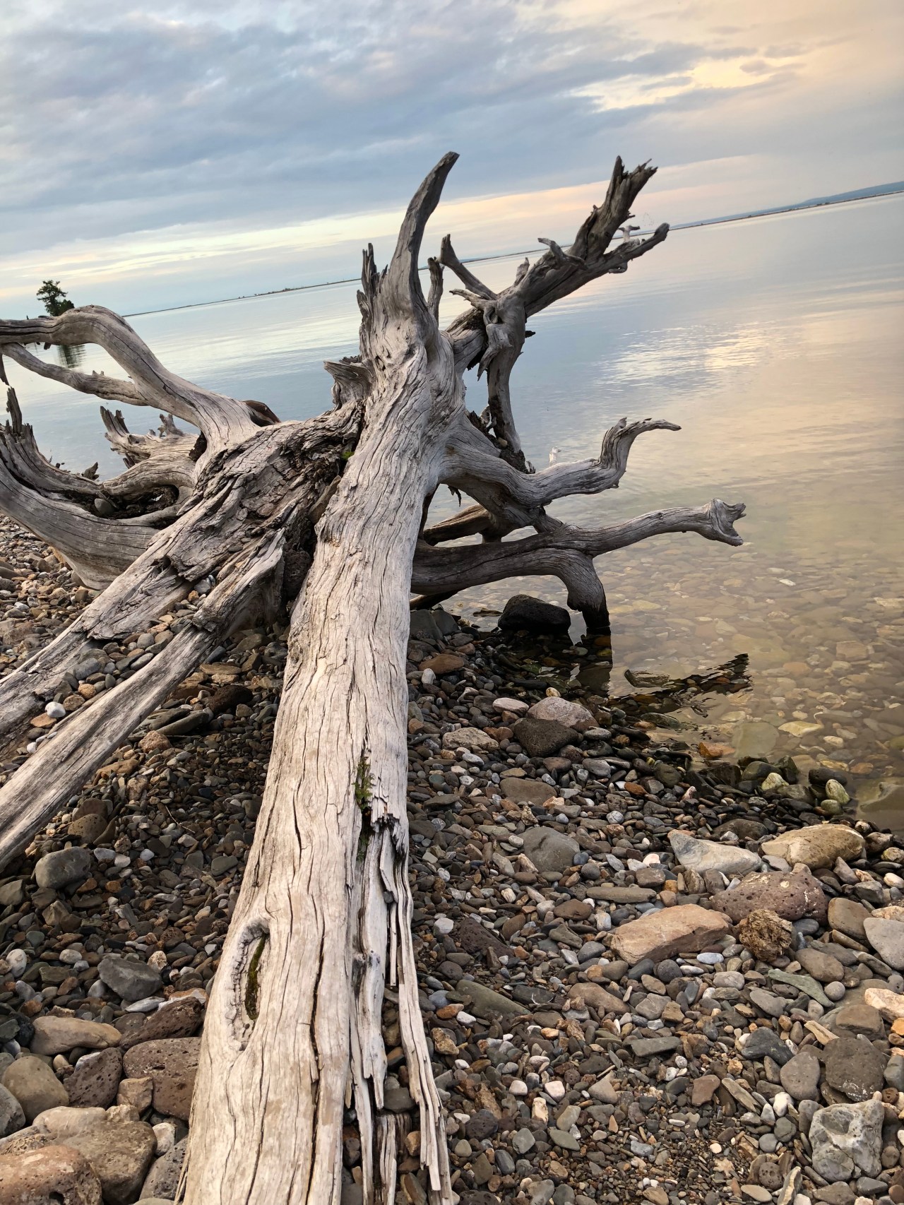 Un autre monde vous entoure aussi : celui des arbres morts, des troncs dans l’eau et des racines tête-bêche ou bien en l’air qui regardent le ciel. Des spectacles se réalisent alors devant vous et refont le paysage. On peut tout imaginer : des tentacules qui essaient d’attraper les nuages, qui se tendent vers le ciel pour échapper à leur sort – celui d’être mouillé et de pourrir dans le lac ; ou bien ils s’enchevêtrent les uns dans les autres pour ne plus former qu’un – les racines s’entortillant et se soutenant pour éviter de s’affaisser et d’être engloutis définitivement dans le lac; d’autres ressemblent à des baleines sortant de l’eau pour souffler en retombant lourdement ; d’autres ont des formes qui créent des tableaux et permettent entre deux racines de voir le lac ou le ciel – à vous de choisir ce que vous désirez ! ; et puis d’autres ont les racines plantées dans les galets et la moitié du tronc sectionné en plein élan de vie. Juste impressionnant ce que la nature peut créer et en même temps anéantir.