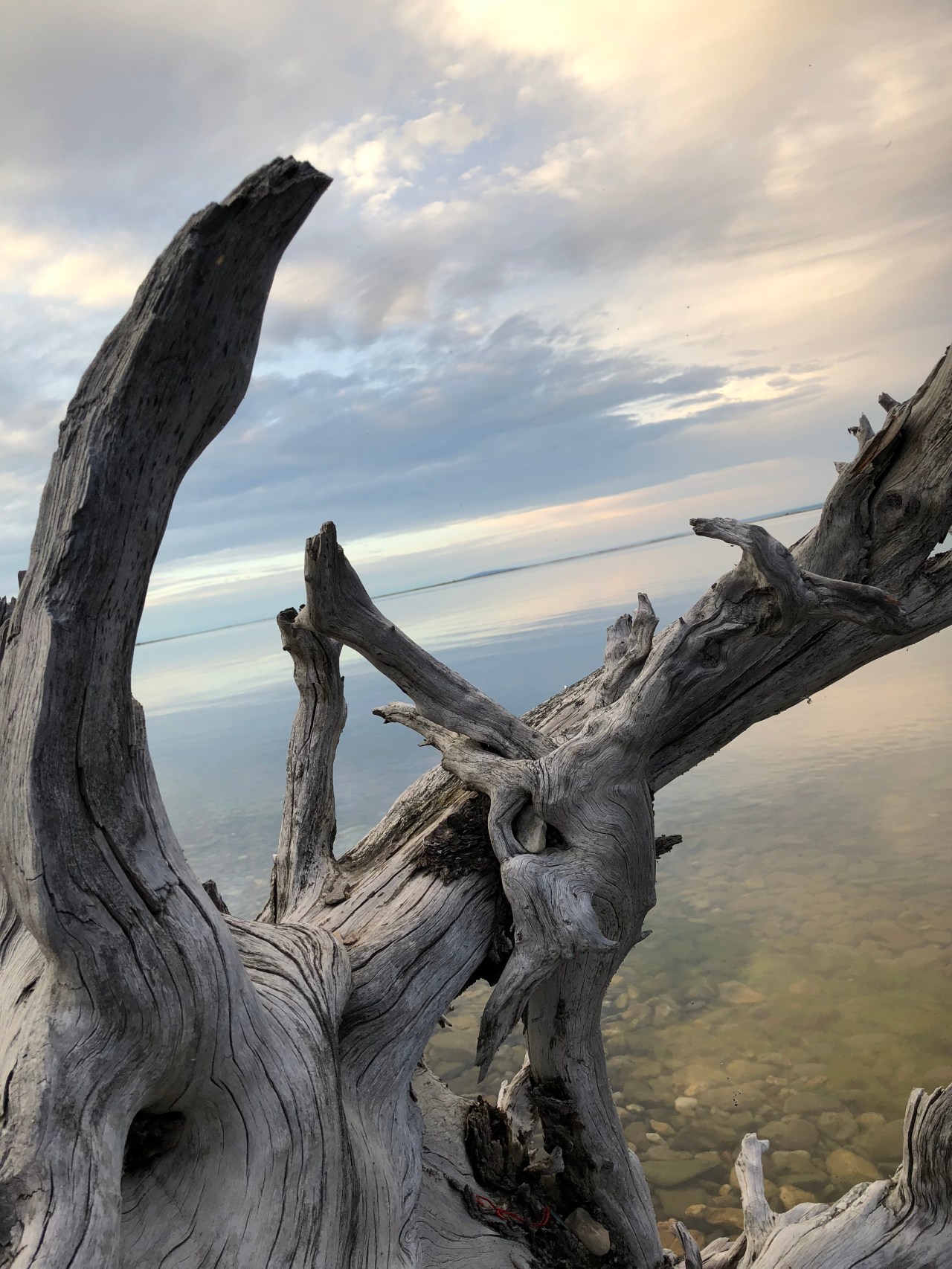 Je me suis promenée histoire de découvrir le coin : les forêts étaient plantées sur des terrains sablonneux et remplis de pins. Le sol était recouvert des épines des pins, des troncs d’arbres déracinés à moitié pourris rendant le paysage triste et désolant. La jetée du lac était faite de galets et les arbres plongeaient directement dans ce dernier. Certains étaient couchés dans l’eau et me permettait de m’asseoir pour regarder la vue. On se serait cru dans un paysage de désolation, de solitude grandiose et d’abandon de la nature. Rien de bienveillant ! Pourtant tout vous poussait à rester là.