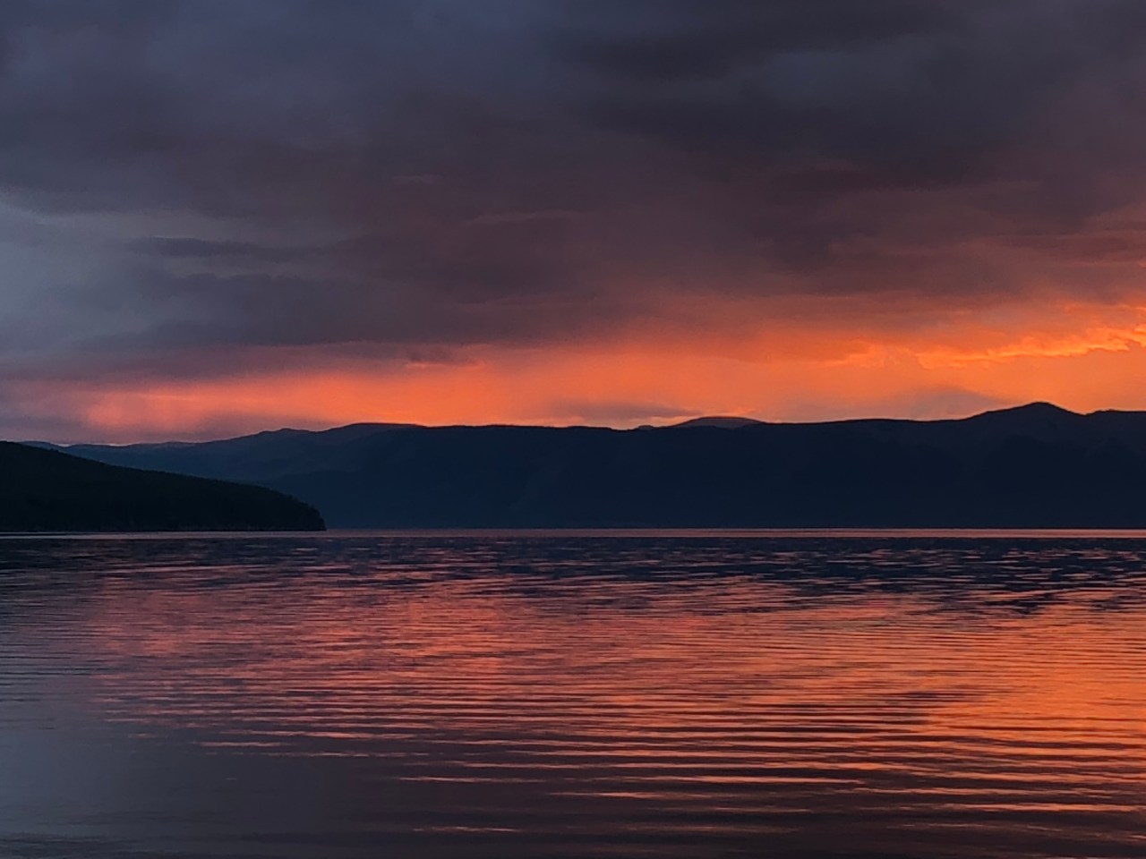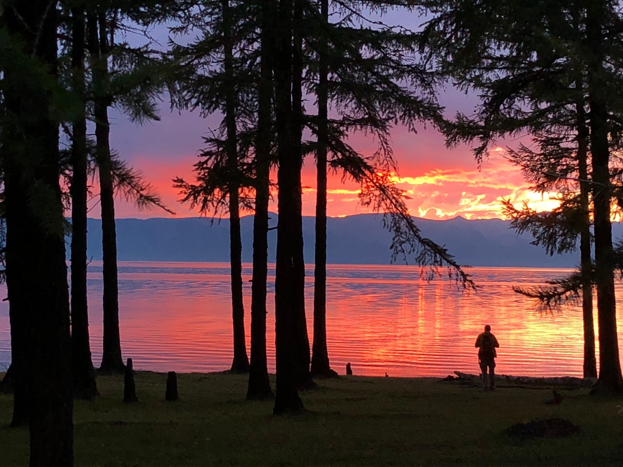 Je dois avouer que les moments les plus magiques furent les couchers de soleil se reflétant et se mirant dans le lac. Le lac était très calme, plat et sans remous. Le ciel devenait de plus en plus gris et le lac aussi. Puis il rosissait et prenait des teintes de plus en plus mauve, orange flamboyant. Le lac devenait gris acier, rose ou mauve reflétant les états du soleil et du ciel. Le clapotis des vagues, tapant légèrement les surfaces des galets, donnait un son doucereux, reposant et calmant. Une méditation et une contemplation de cette nature ravissait mon esprit et me faisait glisser dans un plaisir transcendant. Je n’étais plus moi-même, j’étais le lac, le coucher du soleil et la nature m’enveloppait, m’envahisait et me ravissait. On aurait cru que la nature, dans toute sa splendeur, étendait ses bras pour me recouvrir de toute la beauté du monde et me faire partager cet instant miraculeux. Ces moments, avant d’aller se coucher, étaient incroyables et une impression de déjà vu au Baïkal me surprenait et m’enchantait à nouveau.