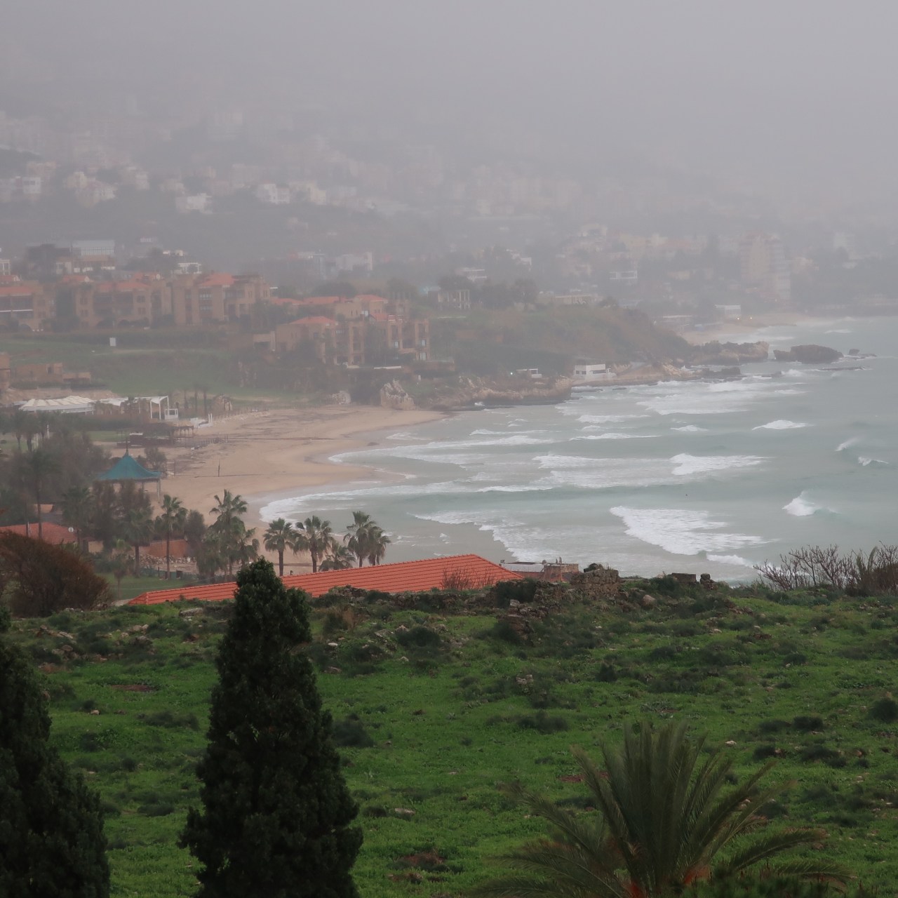 Le soleil qui irradiait Beyrouth s’est transformé en pluie, brume et grisaille à Byblos. Avec le chauffeur de taxi nous faisons trois fois le tour du port et de la rue qui longe la citadelle tellement la pluie est forte et drue. Je me demande si je vais pouvoir sortir de la voiture et pouvoir m’imprégner du site. Et au bout du troisième tour, n’en pouvant plus, je me jette sous la pluie pour aller visiter la citadelle tant rêvée depuis quelque temps.