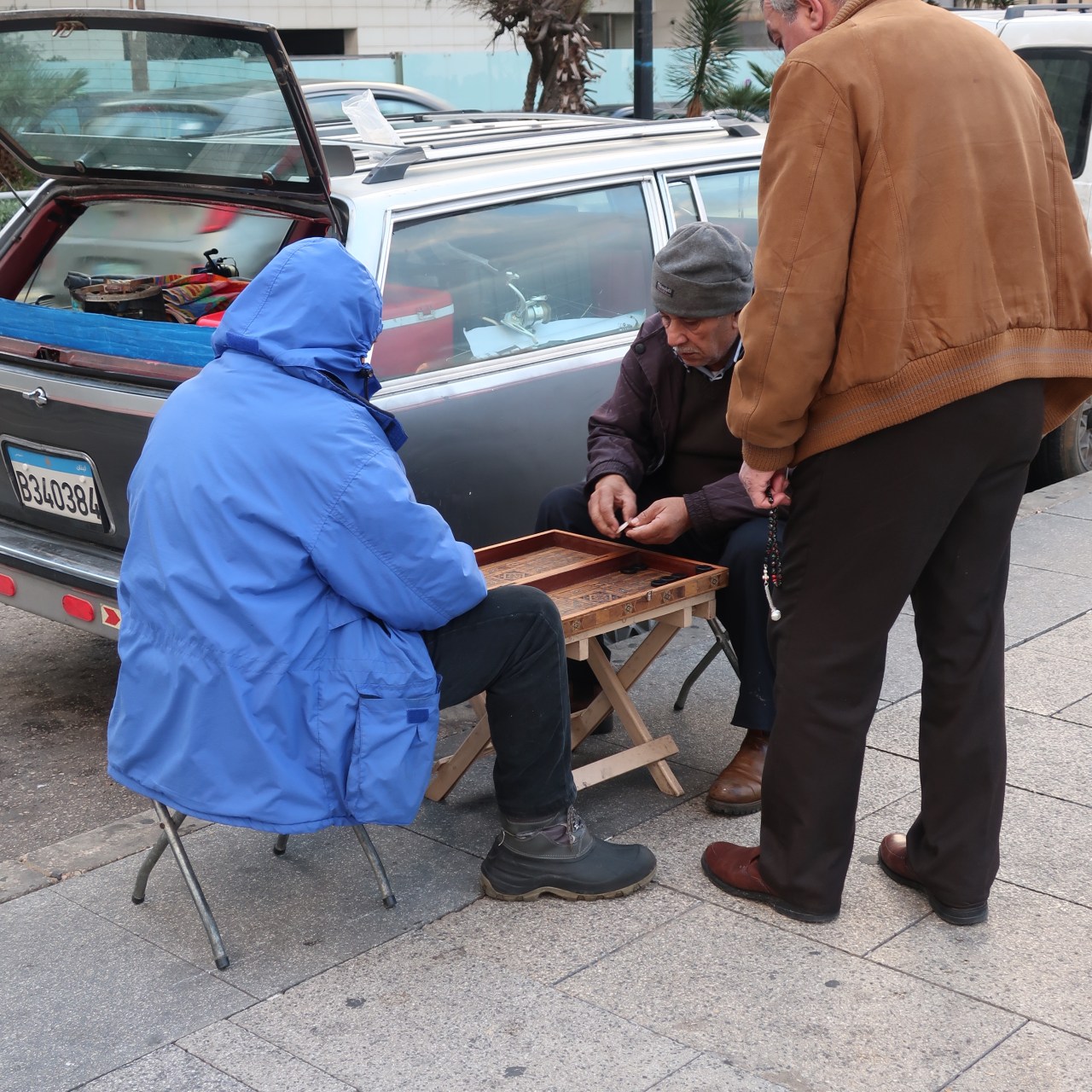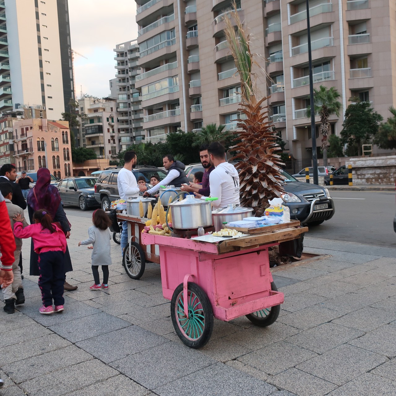 Et sur les trottoirs, c’est la vie beyrouthine qui vibre : les marchands de maïs et de sucreries passent et abordent les passants pour vanter et offrir leurs produits ; Les familles qui regardent et jouent sur les trottoirs ; Les passants flânent comme moi et lisent les cartes des restaurants en s’imaginant dedans ; Les familles jouent sur un échiquier ou un jeu de dames en grand à même le sol ; d’autres déjeunent sur les terrasses des cafés au soleil au pied des palmiers. Des hommes jouent au tric trac ou tout autre jeu de ce style. Ils sont assis près de leur voiture et sont concentrés ! Et puis les couples ou les amoureux se tiennent par la main et marchent en roucoulant des mots tendres et en s’embrassant. Les palmiers vous font comprendre que vous êtes dans un pays chauds et que l’été il doit faire bon être dessous.