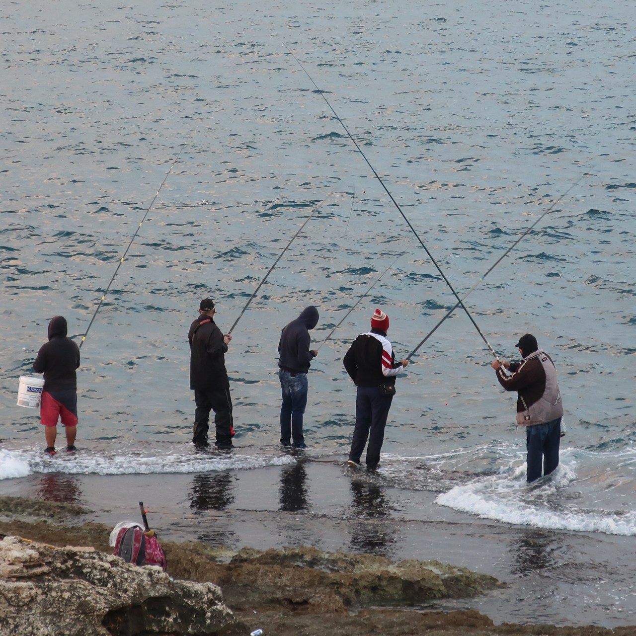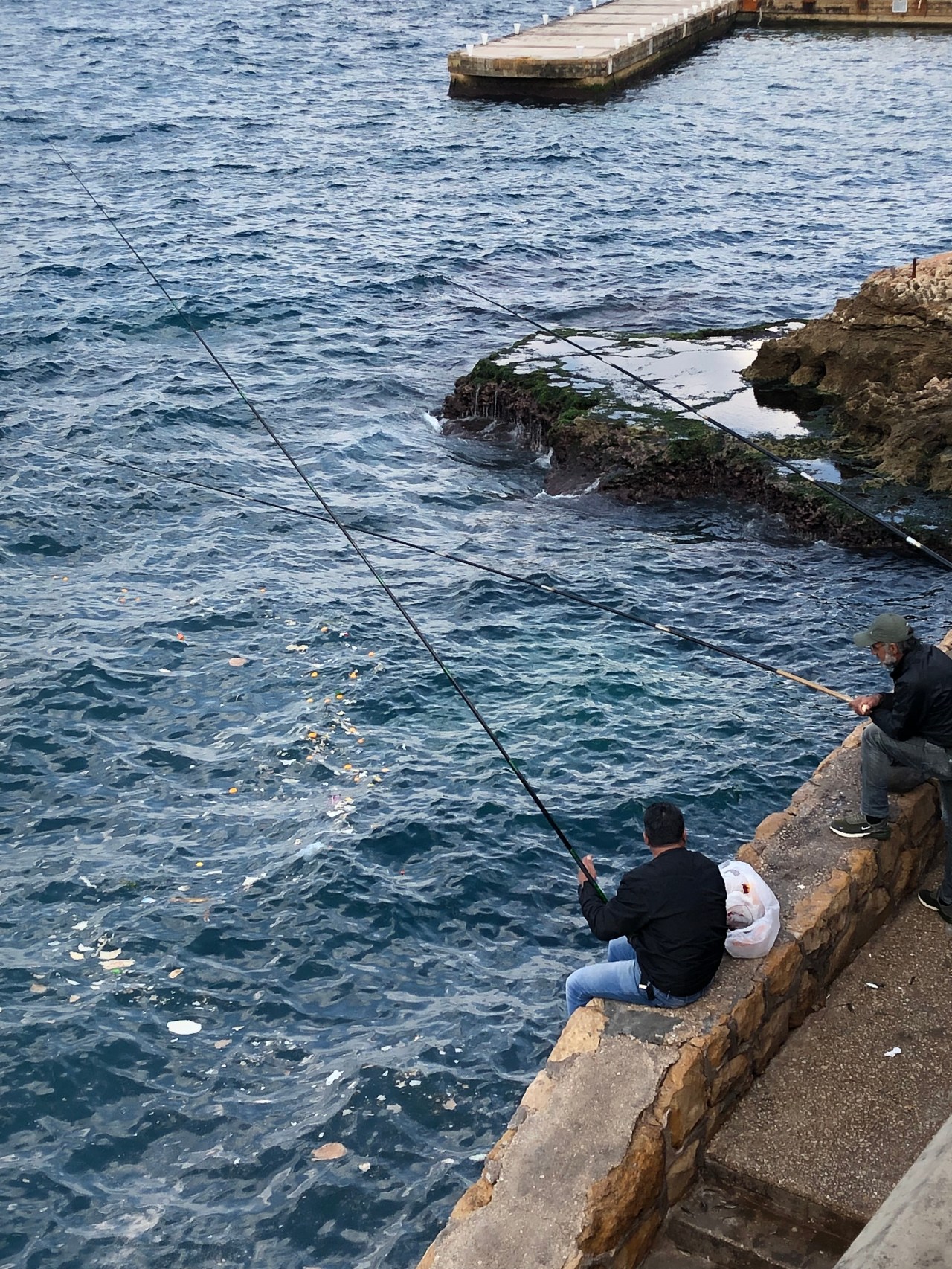 Puis c’est la découverte du bord de mer avec les pêcheurs du dimanche, qui avec leurs cannes à pêche rivalisent entre eux pour attraper des poissons – et là on se demande comment ils peuvent en attraper car la mer est insalubre, pleine de bouteilles en plastique, d’ordures de tout ordre ! Berk cela ne donne pas envie du tout ! Mais ils sont là très assidus et concentrés sur leurs proies. Les pieds dans l’eau sur les corniches et les falaises travaillées par l’érosion lorsque les vagues ont refluées. Ou bien certains pêchent et fument la chicha en regardant la mer. Cela demande de la concentration ! Et puis le bonheur est là ! Fumer, pêcher, respirer et se reposer !