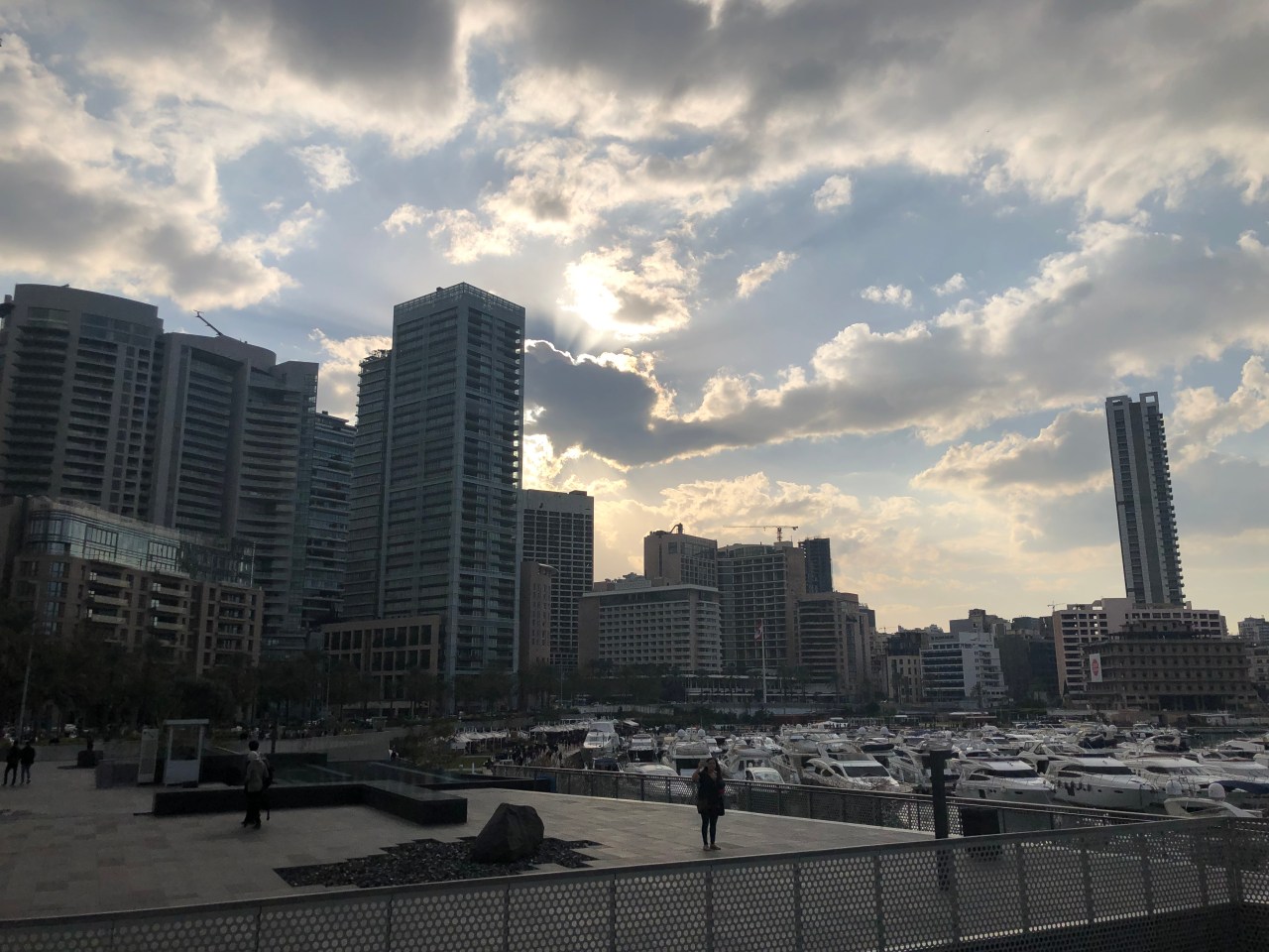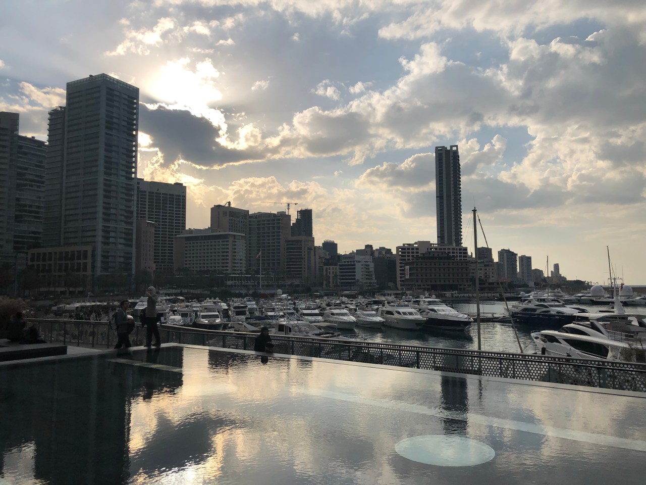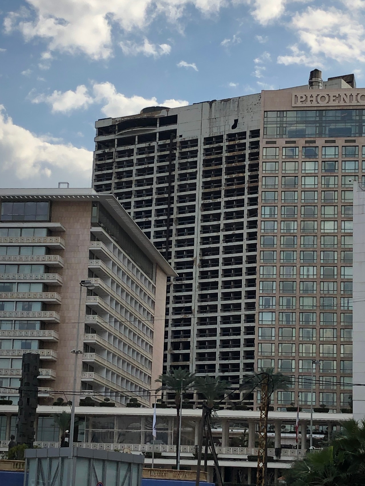 De là où on se trouve on peut aussi admirer : les bâtiments qui longent la marina et surtout apercevoir les dégâts de la guerre : l’ex-hôtel Holiday Inn bombardé pendant la guerre civile qui surplombe encore aujourd’hui l’hôtel Phoenicia ! Triste beauté, d’un temps passé et révolu, mais qui est là, comme le gardien des mémoires qui fuient le souvenirs de terribles moments ! Planté là il regarde le temps qui passe, les bâtiments hyper modernes qui rodent autour de lui et cherchent à l’encercler et le faire disparaître. Mais que nenni il est toujours là à trôner et défier l’histoire de la ville.