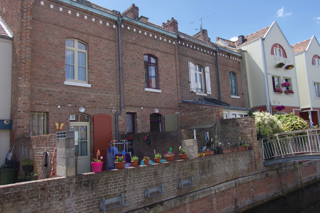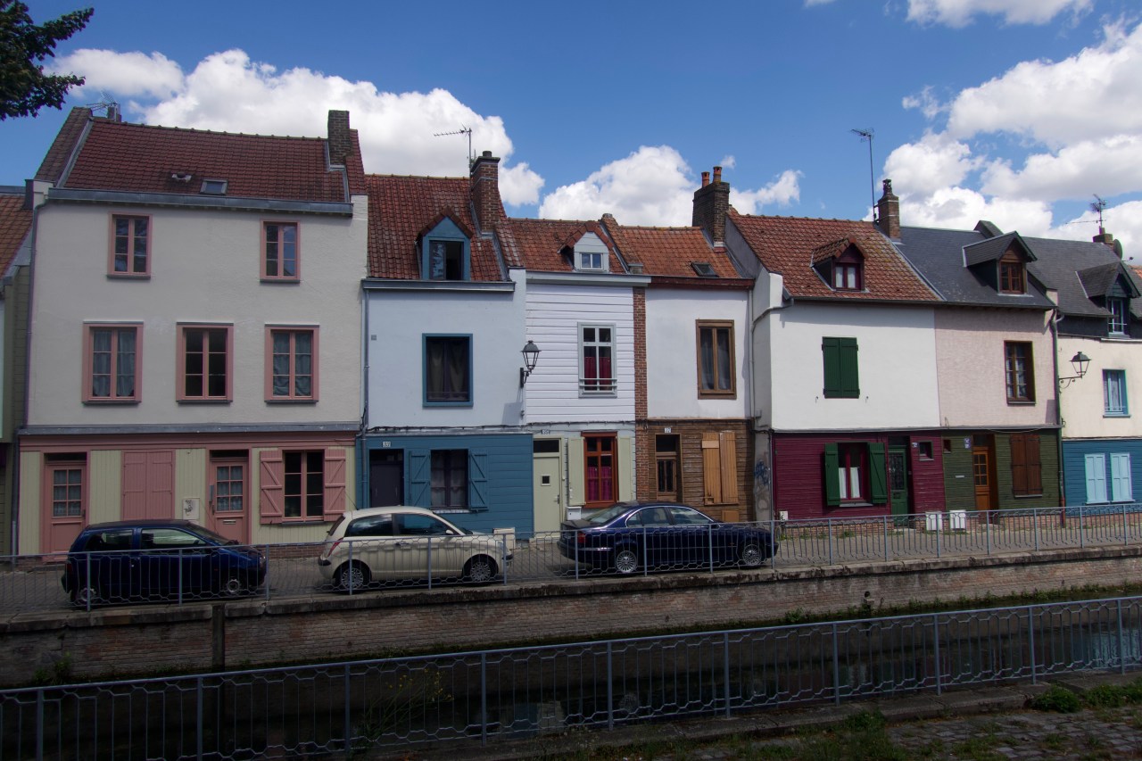 Des maisons à colombages font leur apparition le long du quai. Les nuages se mirent dans la Somme. Et puis en longeant le canal on découvre les arrière-cours des maisons de briques. Des pots de fleurs ornent les rebords et les murets.