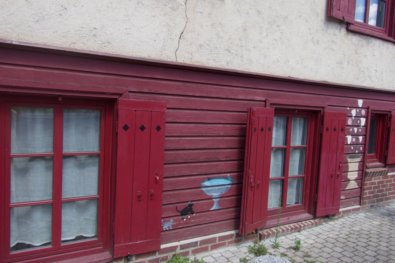Dans certaines fenêtres, les vitres reflètent les nuages qui passent et les pots de fleurs remplis de géraniums barrent la vue des habitants et les protègent des visiteurs. Les fenêtres sont aussi ornées – maisonnettes en bois blanc (peut-être un mini abri pour les oiseaux ?) ou bien les bas des murs peints avec des chats qui se rapprochent dangereusement des oiseaux qui boivent à la fontaine. Et un peu plus loin un joli pot de fleurs d’arums blancs et de roses sont une jolie surprise.