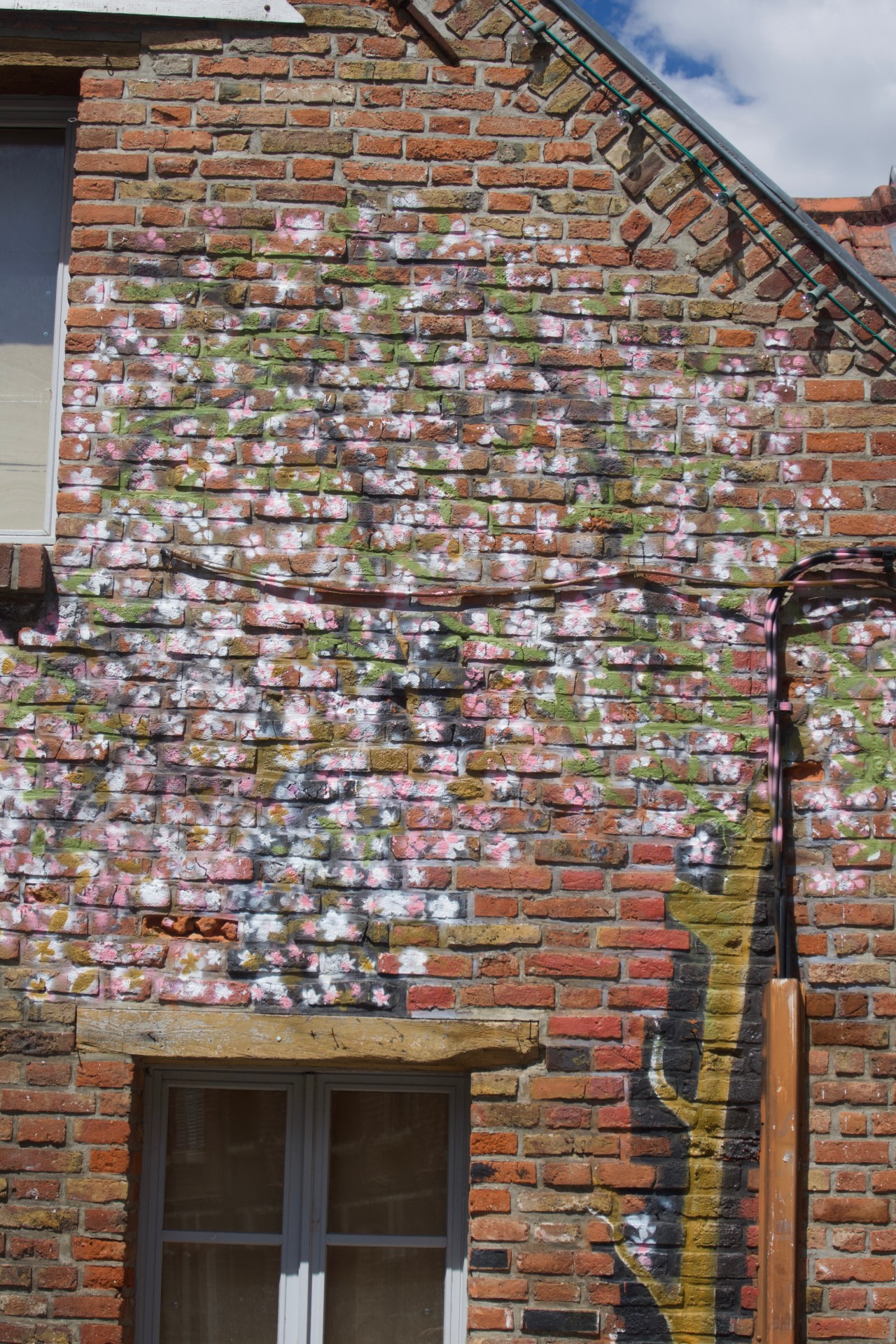 Et puis la fantaisie fait son apparition avec des fenêtres fermées par du Street-Art qui pour moi représentent des phares posés sur des colonnes grecques avec une soupière les recouvrant – ceci sur six étages. Amusant ! La porte est identique et accentue l’étrangeté de cette peinture. Puis au coin d’une petite place un arbre – cerisier en fleurs peint trône et donne de la gaieté à ce lieu. Imprévisible et charmant.
