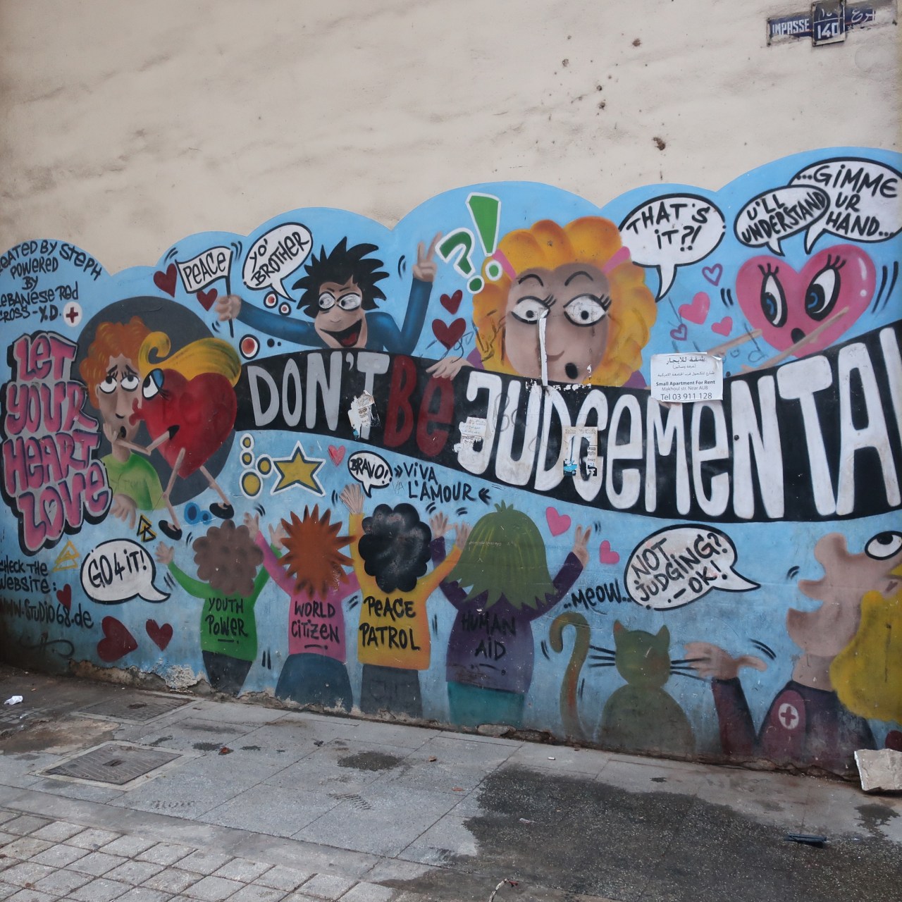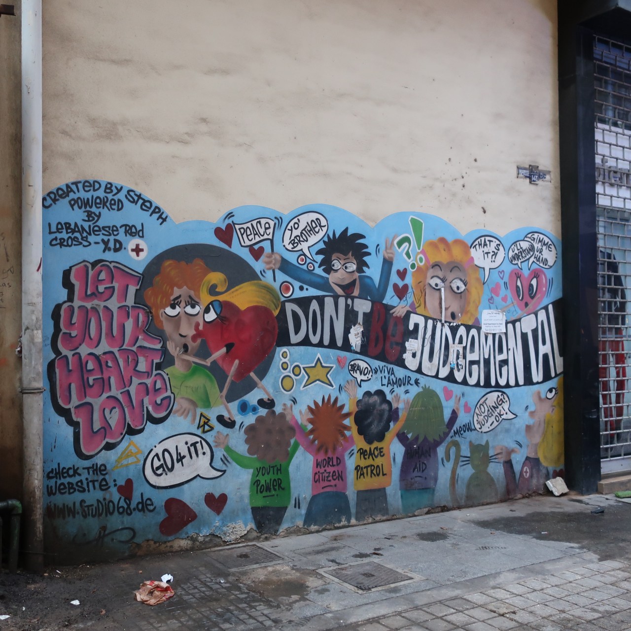 Dans la rue de mon hôtel un mur avait un slogan : Plein de cœurs ornaient ce mur et de personnages différents ! Vive l’amour et la tolérance ! Pas de jugements ! C’est un peu le « peace and love » libanais ! Il a été créé par la croix rouge libanaise. Je comprends mieux en le regardant de plus près.