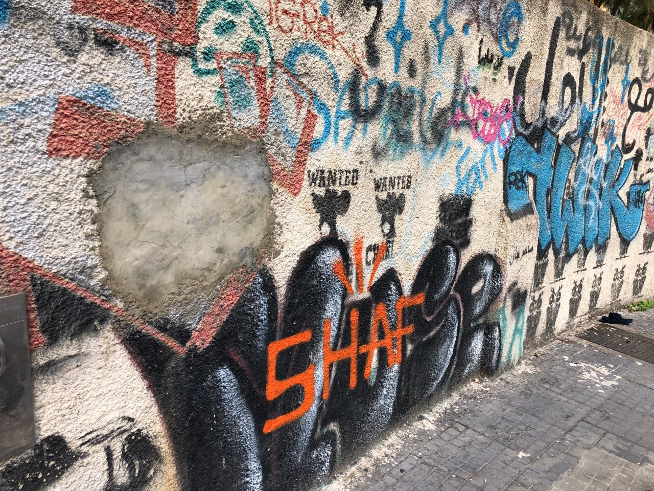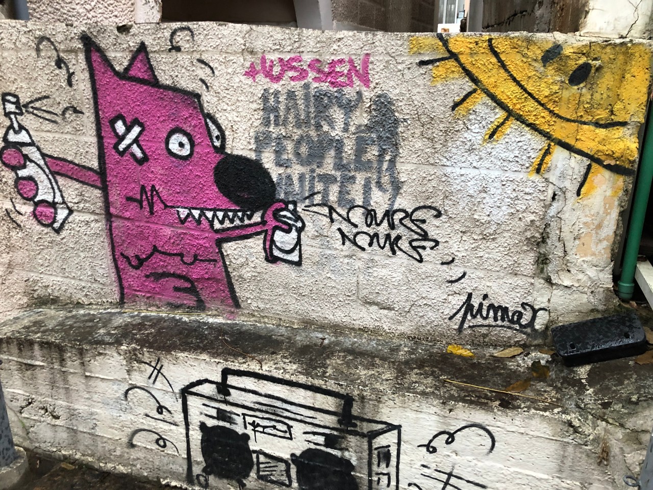 En bas de l’escalier Saint-Nicolas, dans le quartier Sursock, escalier qui descend dans la rue Gouraud en contre-bas, se trouve un certain nombre de dessins Street Art. L’un d’eux m’a fait penser à un chien mauve déjà rencontré soit à Barcelone soit à Manchester !