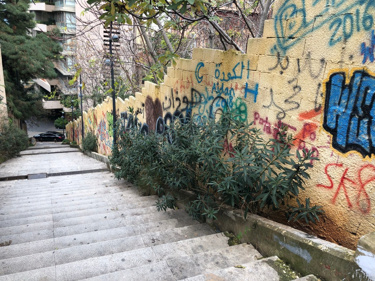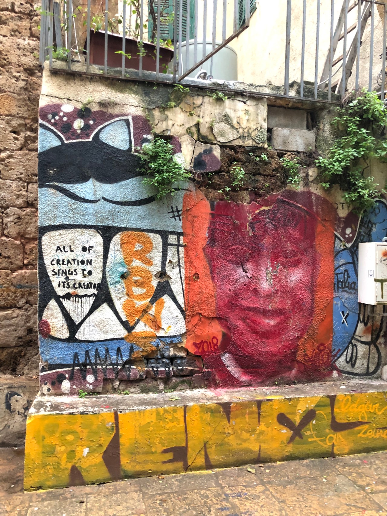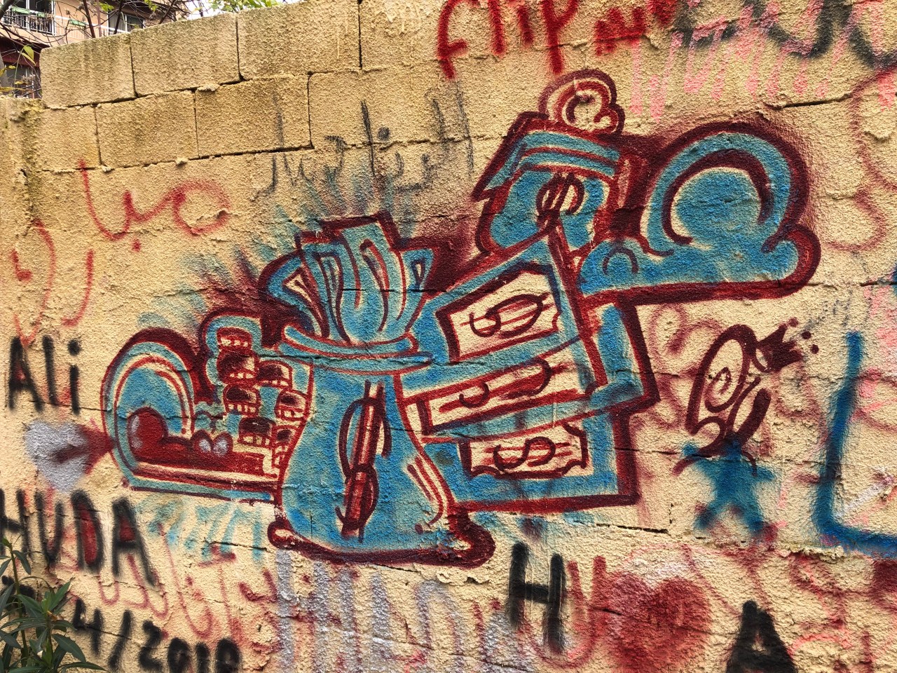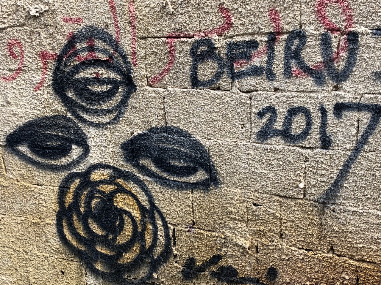 Tout d’abord dans une rue proche de l’université américaine de Beyrouth AUB le slogan Beitu 2017 avec un personnage à trois yeux (peut-être les différentes communautés religieuses) et la fleur à la place de la bouche et du nez. J’ai adoré cette image de Beyrouth et elle reste mon slogan beyrouthin.