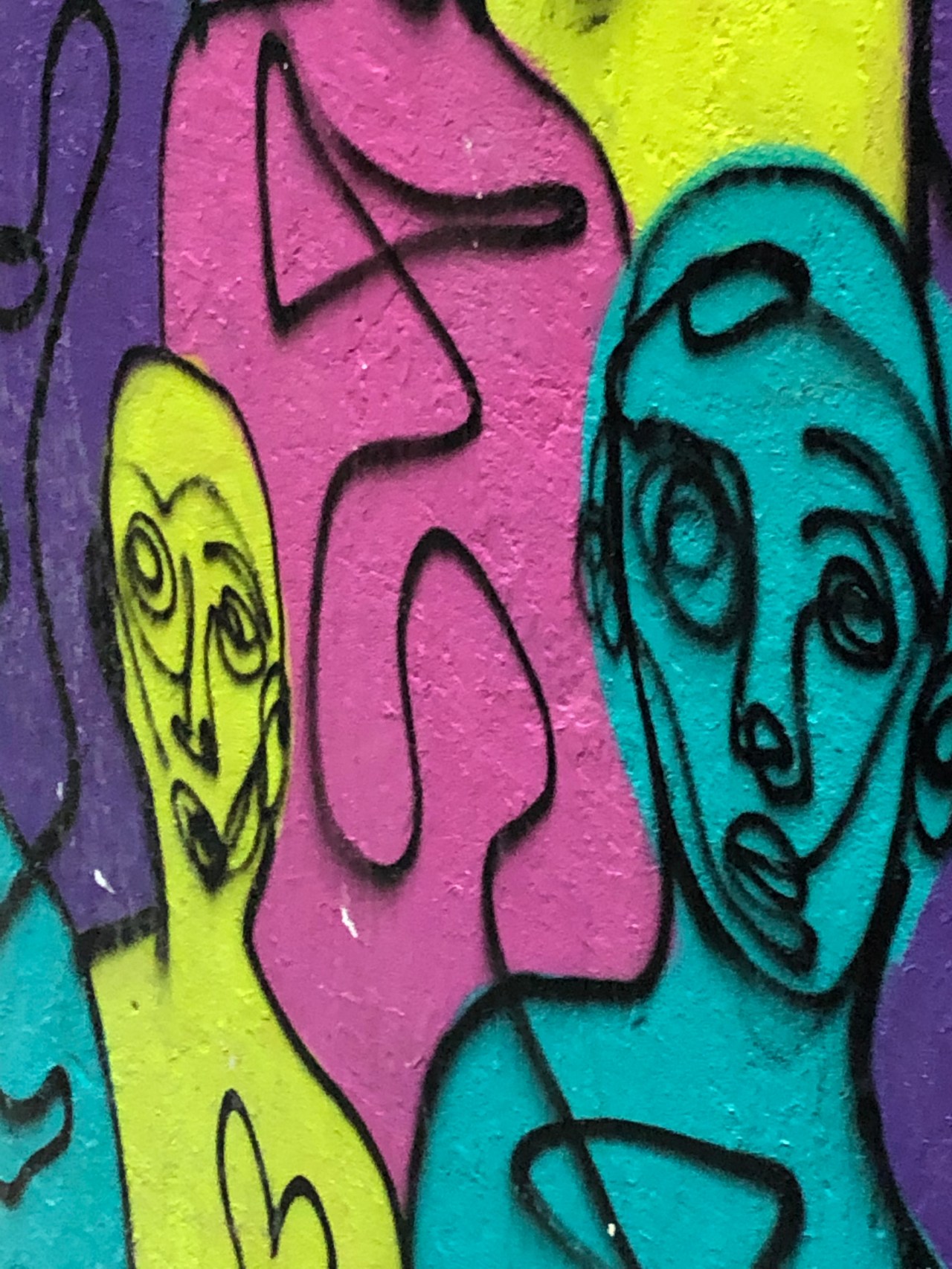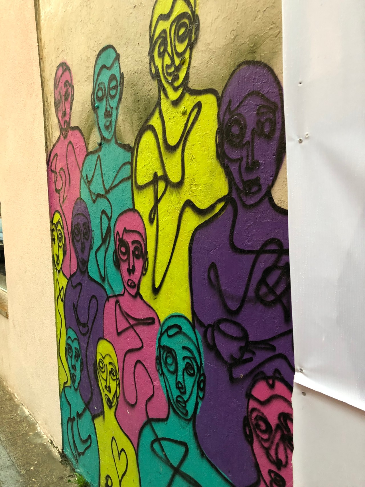 J’ai adoré celles de la rue Gouraud avec ses personnages debout de couleurs différentes, flashis, roses, verts, mauve foncé, bleu turquoise jaune dignes représentants de notre humanité des hommes qui constituent notre monde. L’un d’eux en jaune avait un joli cœur.
