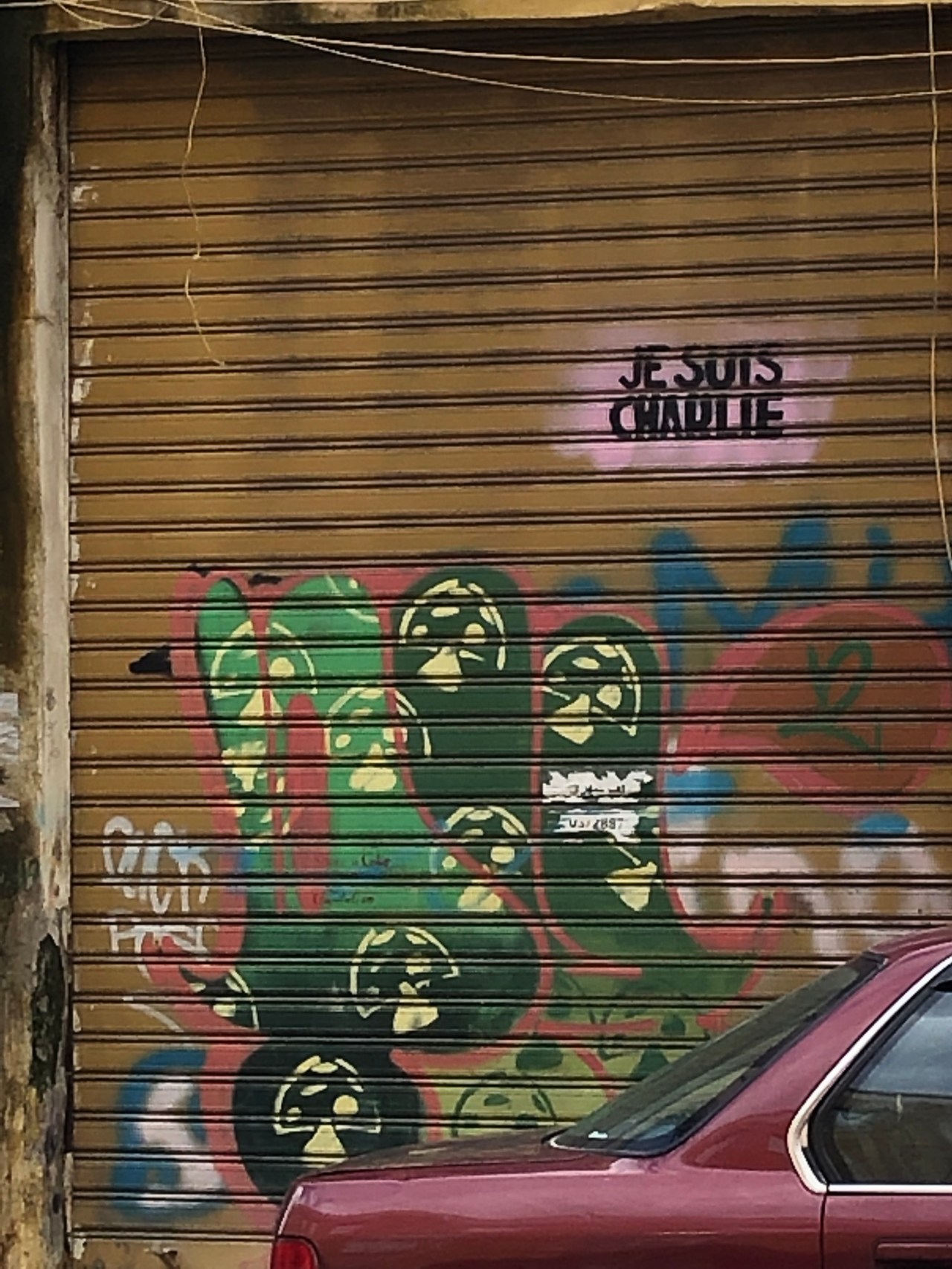Proche de l’université américaine de Beyrouth beaucoup de murs étaient peints. Celui des « wanted » noirs en forme de burkas m’a amusé ou bien les sortes de matriochkas vertes et jaunes sorte de champignons sur une forme m’ont laissé rêveuse. Au-dessus il y avait « Je suis Charlie » en mémoire aux journalistes assassinés à Paris il y a déjà 4 ans.