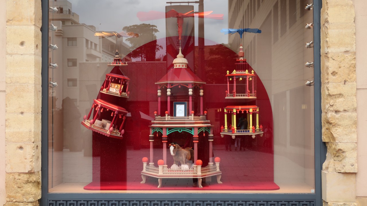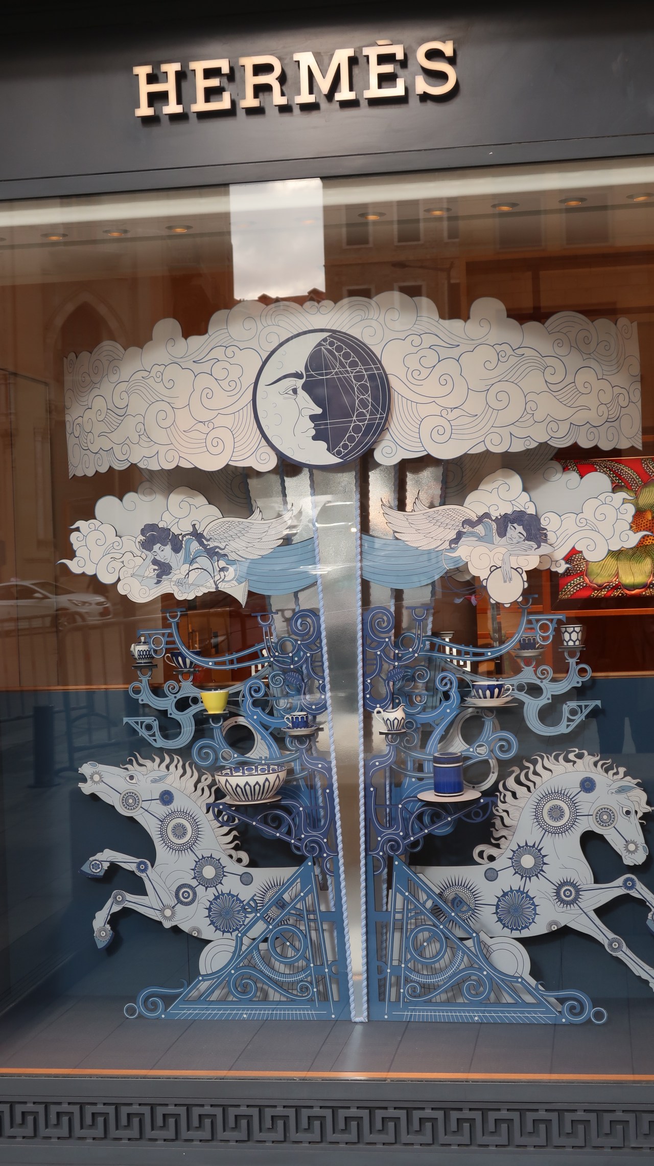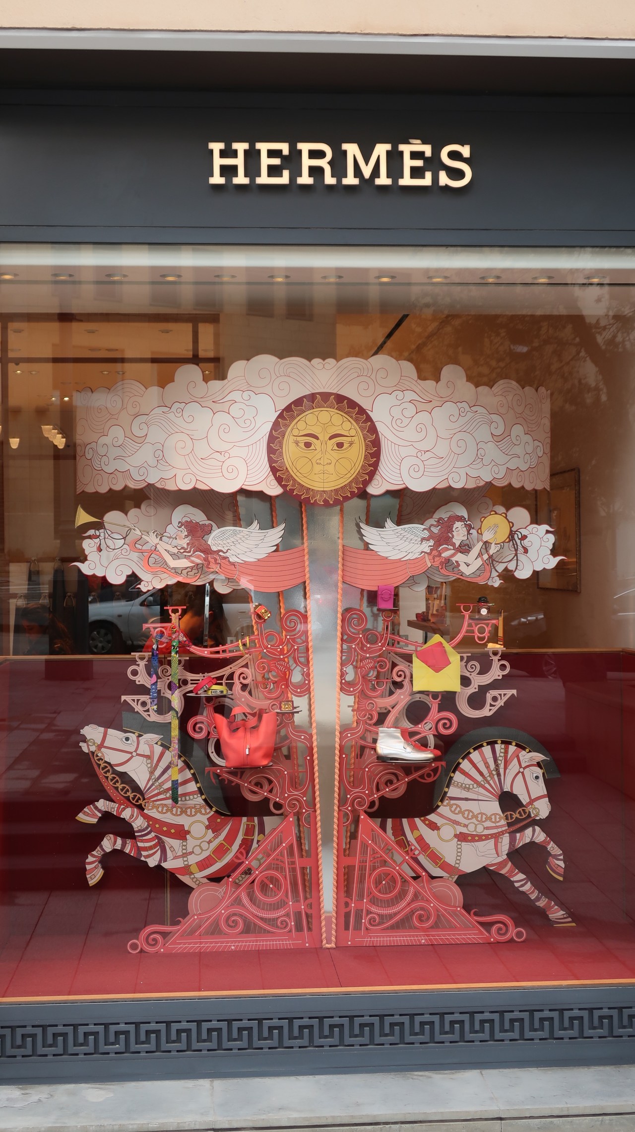 – Hermès avec ses vitrines si belles que l’on se croirait dans un musée de couleurs, de réalisations abracadabrantes pour nous faire rêver ! Ainsi les couleurs étaient rouge ou bleu sur le ton d’un tourniquet de chevaux ; Et puis les foulards constitutifs de la marque avec les guépards sur fond rouge ou les chevaux et la sellerie – création de cette marque emblématique. Et le cirque à étages, volant avec son hélice sur haut de l’édifice et ses chevaux au centre de la piste ! Du rêve, du rêve et du rêve !