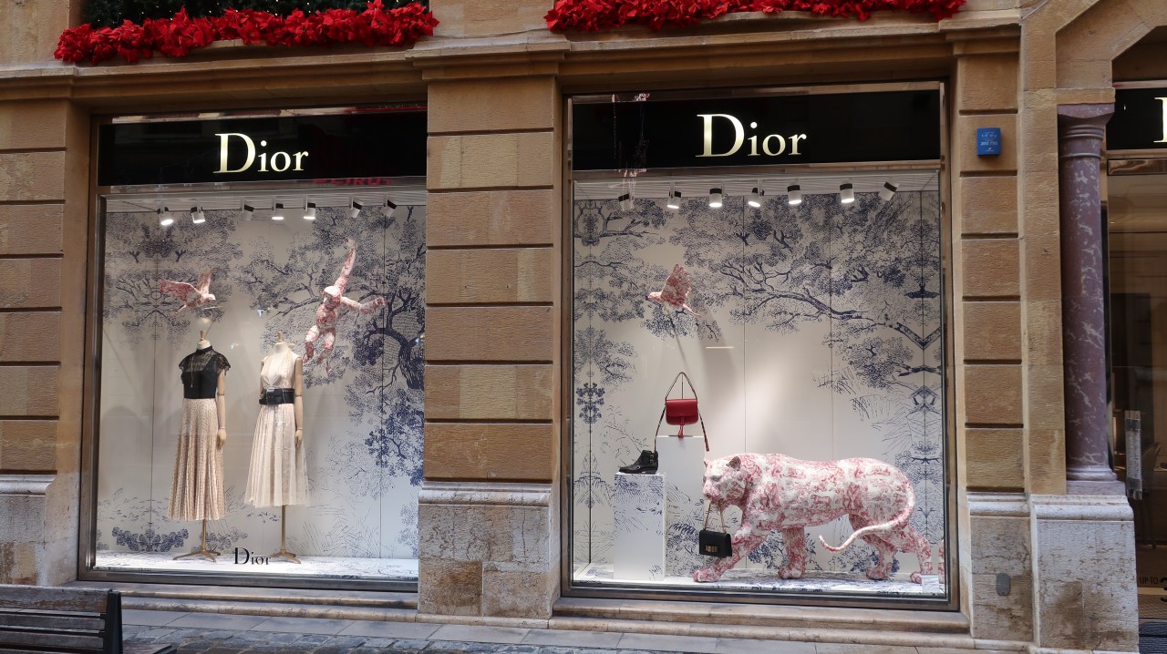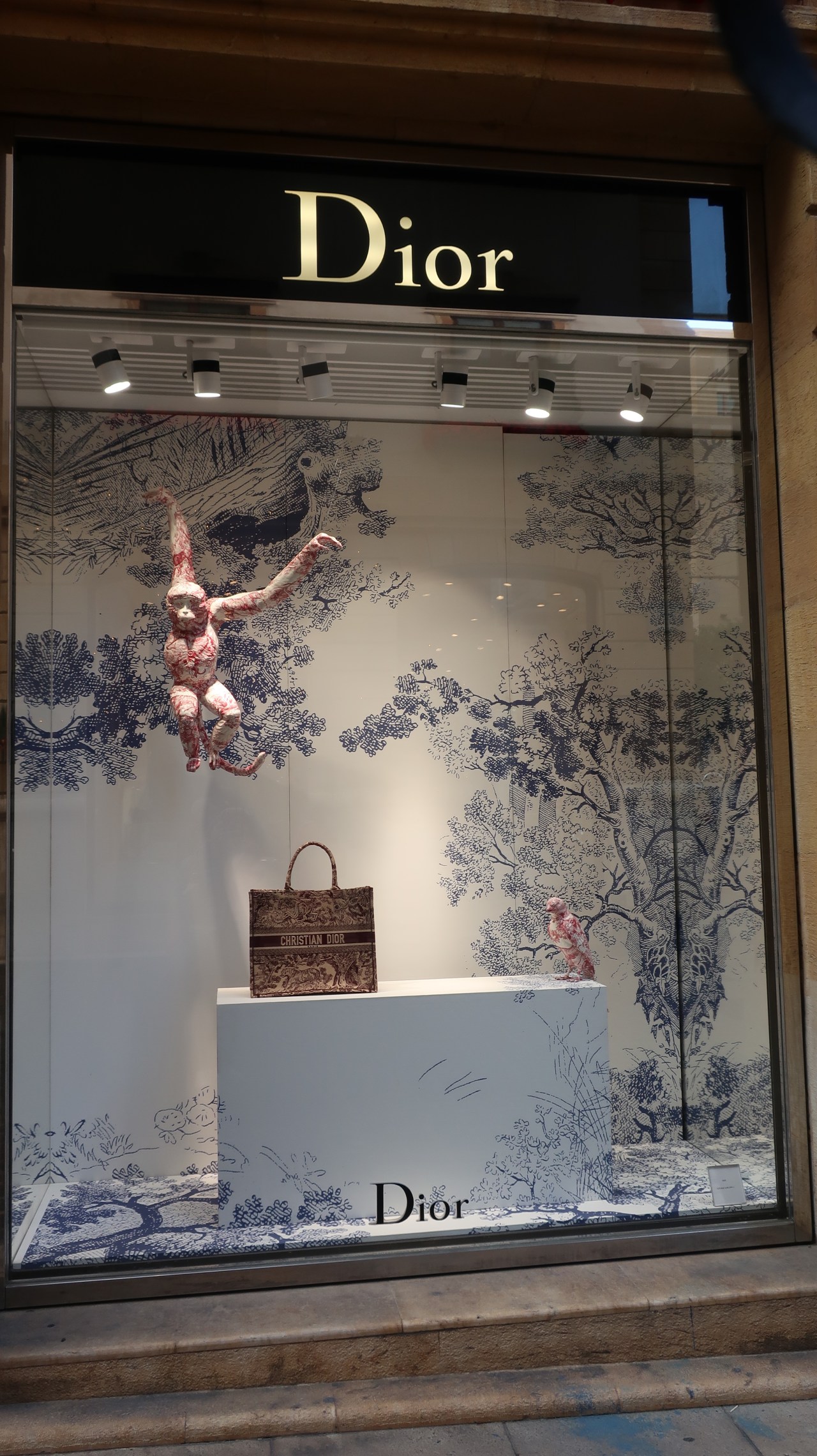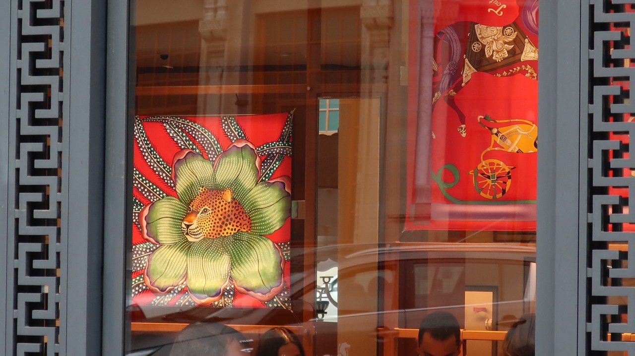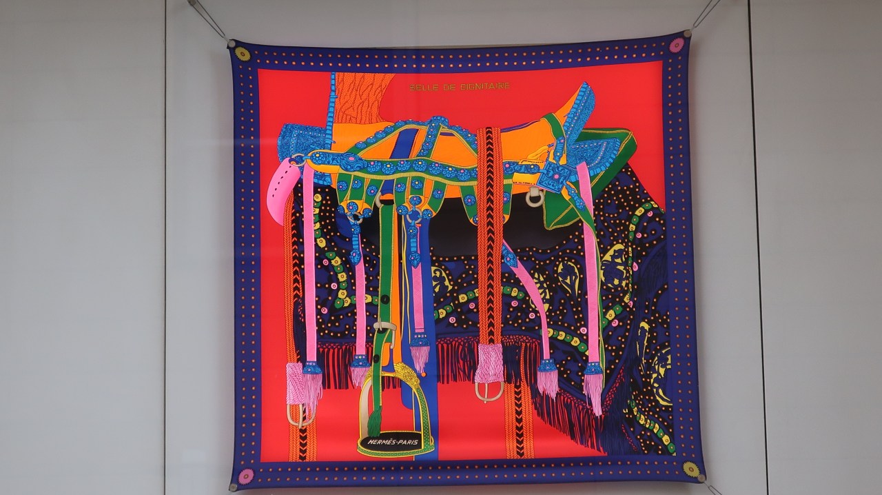 – Hermès avec ses vitrines si belles que l’on se croirait dans un musée de couleurs, de réalisations abracadabrantes pour nous faire rêver ! Ainsi les couleurs étaient rouge ou bleu sur le ton d’un tourniquet de chevaux ; Et puis les foulards constitutifs de la marque avec les guépards sur fond rouge ou les chevaux et la sellerie – création de cette marque emblématique. Et le cirque à étages, volant avec son hélice sur haut de l’édifice et ses chevaux au centre de la piste ! Du rêve, du rêve et du rêve !