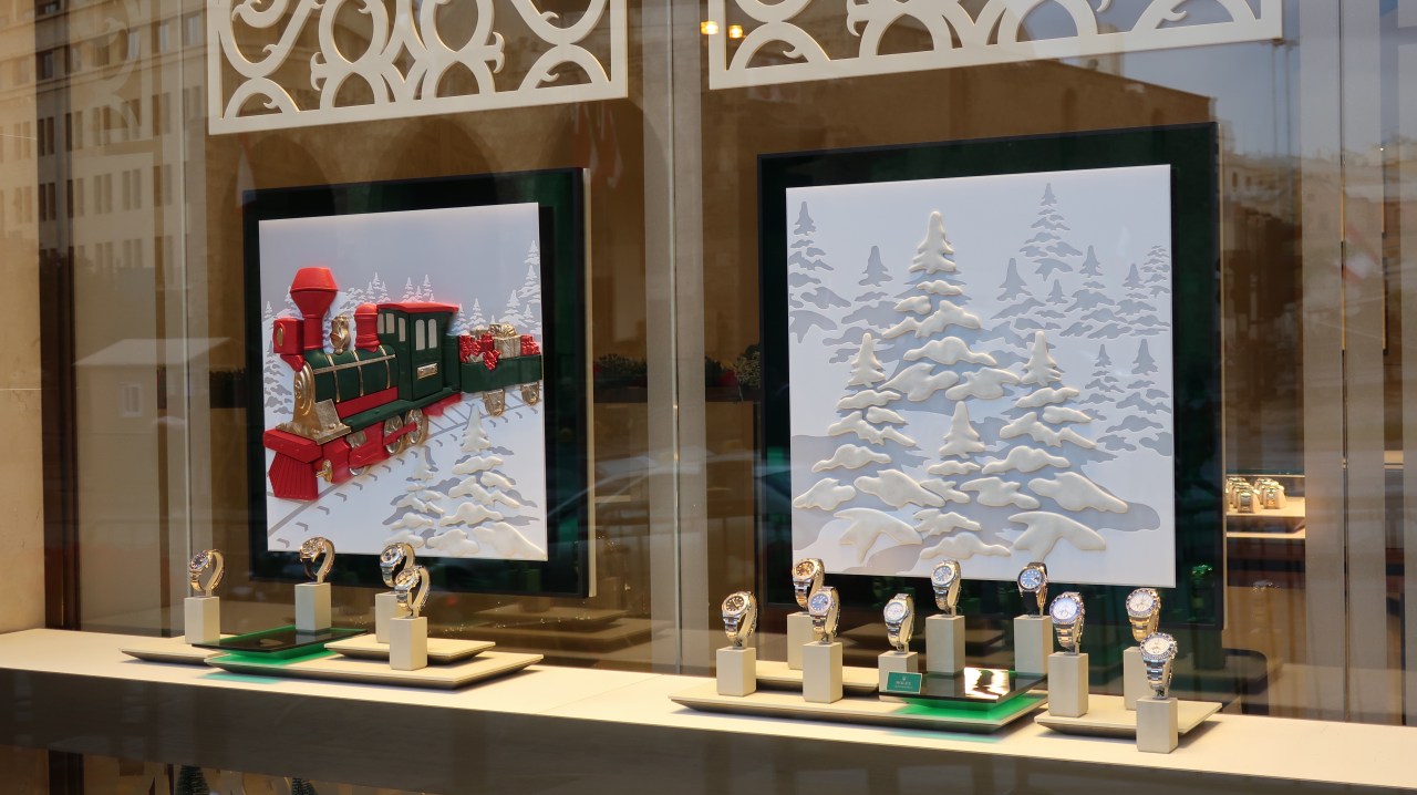 – La vitrine Rolex avec son chemin de fer et son train de rouge et de vert vêtu et les sapins de Noël tous blancs….
